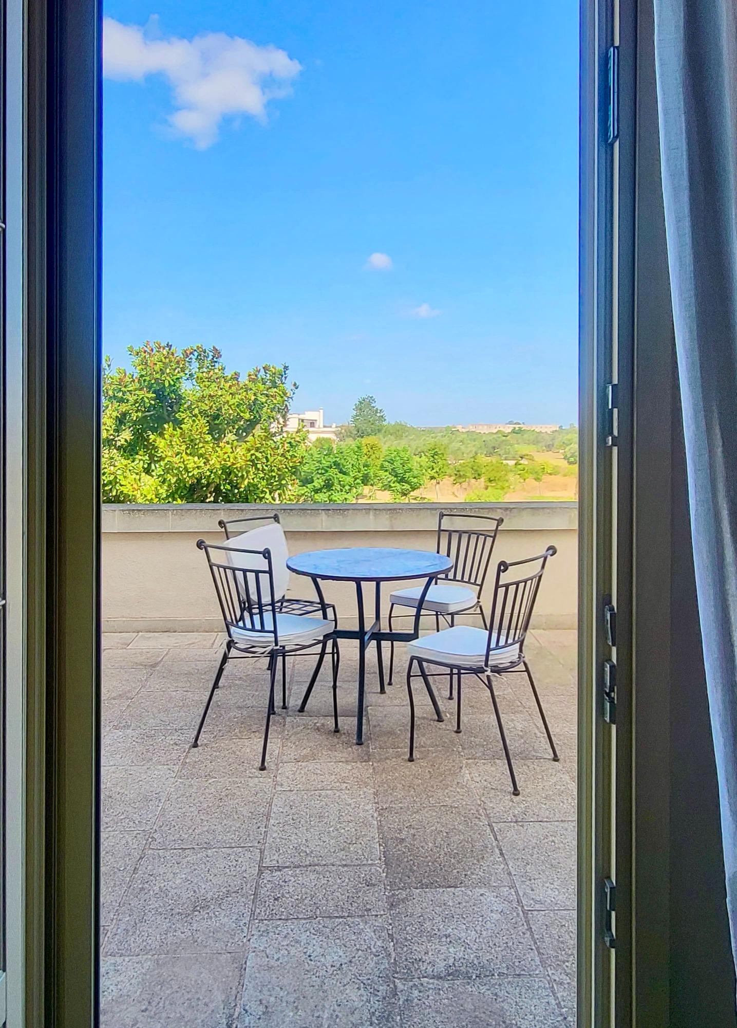 Deluxe room with double bed, private bathroom, and exclusive access to the spacious terrace, perfect for enjoying the panoramic views in total relaxation.
