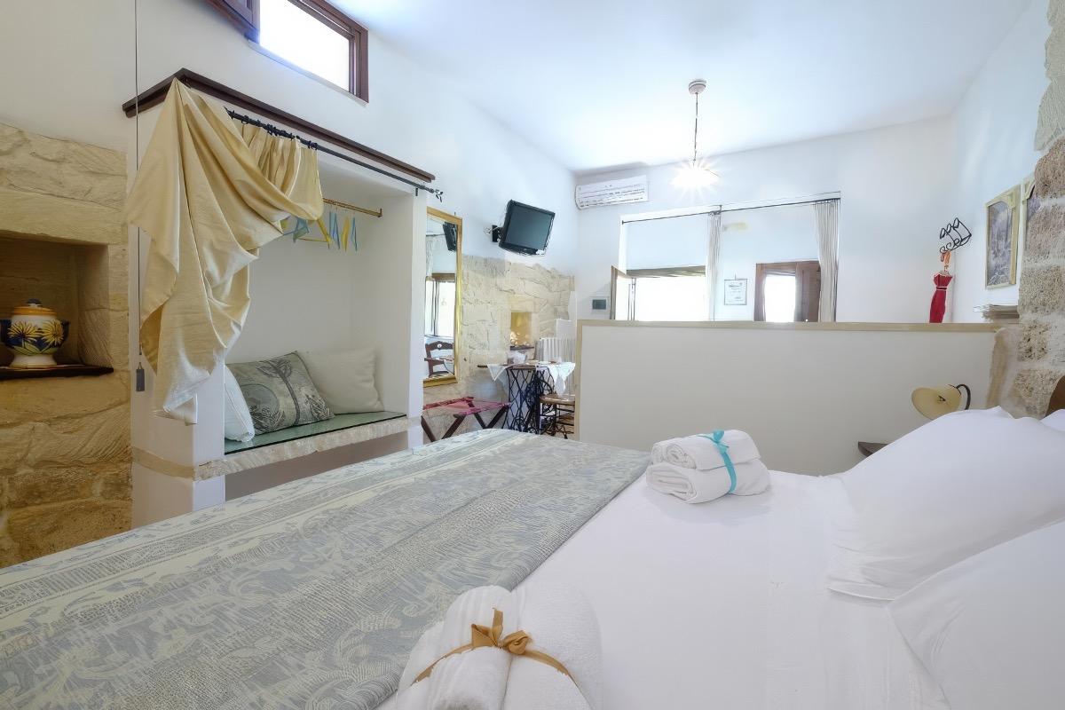 Recently transformed into a cozy Bed & Breakfast, it offers three independent rooms, equipped with all comforts, surrounded by a beautiful well-kept garden, spread over 20,000 square meters, among ancient olive trees and wheat fields. The rooms are located in front of the main house, where Leo and Lina's family resides and warmly welcomes you to serve delicious breakfasts, accompanied by a typical family atmosphere.