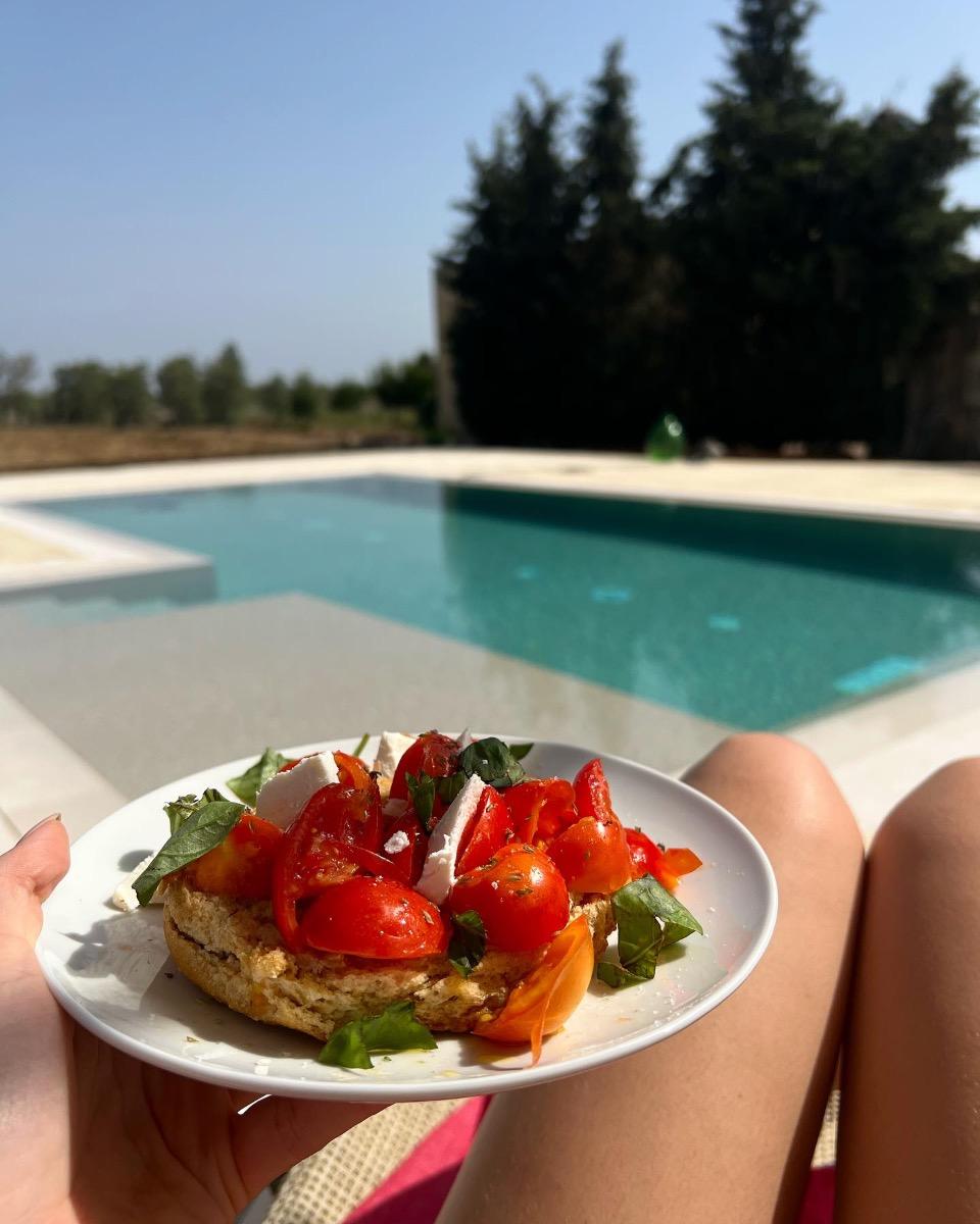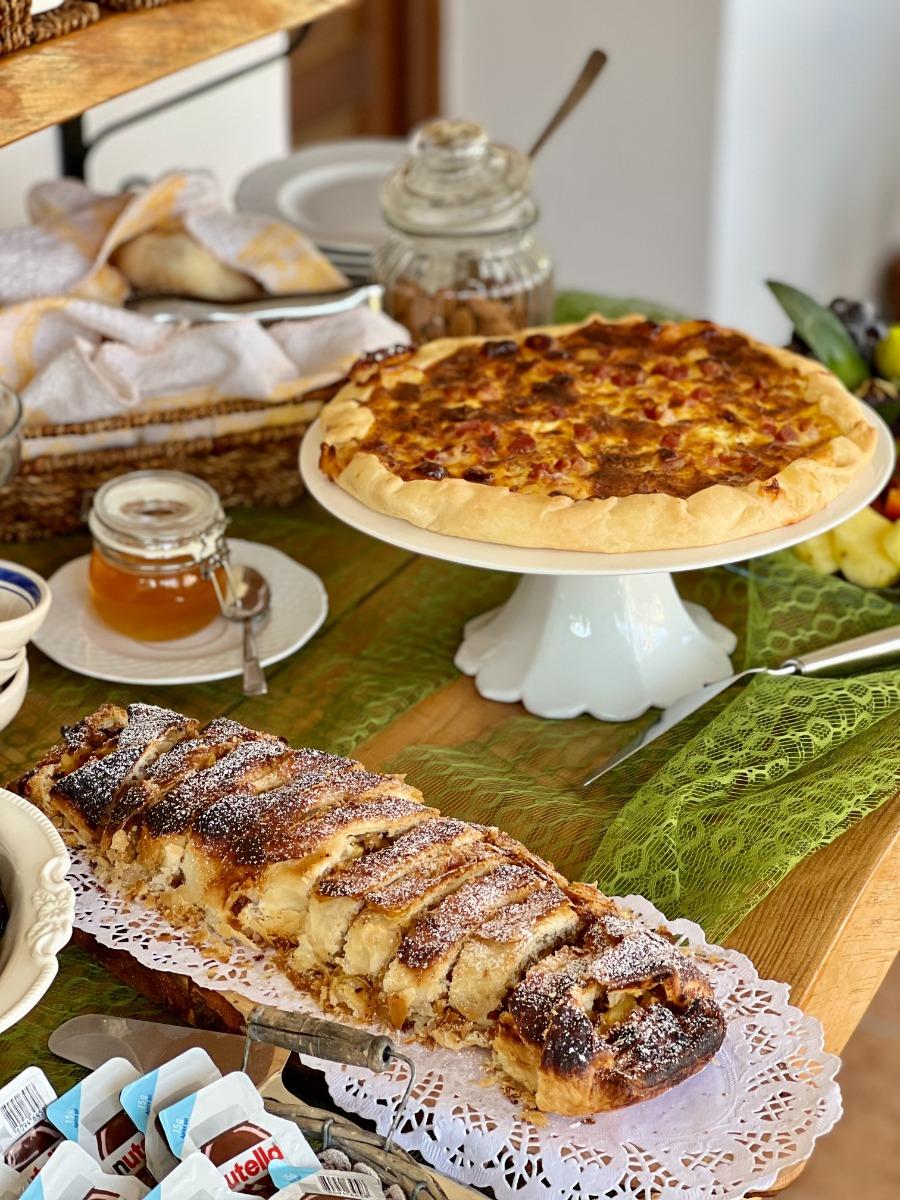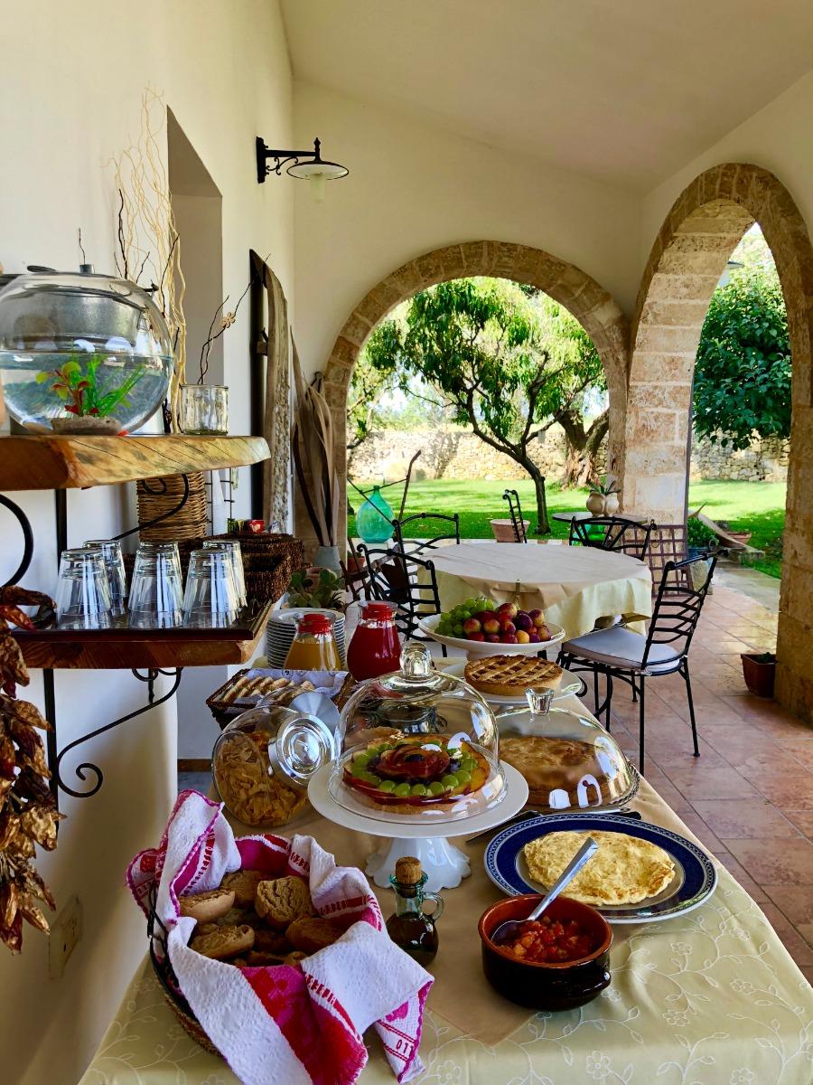 We offer a delightful selection of homemade sweets and cookies, as well as jams made with love using the fruit from our garden: plums, oranges, figs, strawberries, peaches, and much more. You can also enjoy fresh seasonal fruit, ricotta, and yogurt from the nearby Masseria Padulano. To accompany it all, you will find local bread, puccette, focaccia, and friselle. Fresh orange juice, honey from our own production, dried figs, omelettes, and soft-boiled eggs will not be missing.