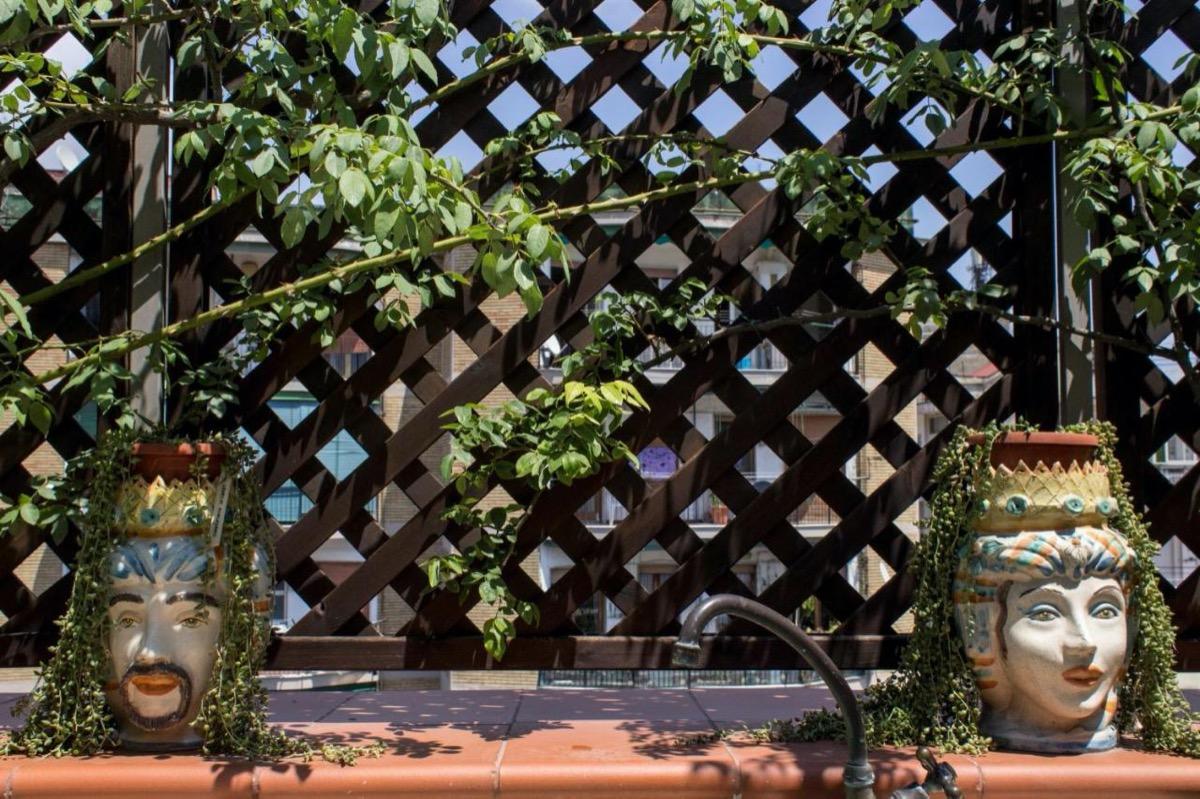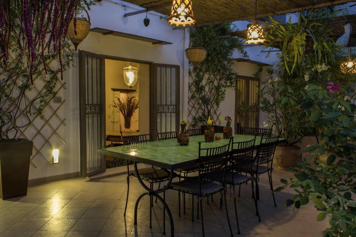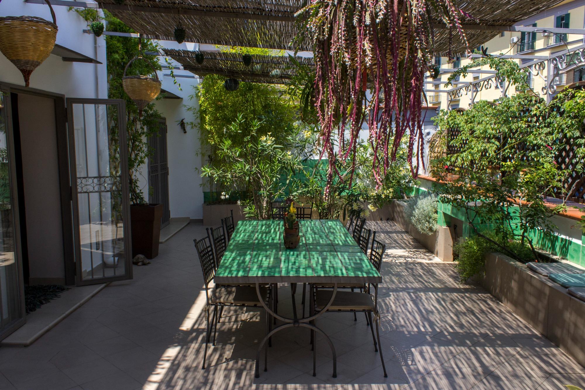 On the breath taking terrace, majolica tables sit under a straw canopy; terracotta jars, planters, small vases and Sicilian ceramics bring Mediterranean essences together, along with aromatic jasmine and ancient roses. In the background there is the murmur of a small enchanting majolica fountain which evokes relaxation before and after a dip in the populous life of Naples below.