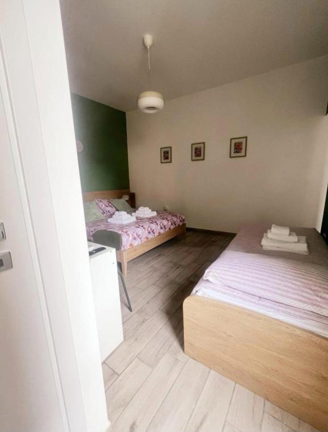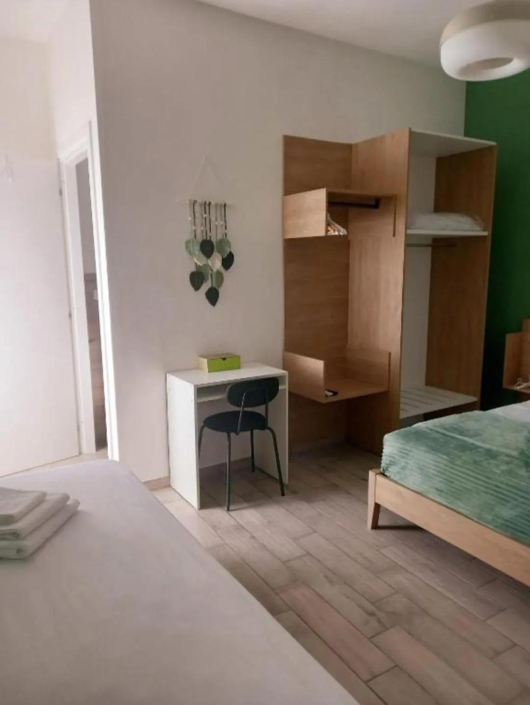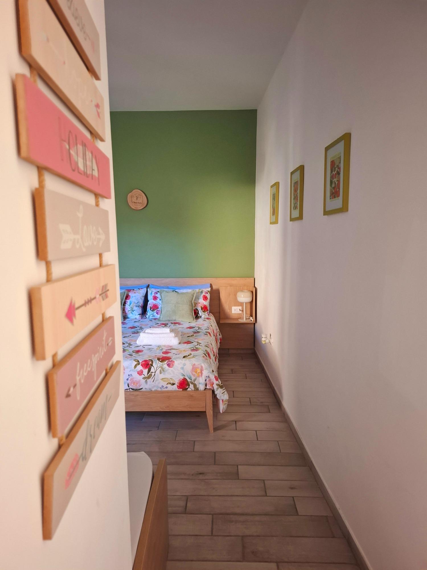 L'intérieur est décoré avec simplicité et élégance, dans des tons naturels et avec des éléments en bois qui rappellent l'atmosphère apaisante du parc voisin. L'appartement, d'environ 30 mètres carrés, comprend une chambre avec un lit double et un lit simple, une salle de bain moderne avec douche, et une cuisine pratique, équipée pour des séjours autonomes.