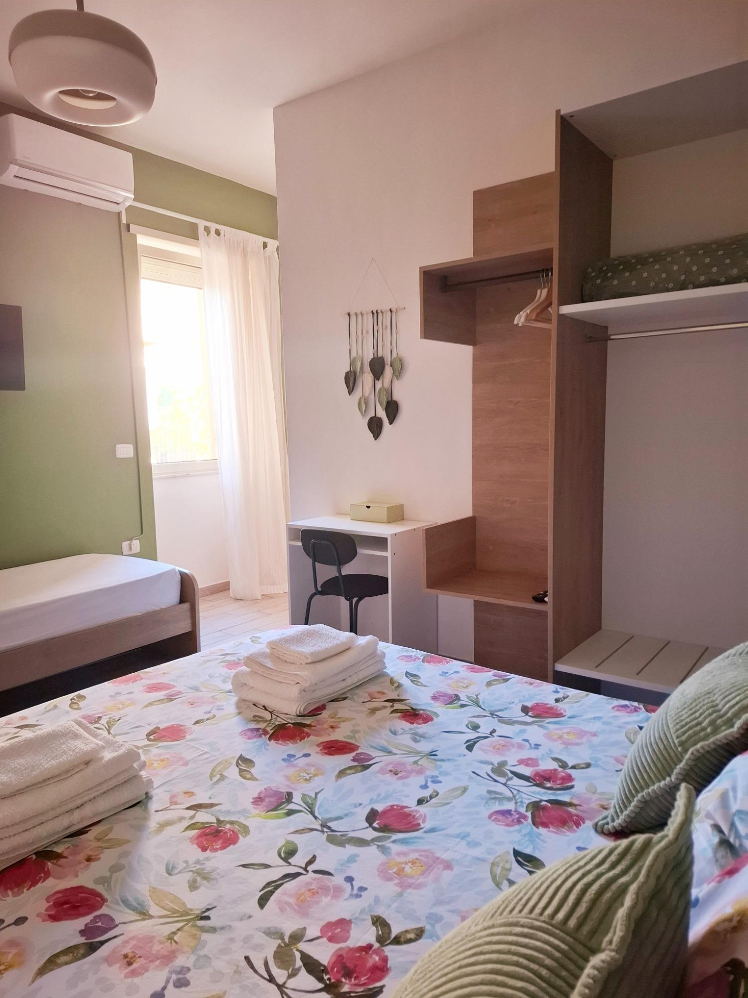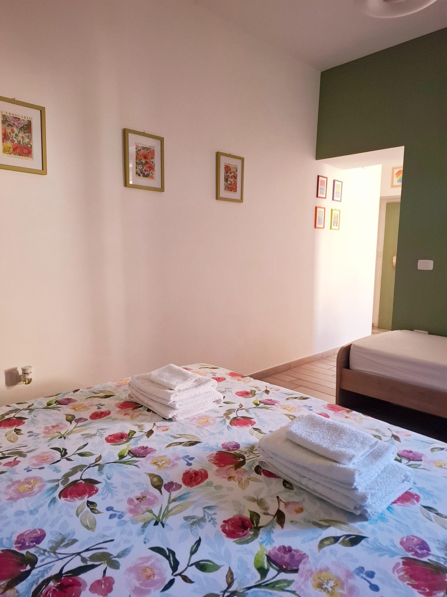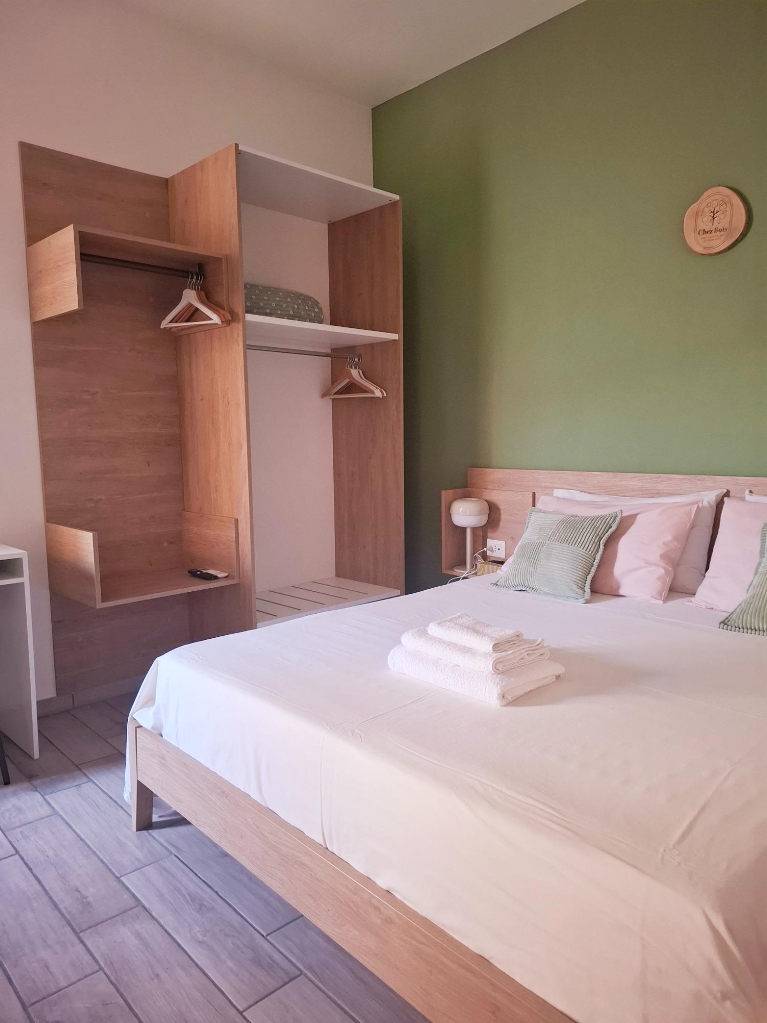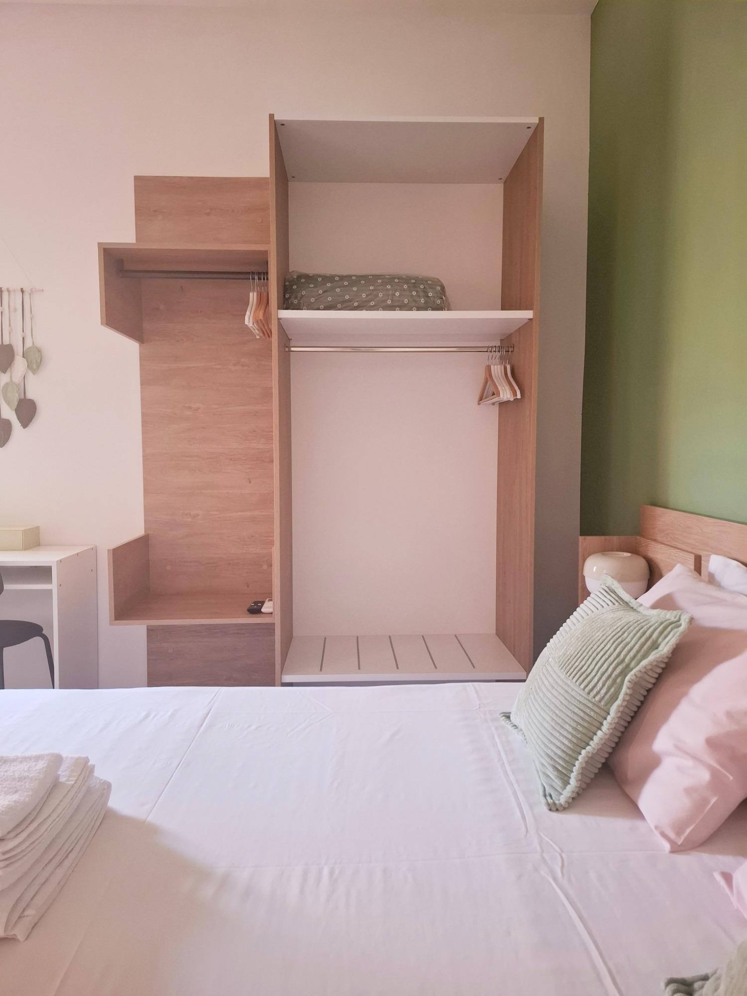 L'intérieur est décoré avec simplicité et élégance, dans des tons naturels et avec des éléments en bois qui rappellent l'atmosphère apaisante du parc voisin. L'appartement, d'environ 30 mètres carrés, comprend une chambre avec un lit double et un lit simple, une salle de bain moderne avec douche, et une cuisine pratique, équipée pour des séjours autonomes.