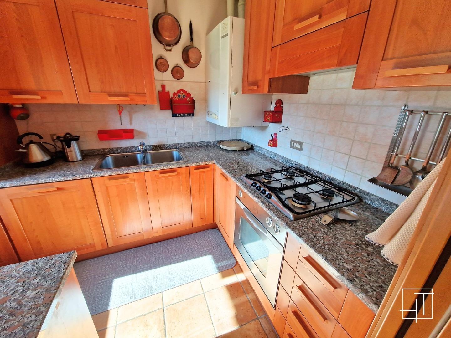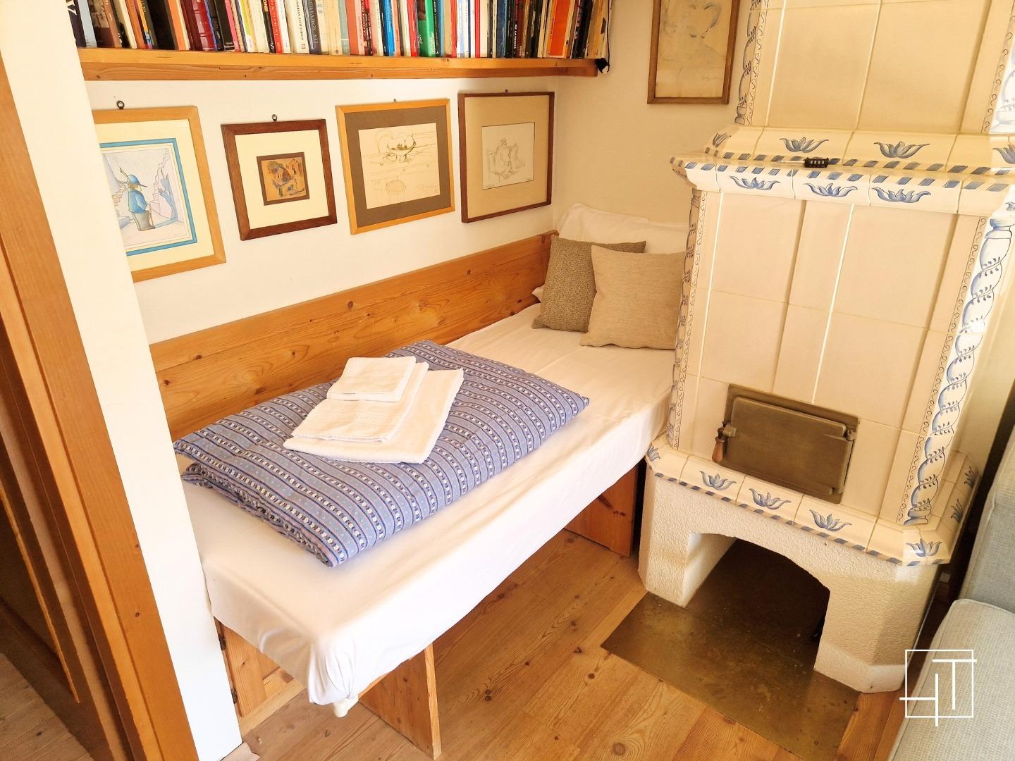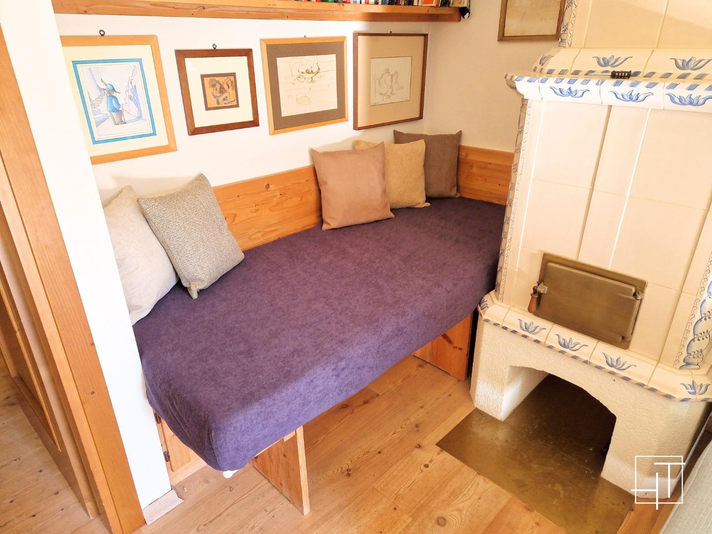 This ground-floor apartment combines the comfort of a cozy home with the beauty of the Dolomite landscape. The entrance from the garden leads to a bright living room with large windows offering mountain views, furnished with a large wooden table, a comfortable corner sofa, a Smart TV, and a traditional stube that creates a warm and inviting atmosphere. The French doors provide direct access to the spacious private green area, perfect for relaxing outdoors.