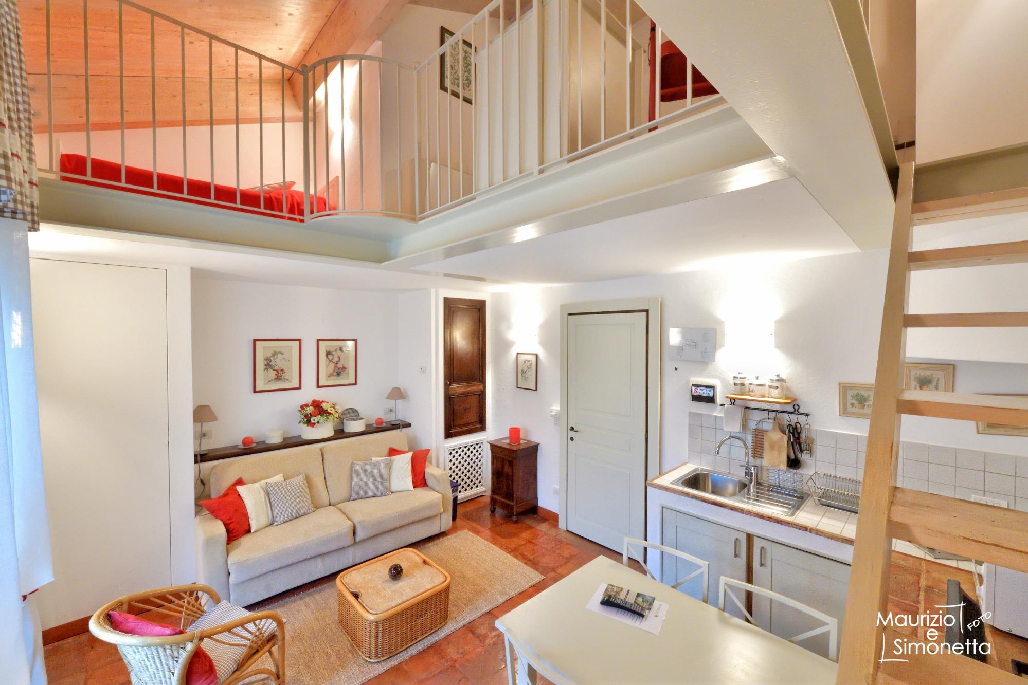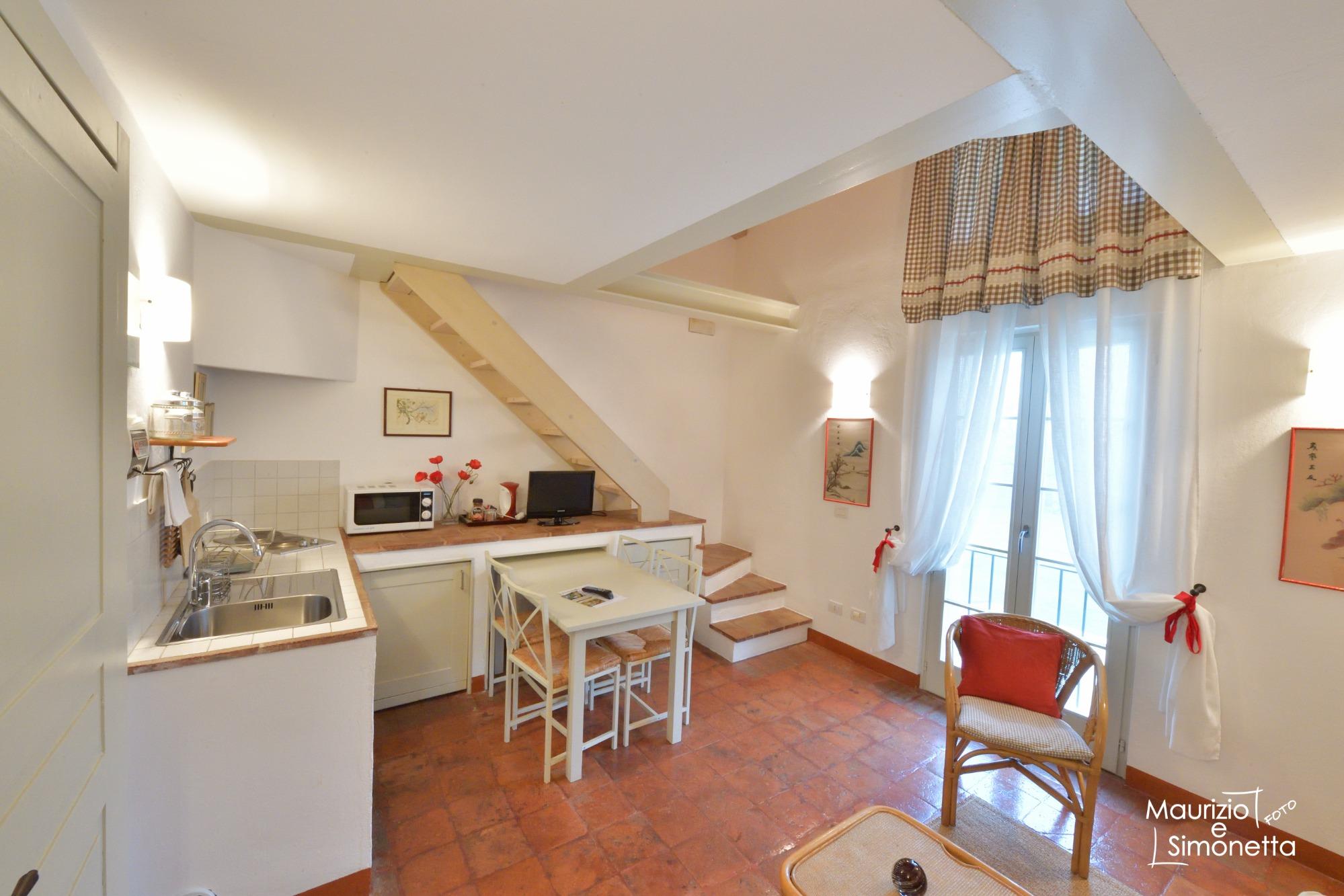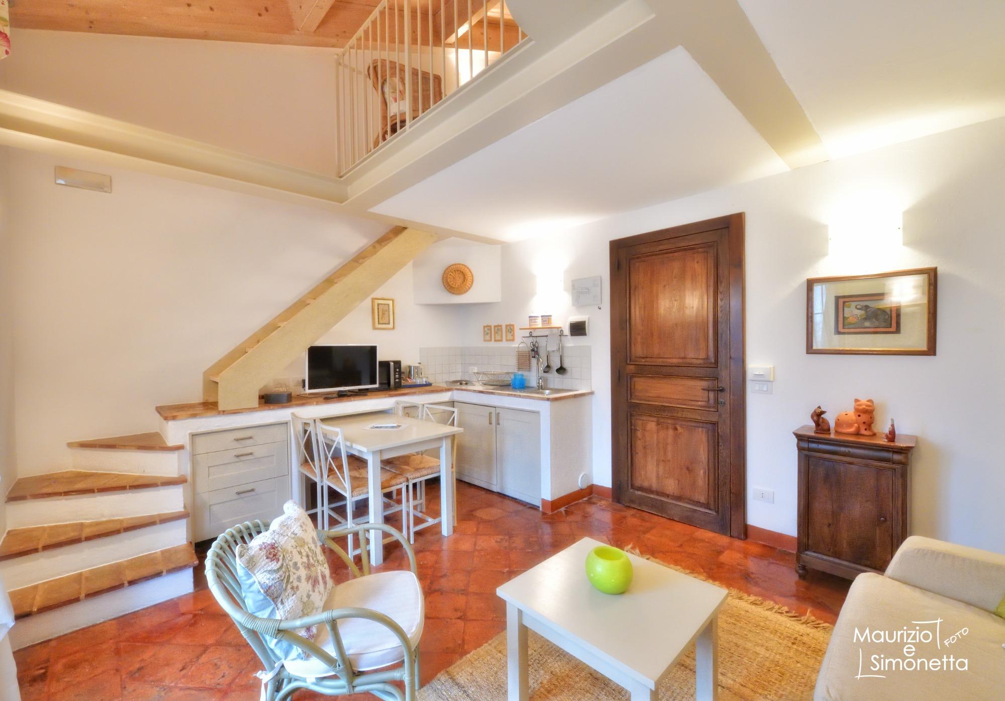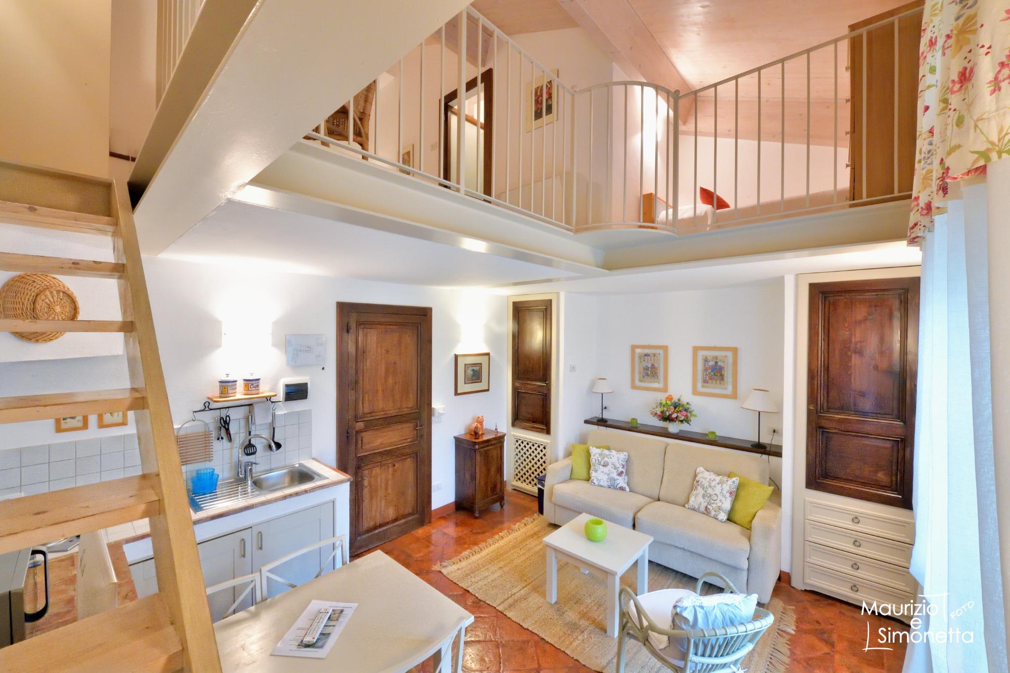Accogliente alloggio su due piani composto da una camera con letto matrimoniale con bagno su un piano soppalcato, un piccolo angolo cottura e una zona soggiorno con divano, tavolo e sedie al piano inferiore. La cucina è completamente attrezzata con pentole, padelle, utensili, piatti, posate e bicchieri. Tè, tisane, caffè e zucchero sono sempre disponibili.