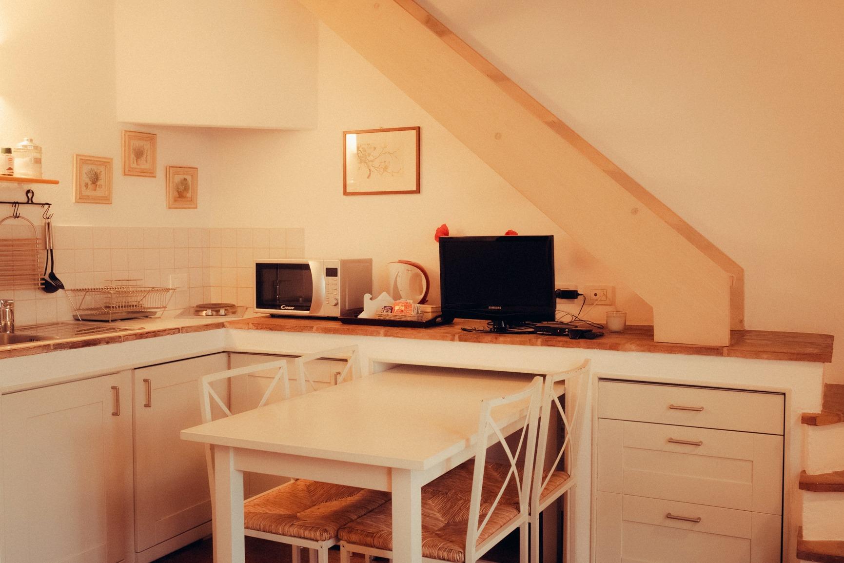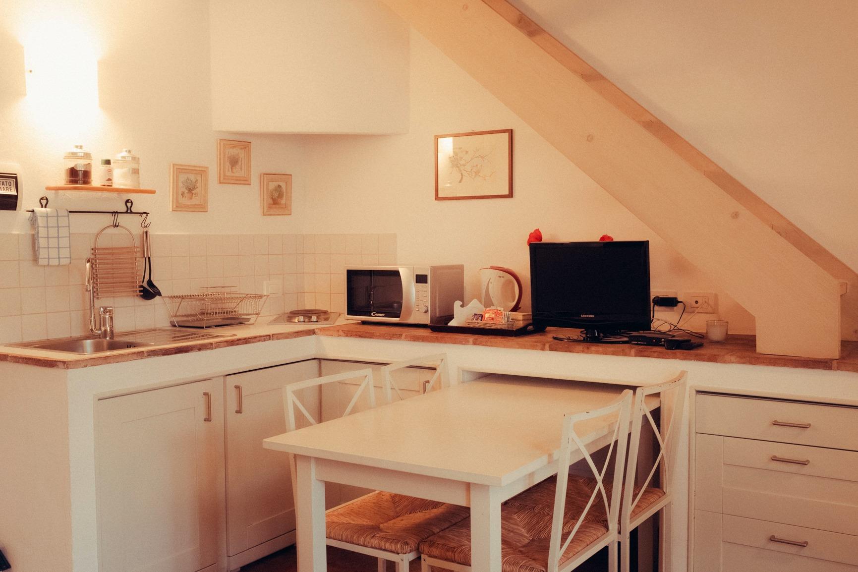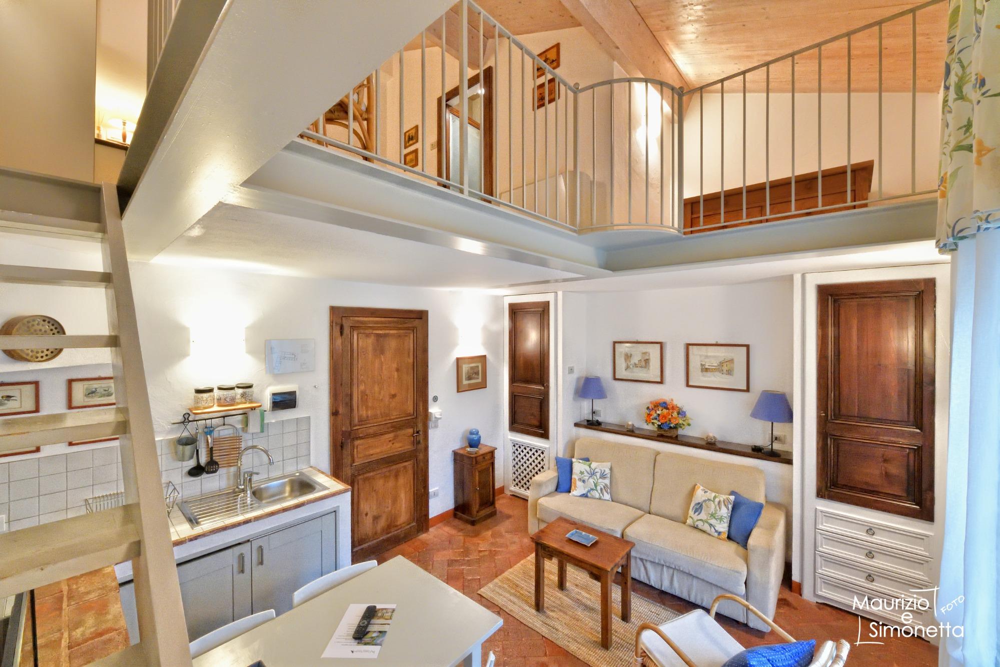 Accogliente alloggio su due piani composto da una camera con letto matrimoniale con bagno su un piano soppalcato, un piccolo angolo cottura e una zona soggiorno con divano, tavolo e sedie al piano inferiore. La cucina è completamente attrezzata con pentole, padelle, utensili, piatti, posate e bicchieri. Tè, tisane, caffè e zucchero sono sempre disponibili.