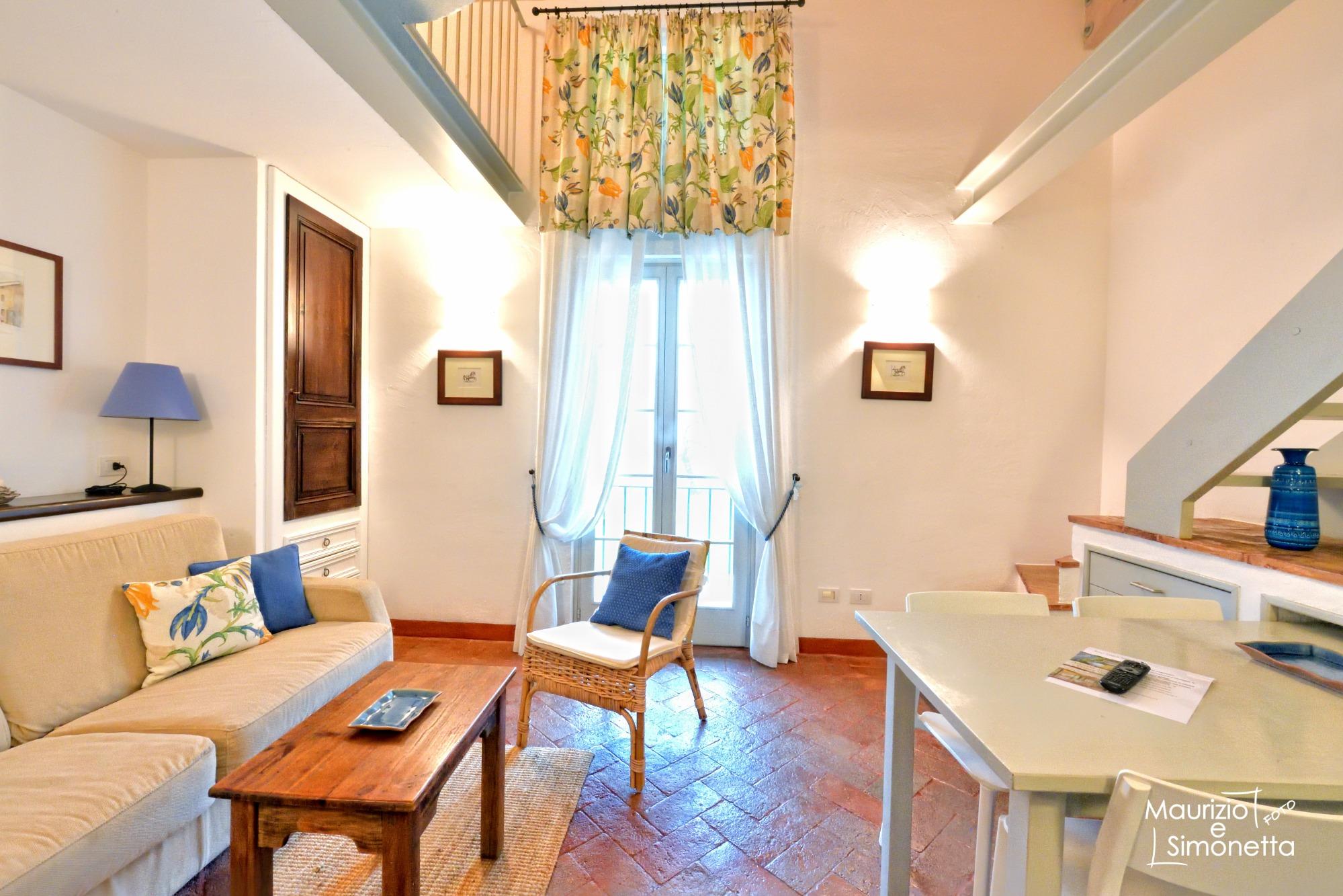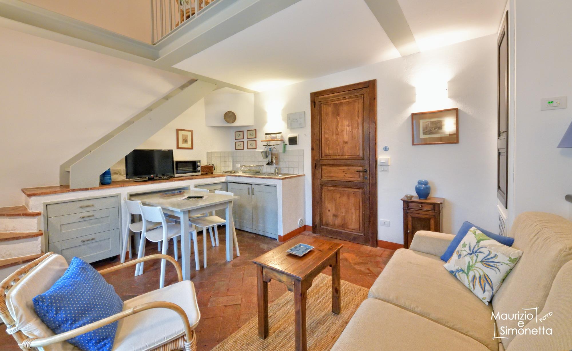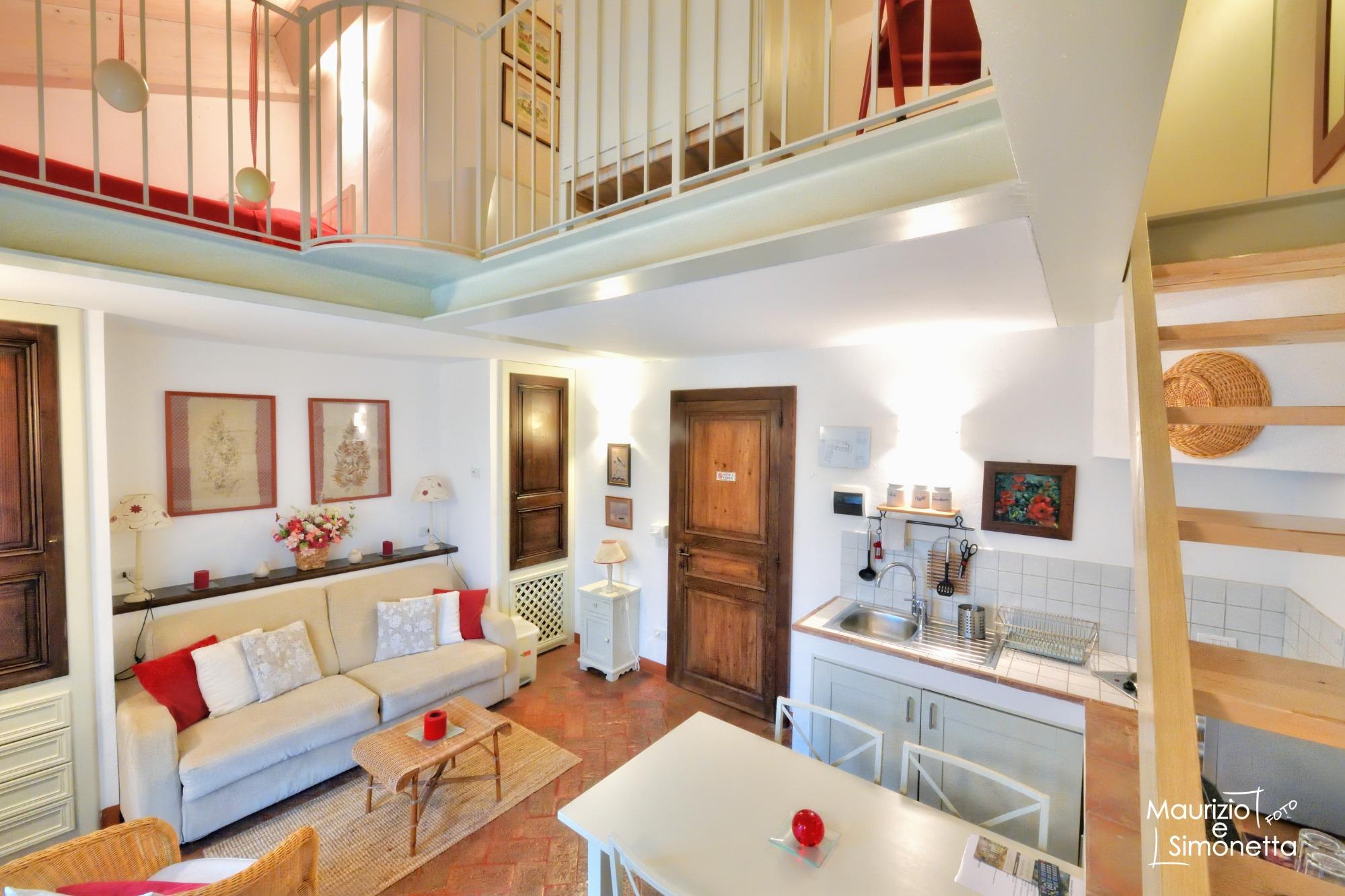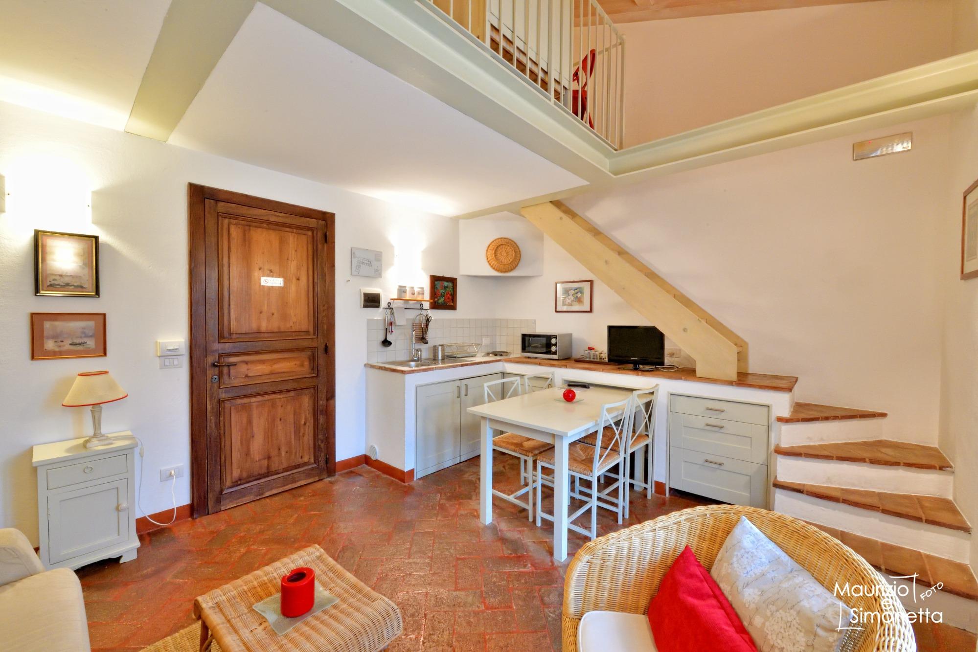 Accogliente alloggio su due piani composto da una camera con letto matrimoniale con bagno su un piano soppalcato, un piccolo angolo cottura e una zona soggiorno con divano, tavolo e sedie al piano inferiore. La cucina è completamente attrezzata con pentole, padelle, utensili, piatti, posate e bicchieri. Tè, tisane, caffè e zucchero sono sempre disponibili.