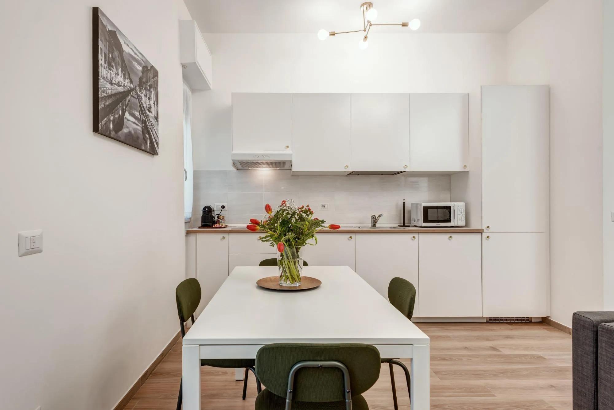 L’ingresso conduce a un’anticamera che apre su una luminosa zona giorno, dove la sala da pranzo si integra armoniosamente con una cucina moderna e completamente attrezzata. Perfetta per chi ama cucinare, ma con la comodità di avere nelle vicinanze una vasta scelta di locali per cene e aperitivi.