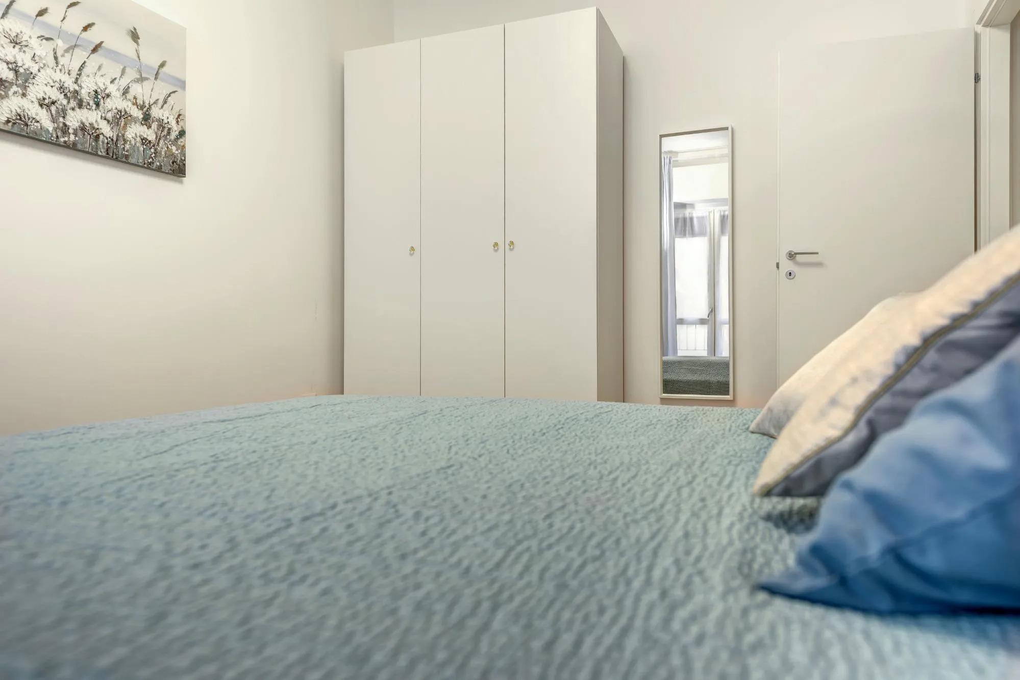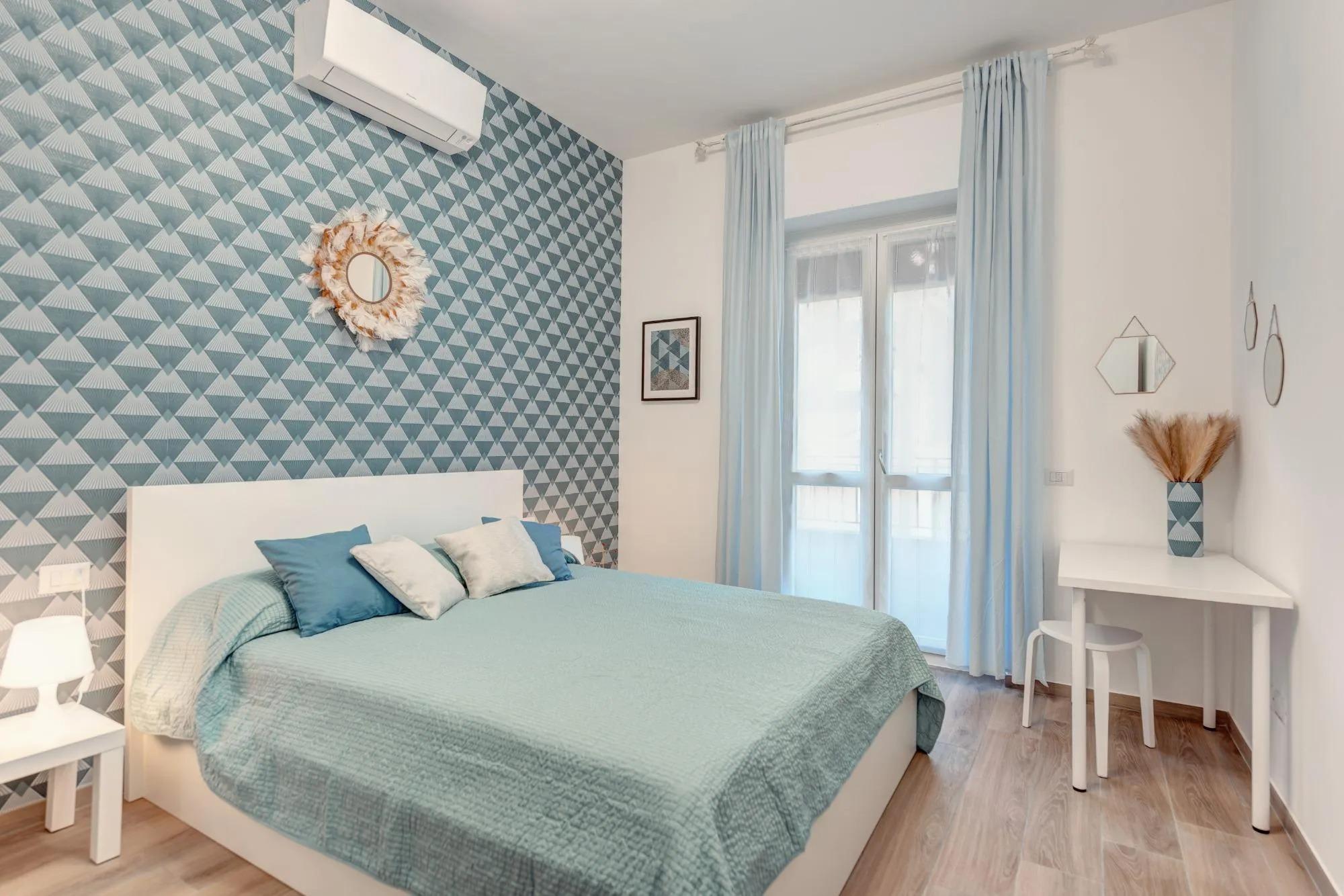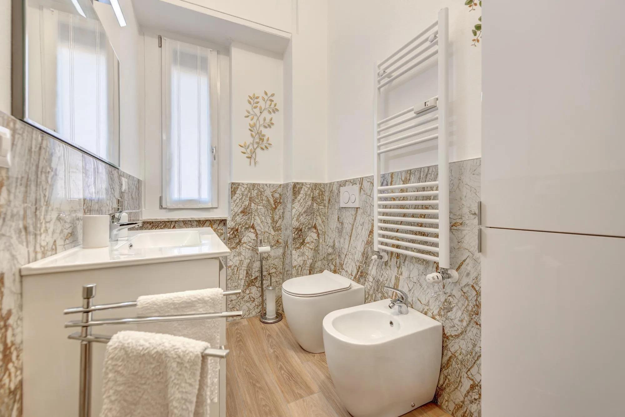 Il bagno, con una spaziosa doccia, è curato nei minimi dettagli per offrire un ambiente elegante e funzionale. La camera da letto, ampia e accogliente, dispone di un comodo letto, un armadio e una scrivania che si trasforma in una pratica postazione per lo smart working.