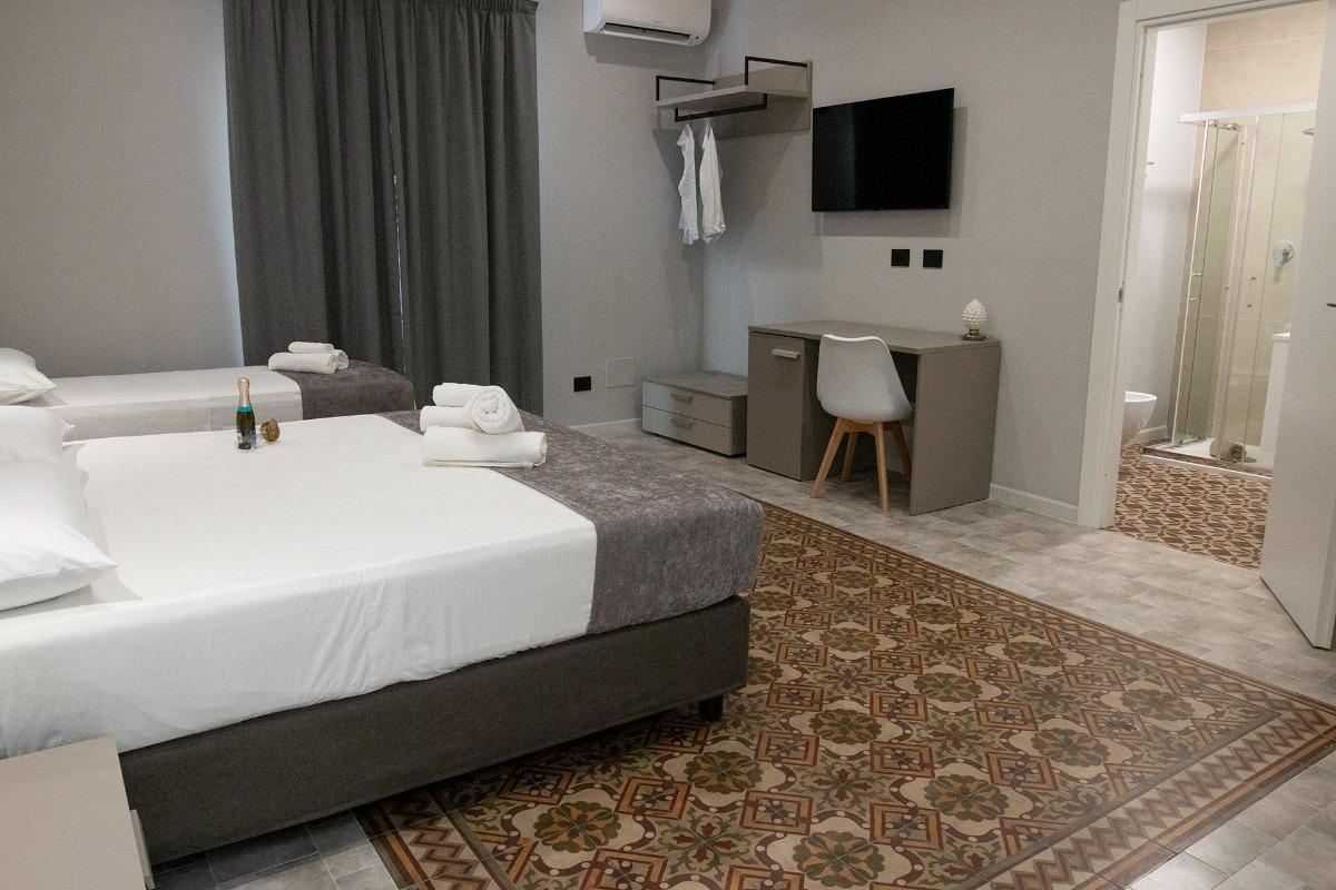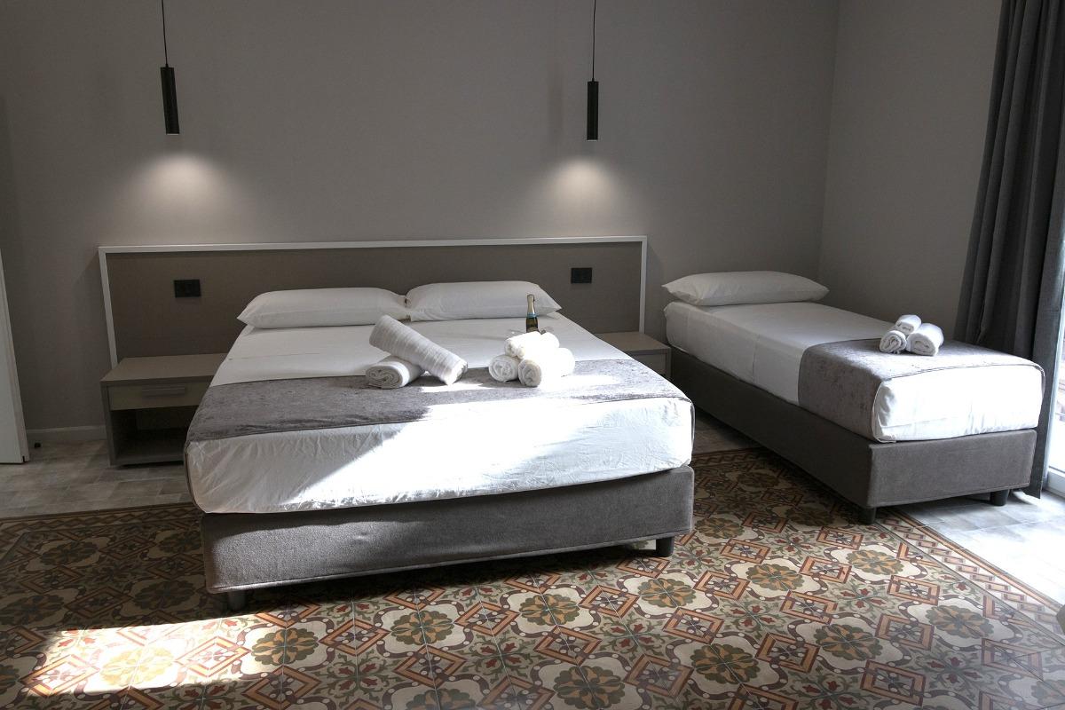 La camera tripla a piano terra (camera 101) viene arredata con uno stile minimal ma funzionale, la stanza da letto è molto spaziosa, pensata per ospiti che non devono rinunciare alla loro comodità durante il proprio soggiorno, è presente un frigobar ricco di bevande ed è facilmente accessibile senza uso di scale.