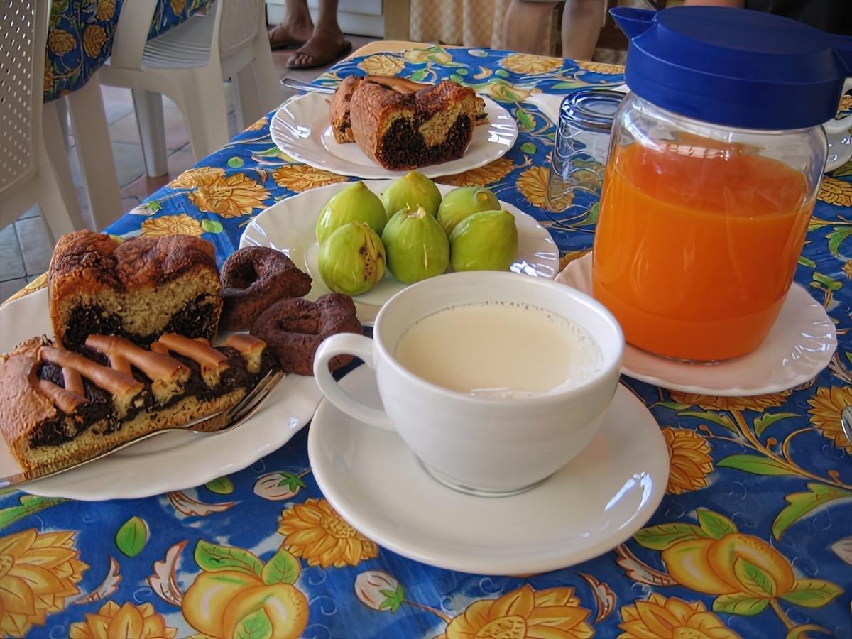Breakfast is included in the room price. It is available from 8:00 to 10:00 in the morning and is served on the terrace with coffee, milk, tea, fruit juices, and pastries.