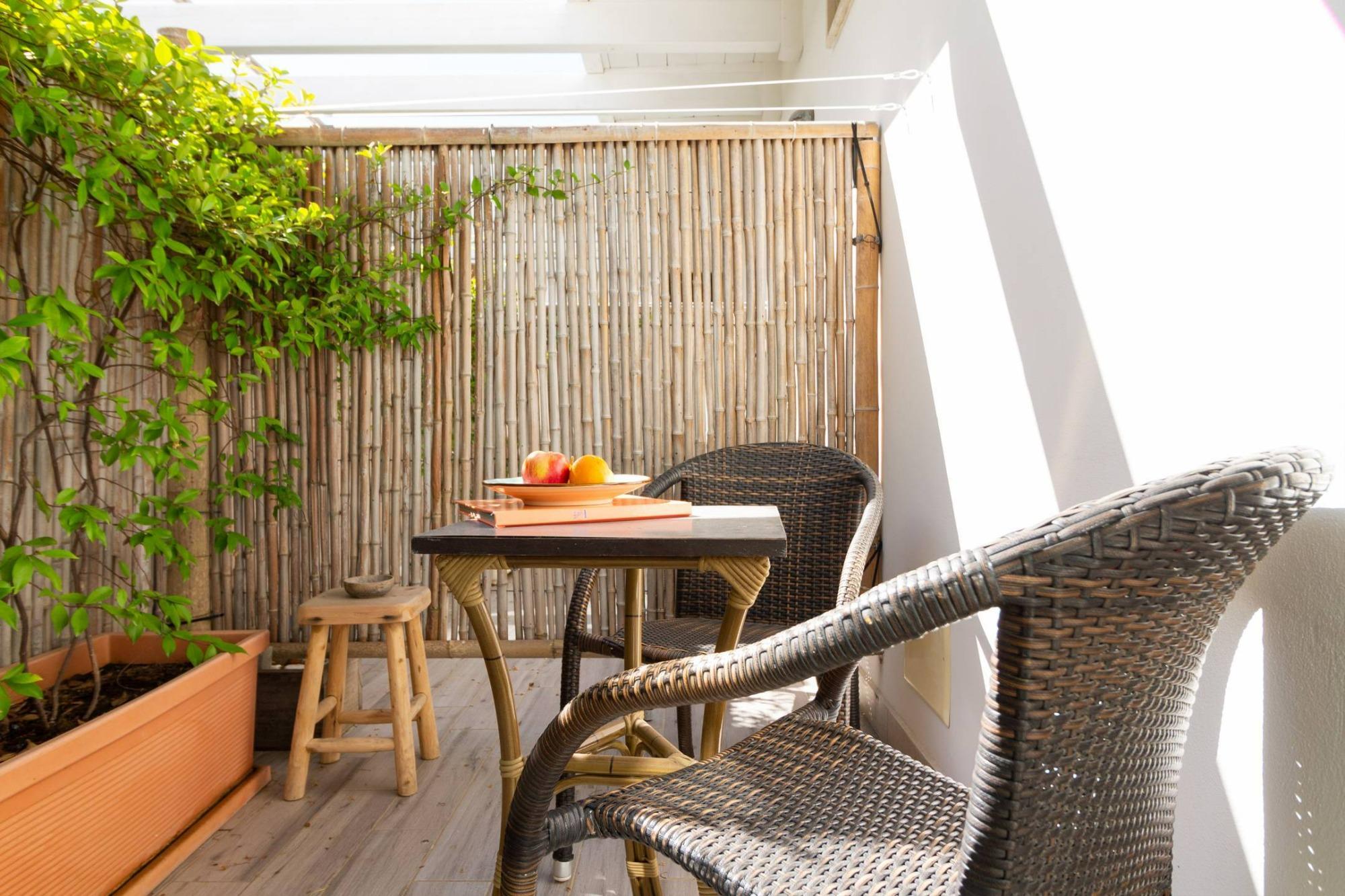 Habitación con balcón sin vistas al mar o con pequeña terraza interior. Finamente decorada y acogedora, con cama doble o dos camas individuales. Situada en la primera planta, sin ascensor. Para 2 personas – 14 m².