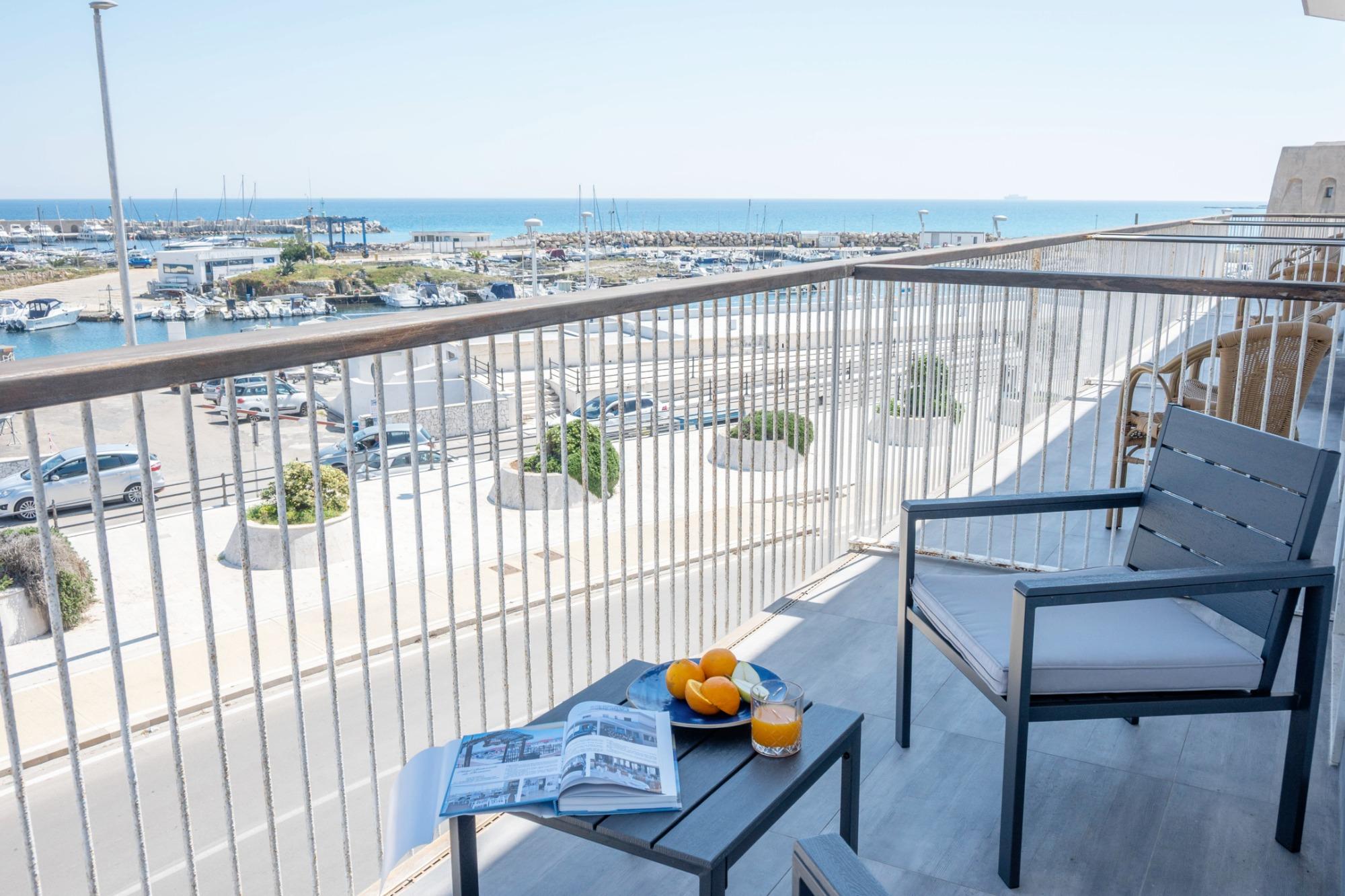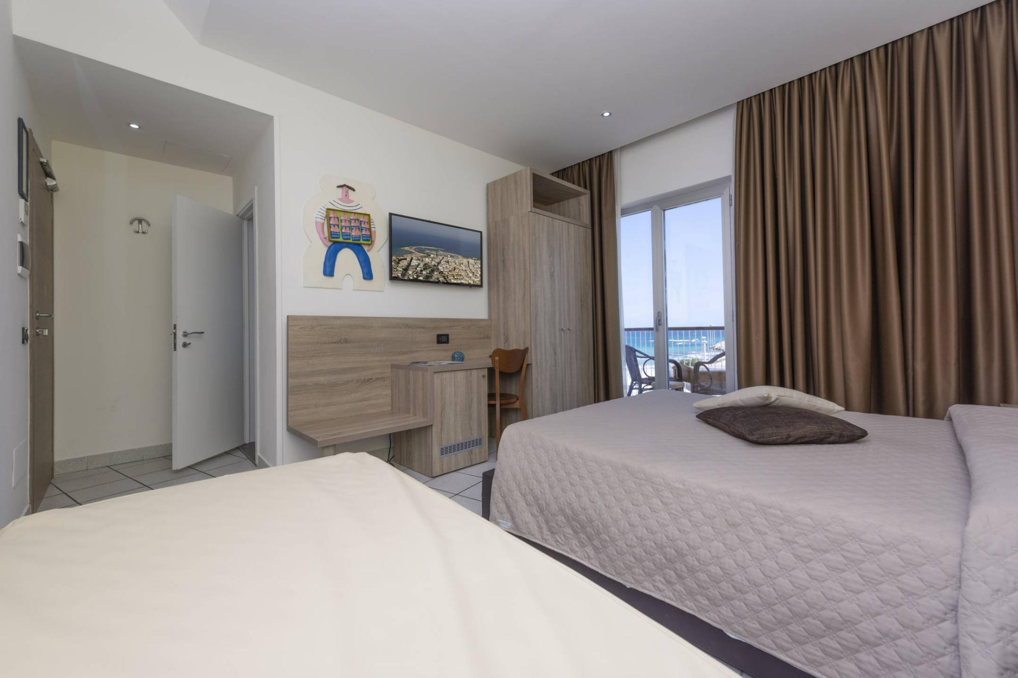 Habitación en planta baja con amplio balcón y magnífica vista al mar. Finamente decorada y acogedora, con doble ventanal de suelo a techo. Dispone de una cama doble y una cama individual que puede convertirse en litera si es necesario. Puede alojar a 3 o 4 personas. – 24 m².
