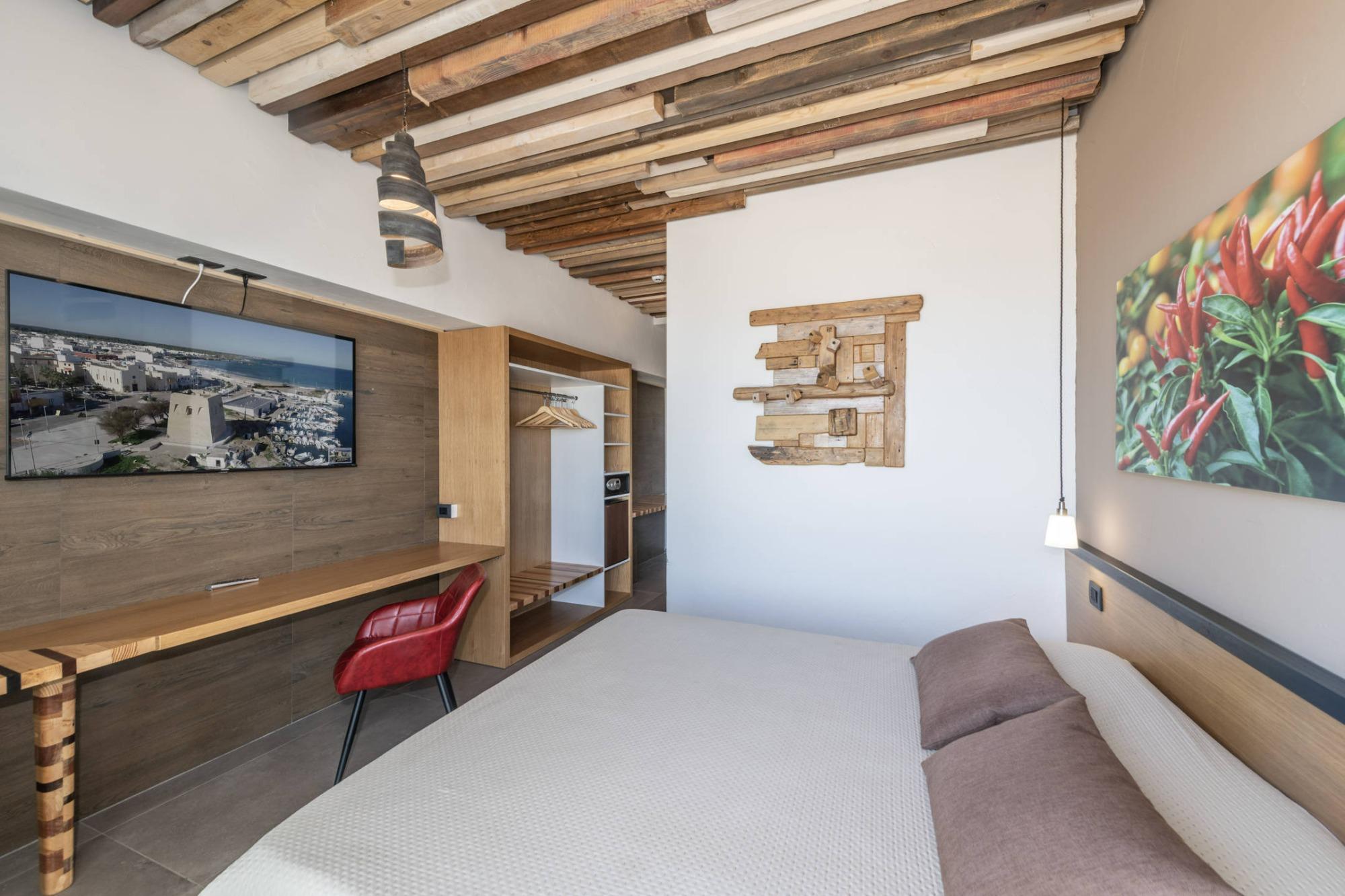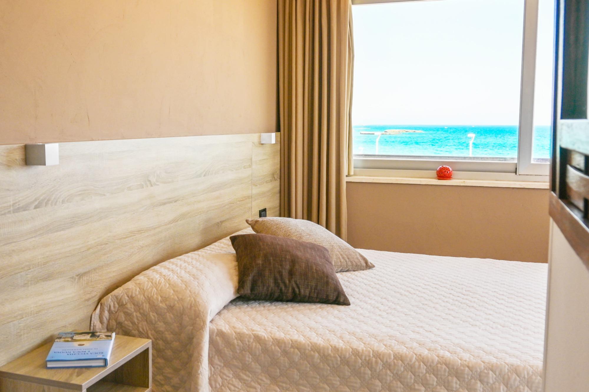 Habitación con balcón y vistas panorámicas a la playa de San Foca y a la antigua torre. Luminosa y acogedora, con cama doble. Situada en la primera planta, sin ascensor. Para 2 personas – 16 m².