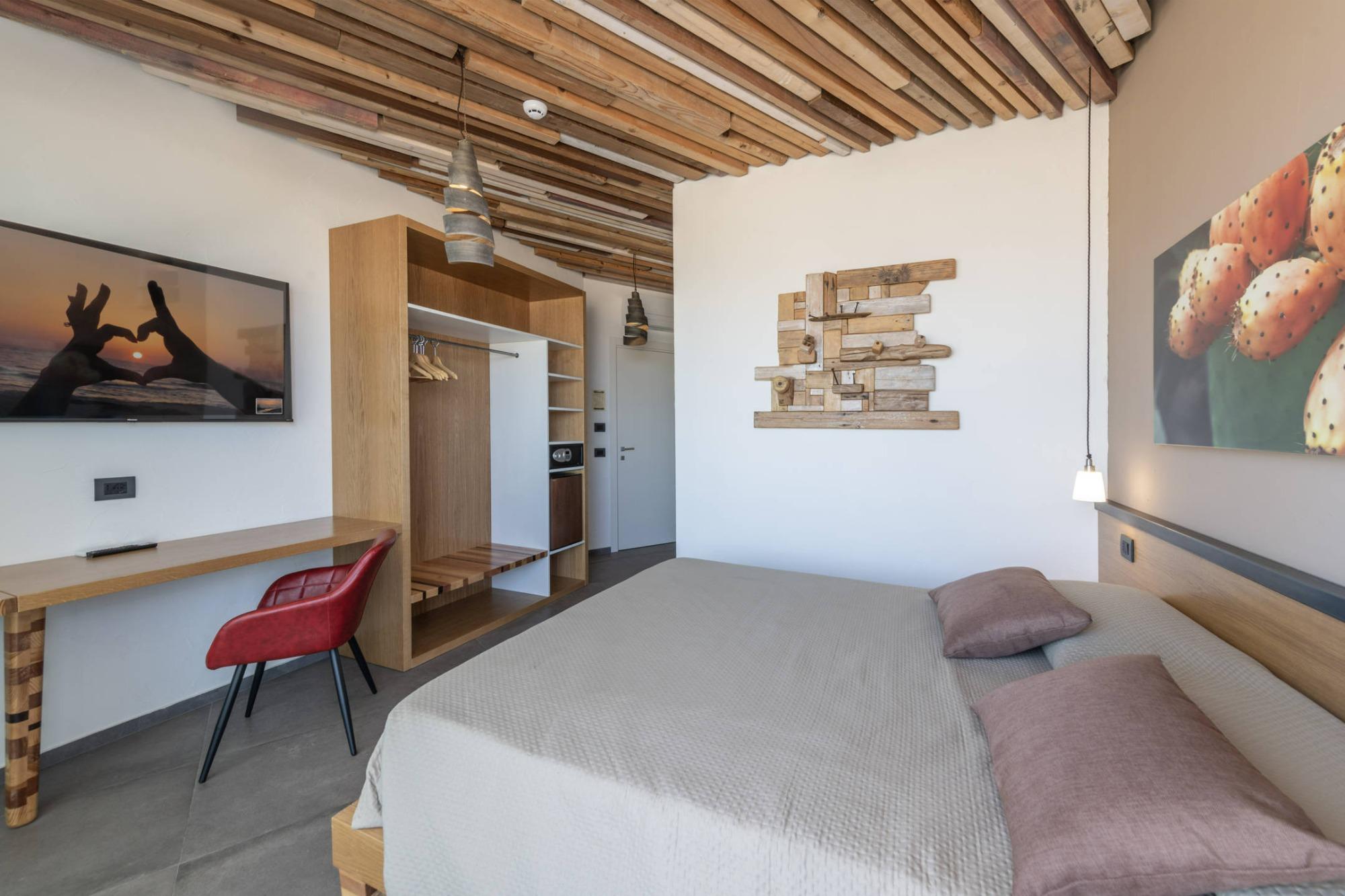 Habitación en planta baja con ventanales de suelo a techo y magnífica vista al mar. Finamente decorada y acogedora. Para 2 personas, con cama doble. Algunas cuentan con baño adaptado para silla de ruedas. – 17 m².