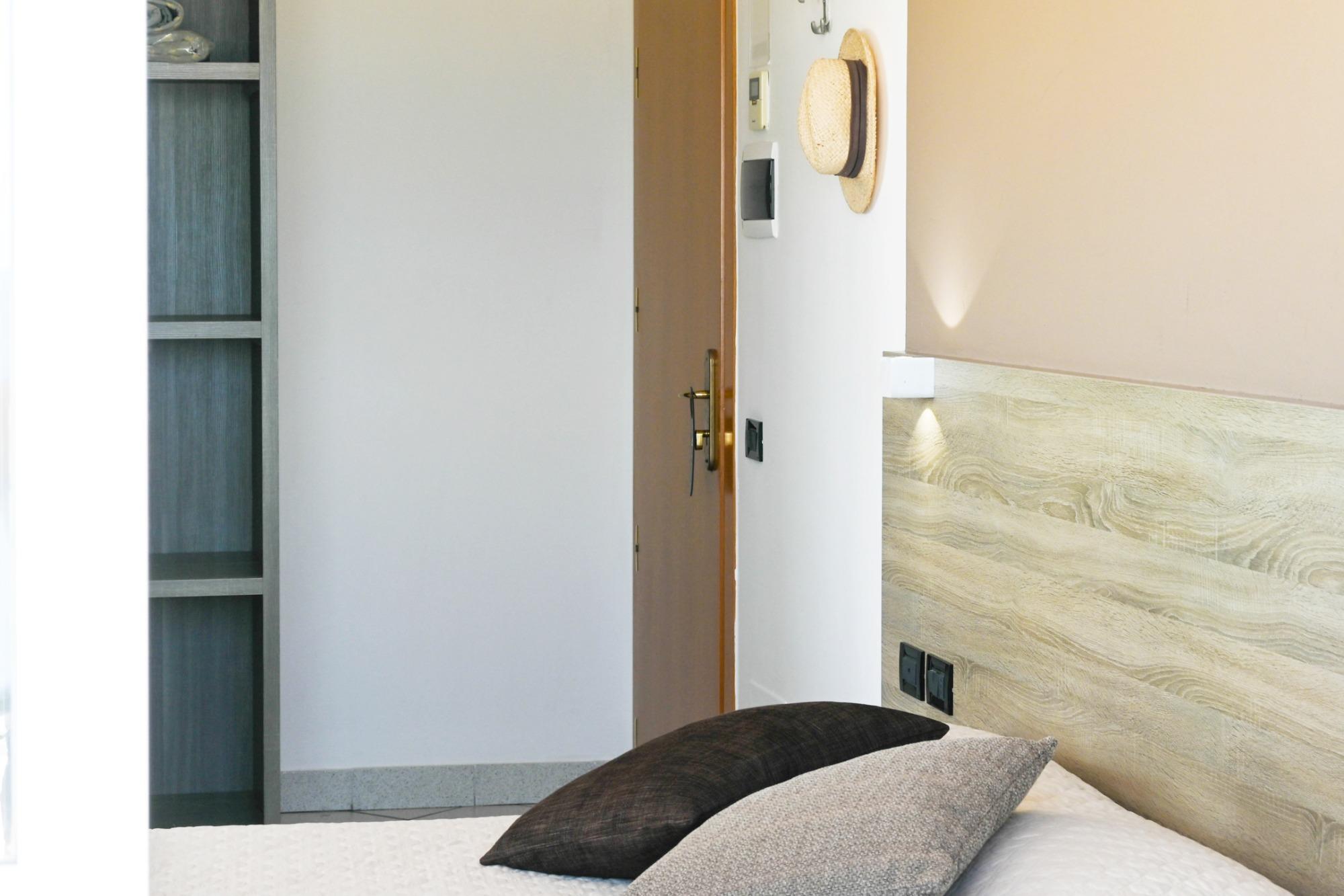 Habitación con balcón sin vistas al mar o con pequeña terraza interior. Finamente decorada y acogedora. Cuenta con una cama doble y una cama individual que puede convertirse en litera si es necesario. Situada en la primera planta, sin ascensor. Puede alojar a 3 o 4 personas. – 17 m².