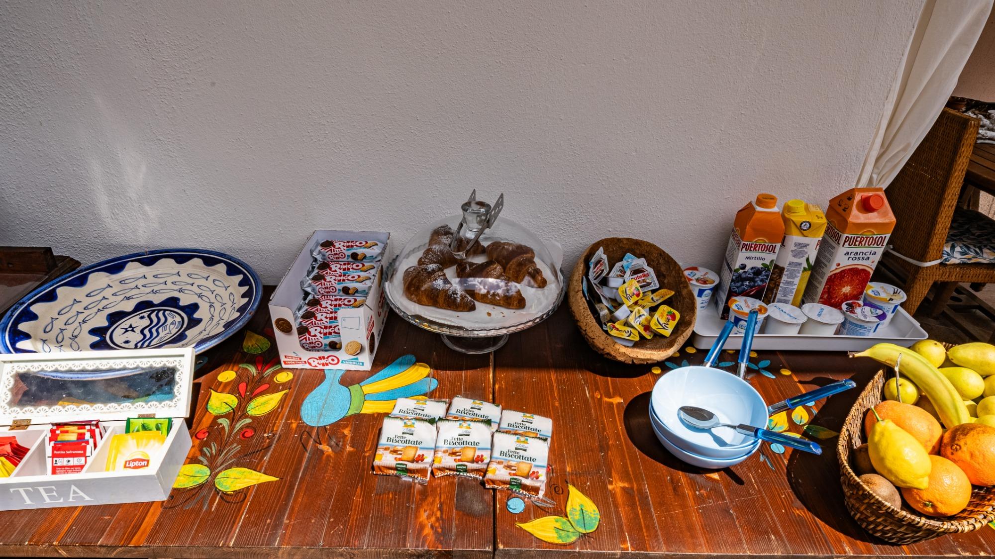 A delightful sweet breakfast includes: coffee, milk, cappuccino, tea, yogurt, fruit juices, croissants, jam, honey, Nutella, cookies, cereal, and fresh fruit.
