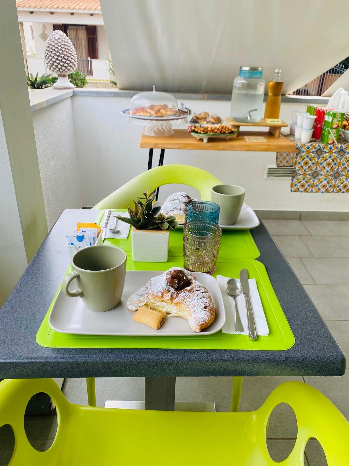 La colazione viene servita ogni mattina in veranda, in un ambiente piacevole e rilassato, perfetto per iniziare la giornata con gusto. Gli ospiti possono scegliere tra un’ampia varietà di proposte, dolci e salate: yogurt, cereali, frutta fresca, latte, caffè espresso o all’americana, cappuccino, succhi di frutta, croissant, biscotti, fette biscottate con marmellata, burro o crema spalmabile, torte fatte in casa e specialità tipiche siciliane. Il tutto da gustare all’aperto, approfittando della bella stagione e della tranquillità della veranda ombreggiata.