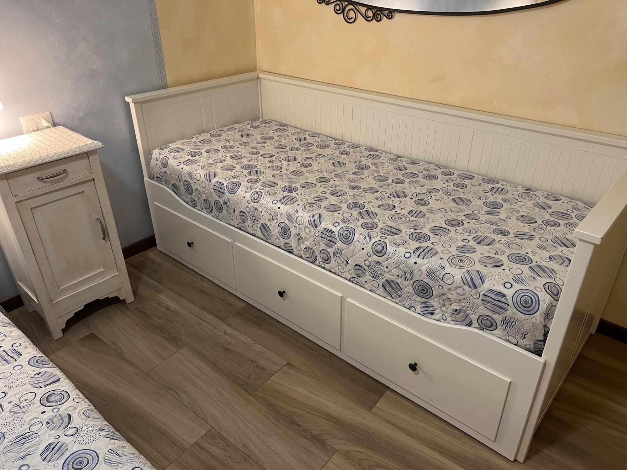 La camera comunicante, è composta da due camere adiacenti, ognuna di un letto matrimoniale 195x160 e una anche di un letto singolo 80x200 Il bagno finestrato è dotato di doccia, lavabo, wc e bidet; salviette e salviettoni a disposizione come anche sapone liquido, shampo e bagnoschiuma. In ogni camera c'è una macchina da caffè Nespresso con relativa cialda e un bollitore. Il frigorifero 100l è utilizzabile dagli ospiti.