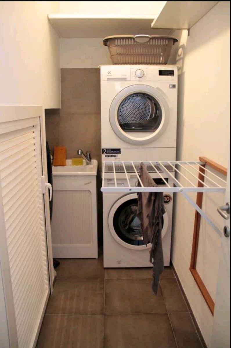 - una lavanderia con lavello, lavatrice, asciugatrice e aspirapolvere.