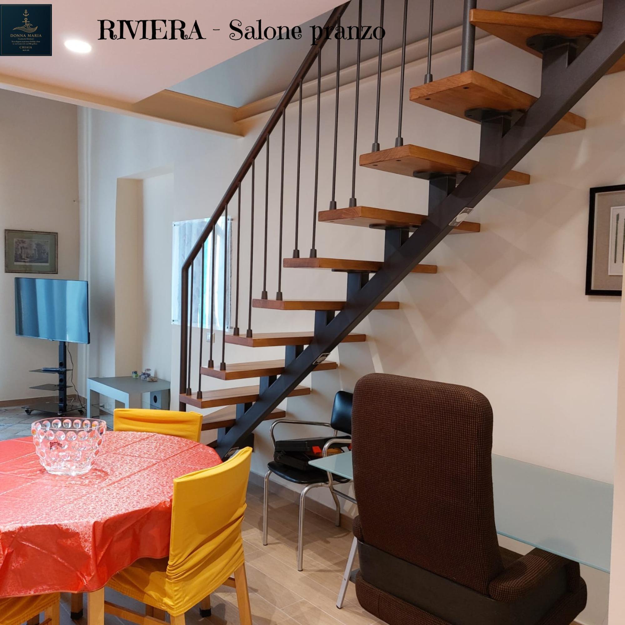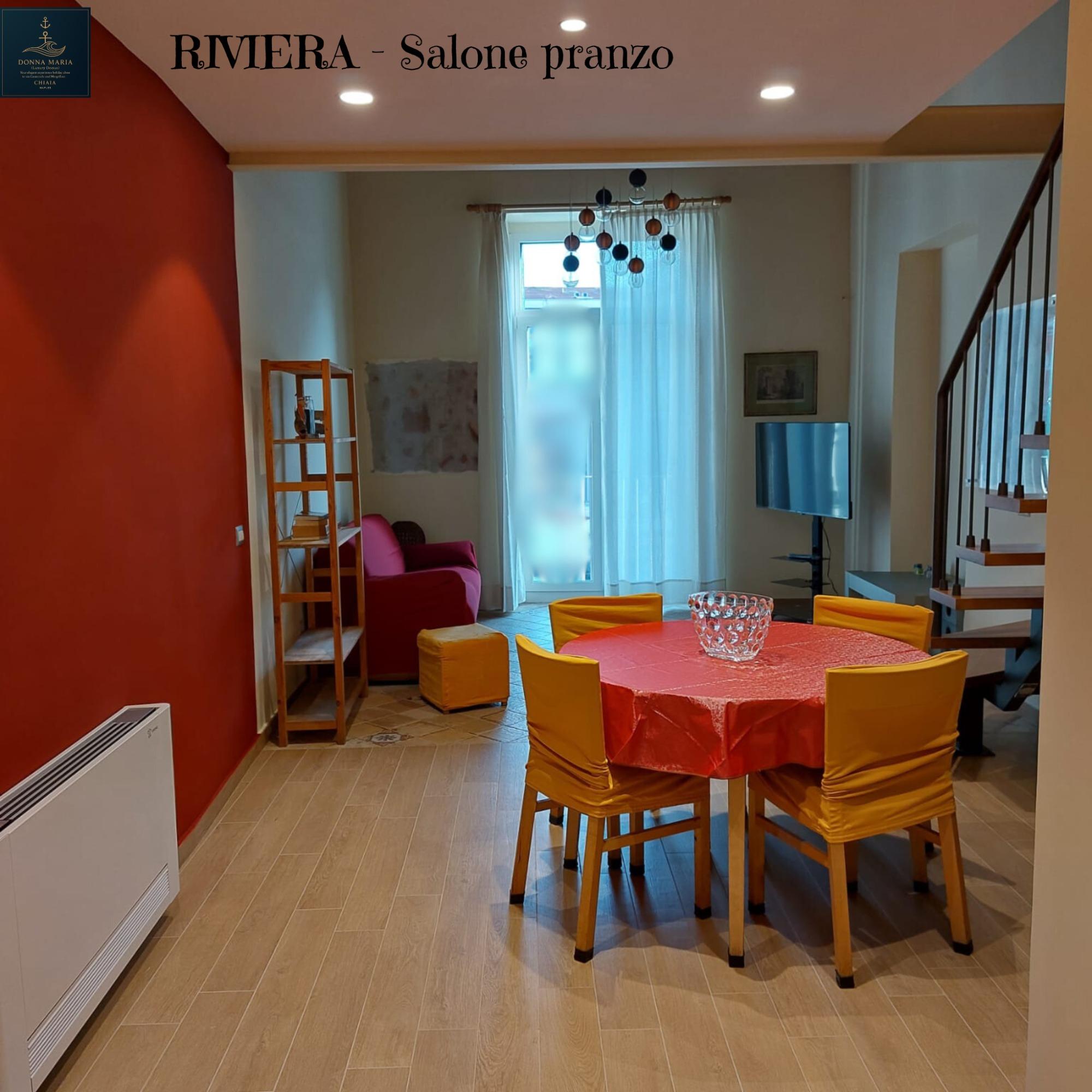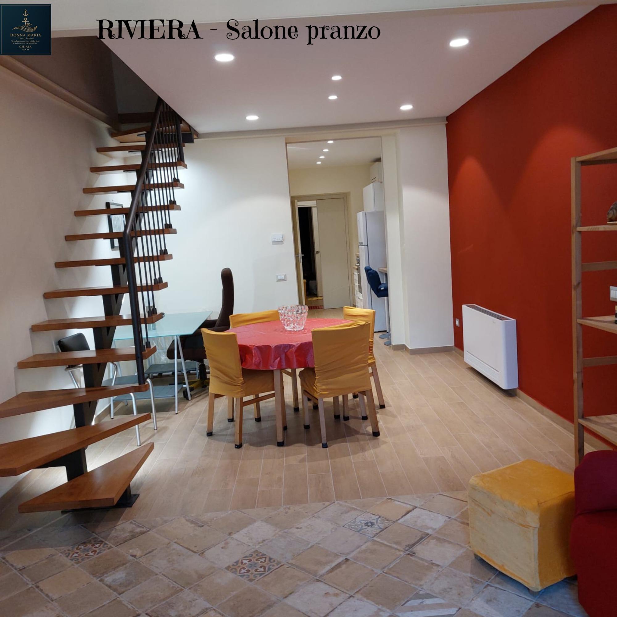 In a charming historic building on the Riviera di Chiaia, this two-level apartment of 55 square meters blends traditional allure with modern comforts. On the ground floor, there is a spacious living room featuring a relaxation area, a double sofa bed, a dining table, and a desk, as well as a fully equipped kitchen and a convenient half-bath. An internal staircase leads to the lofted level, which includes the master bedroom, a wardrobe area, and a second bathroom.