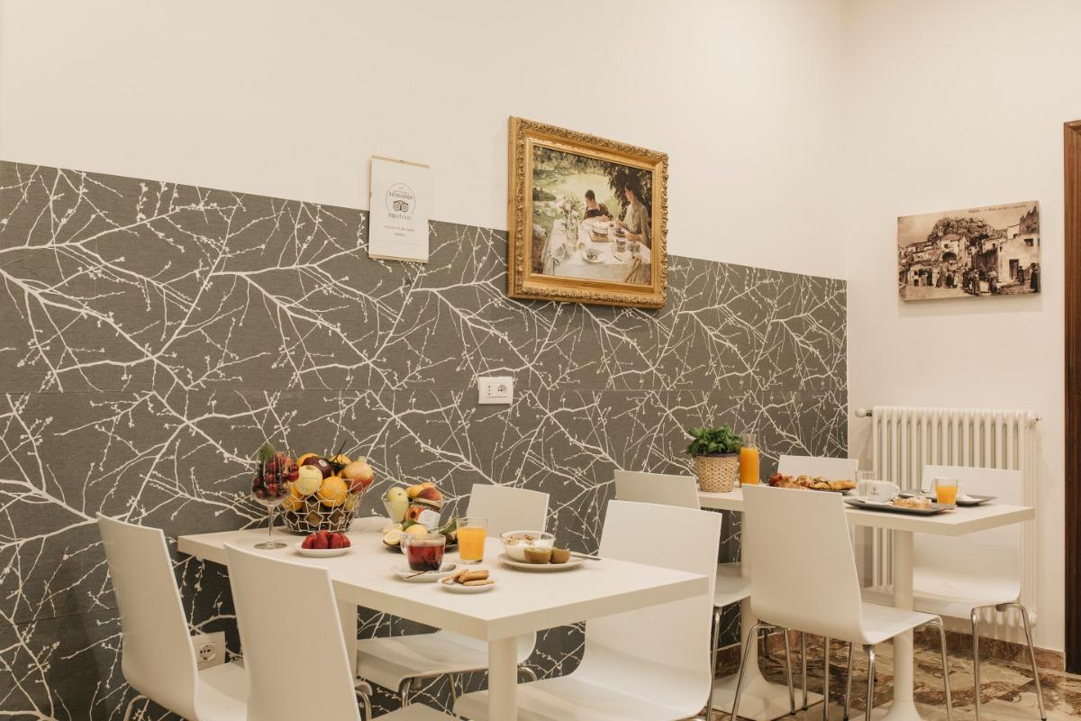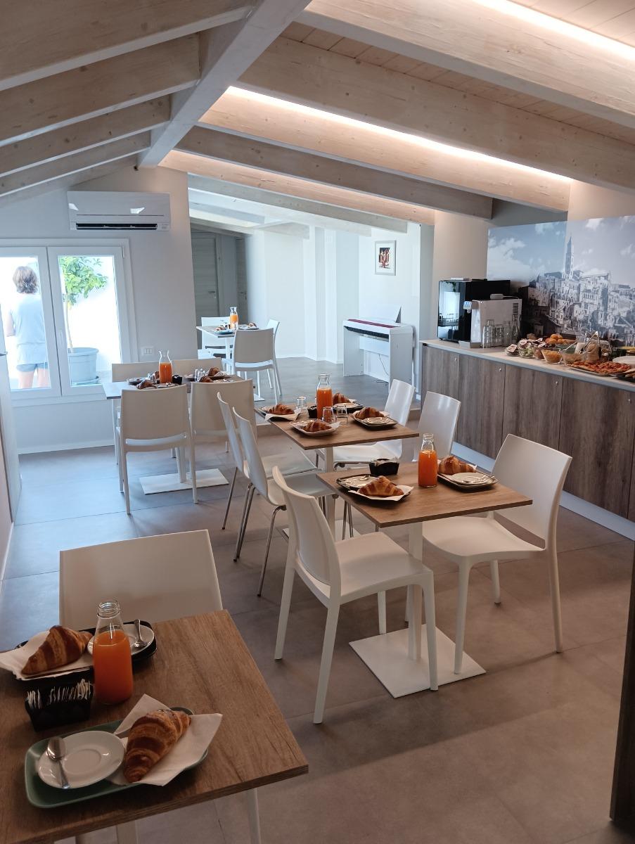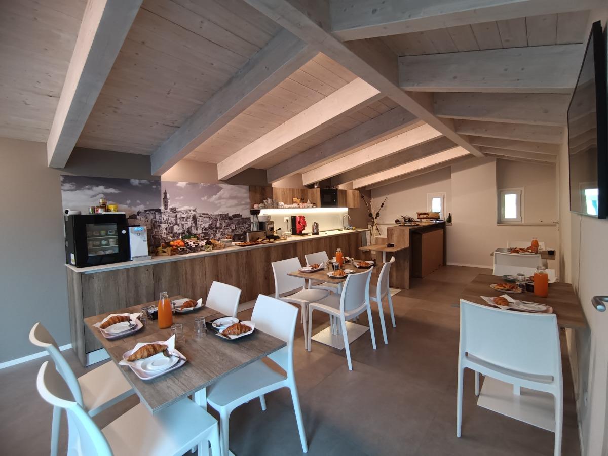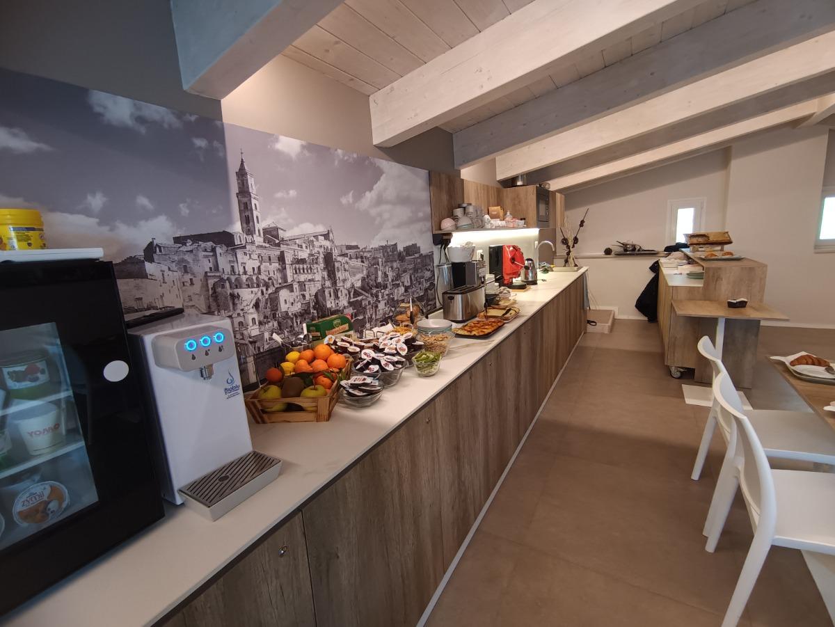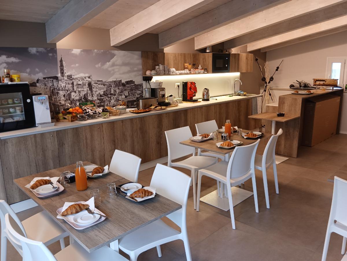 Every morning, the hospitality manager will delight you with freshly baked artisanal delicacies from the historic Schiuma pastry shop. You can taste the typical croissants, the crispy and fragrant bread from Matera, accompanied by the irresistible whole honey portioned directly from the honeycomb on your table. The assortment also includes freshly baked local focaccia, yogurt, cereals, fresh fruit, jams, chocolate spread, and, upon request, gluten-free or lactose-free cold cuts or products. Classic coffee and cappuccino are also available for a great energy boost.