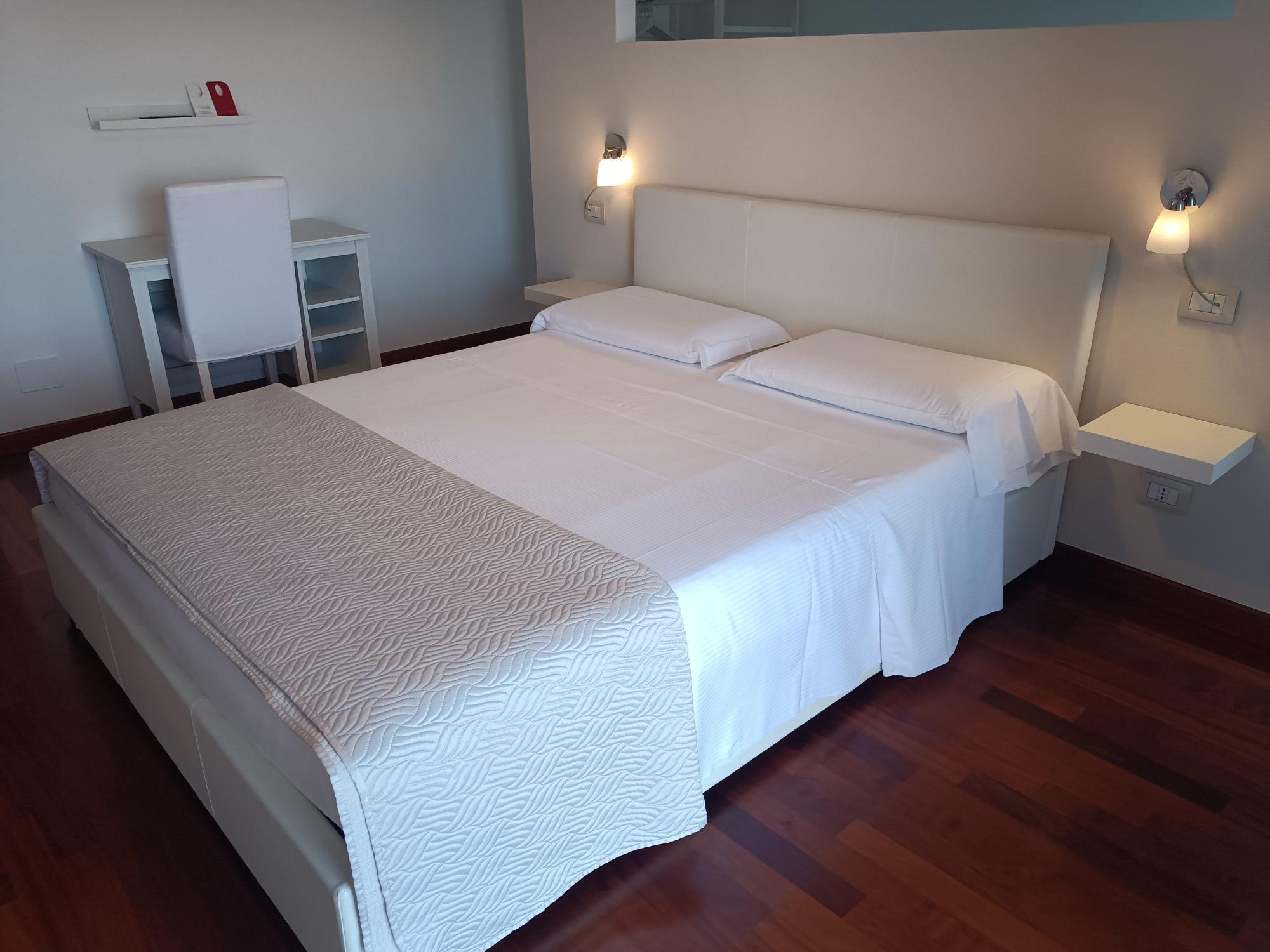 Camera Matrimoniale – 20 m² Superficie: 20 m² 1 letto matrimoniale Vietato fumare Servizi in camera: Mini frigo Aria condizionata indipendente WiFi gratuito Balcone con vista città Scrivania, riscaldamento, parquet, biancheria da letto Presa elettrica vicino al letto, stand appendiabiti Bagno privato con: Doccia, WC, bidet, asciugamani, asciugacapelli Carta igienica, prodotti da bagno COLAZIONE INCLUSA PRESSO BAR CONVENZIONATO