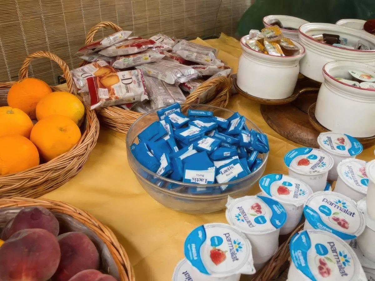 Additionally, you can enjoy croissants, jams, yogurt, cereals, fresh and syruped fruit, and a variety of bread for a royal breakfast!