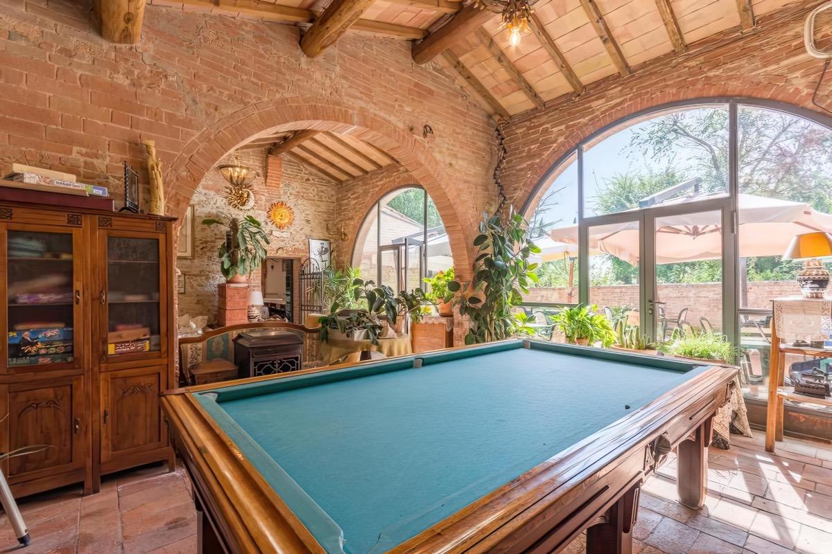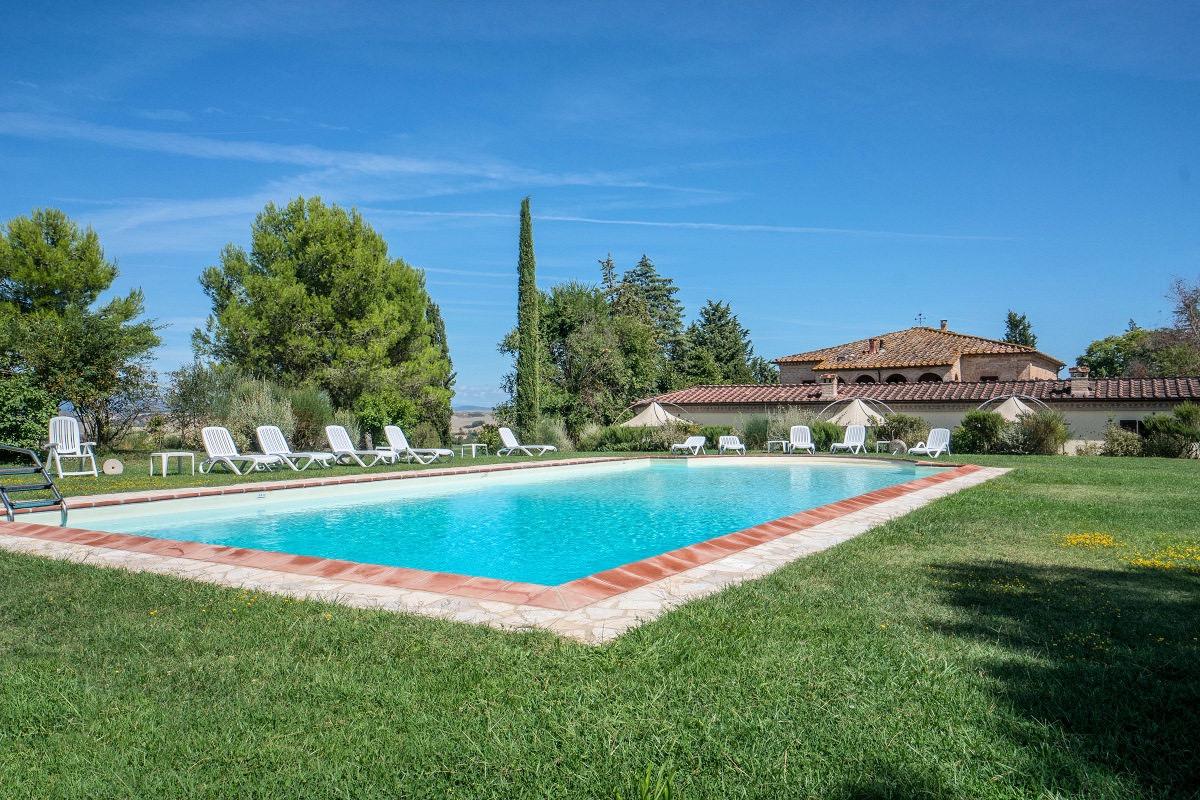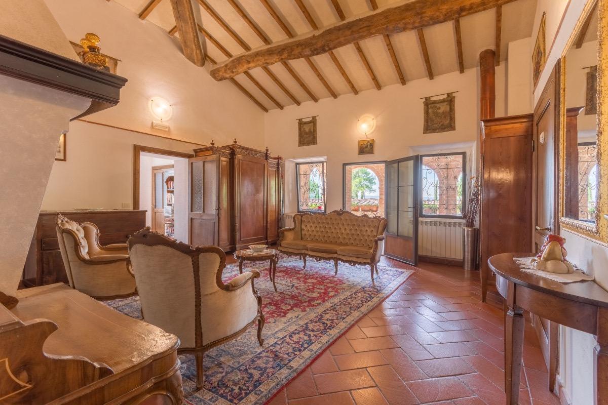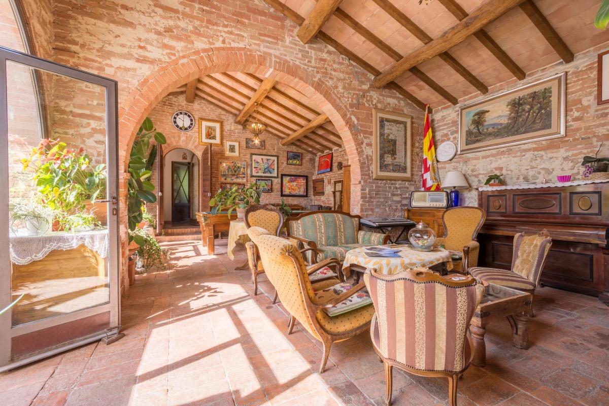 Spacious and bright rooms, all with panoramic views of the Val d'Arbia. Panoramic terrace, wide breakfast room with fireplace, reading room with billiards and piano. Salt-water pool, large garden shaded with trees, flower beds, immersed in the landscape of the Crete Senesi. Three hectares of land where there are fences with horses and donkeys, a small vineyard and a cultivation of vegetables for the exclusive use of the family and guests.