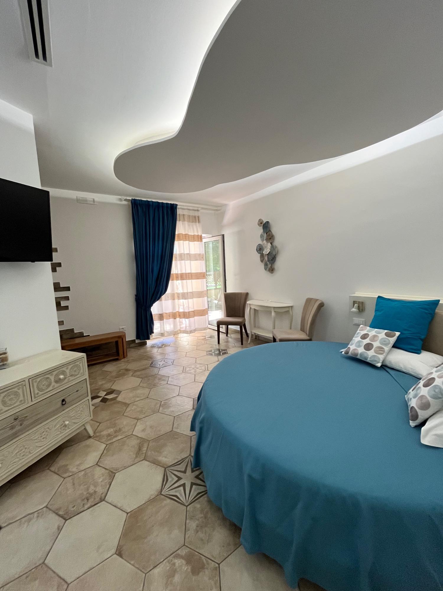 Giardino privato, salottino con angolo cottura, soggiorno curato nei minimi dettagli, divano letto, caminetto a bioetanolo, letto rotondo King Size, comode poltroncine di design con piccola consolle in legno, bagno con doccia emozionale con cromoterapia. Nella Suite Narciso c'è tutto ciò che ti occorre per una fantastica vacanza all'insegna del comfort e del relax.