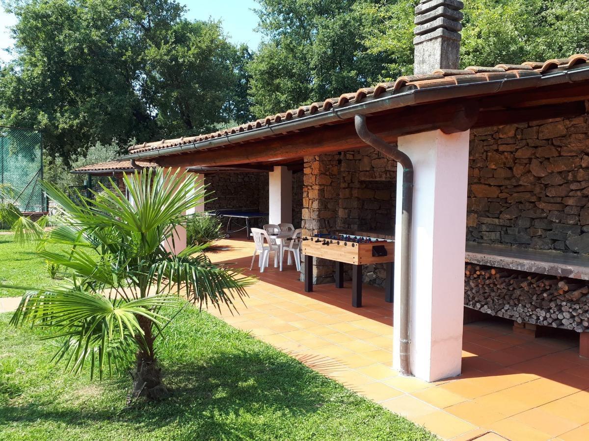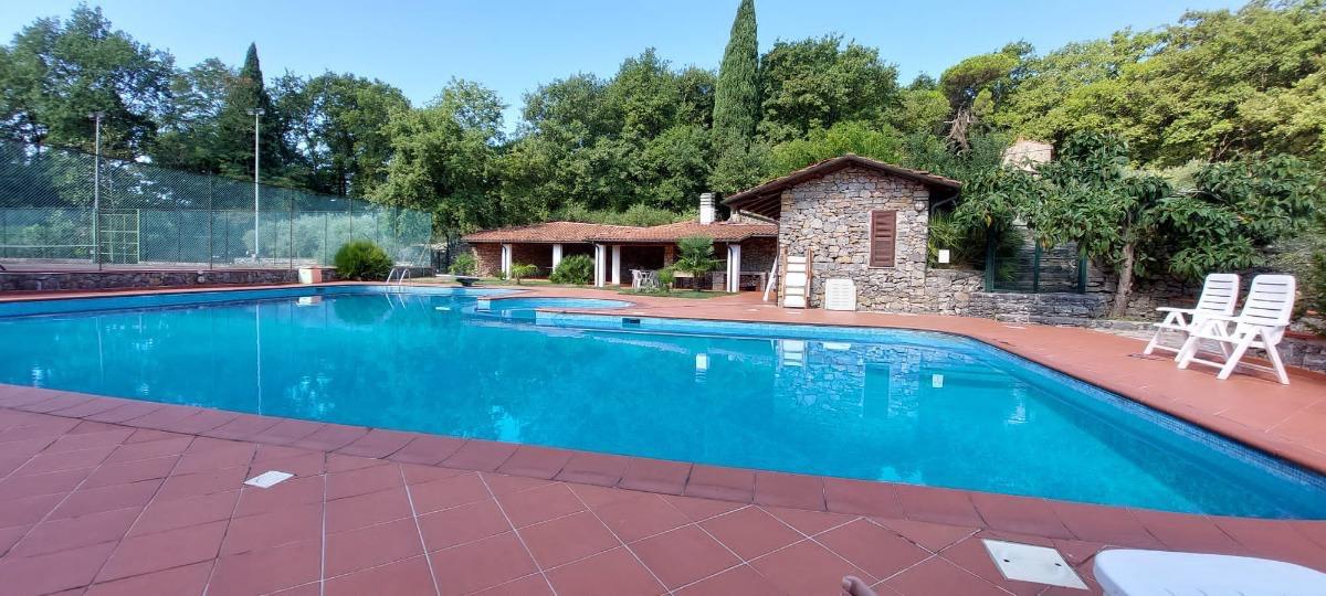The property is immersed in a vast park surrounded by typical Mediterranean vegetation, olive groves, and vineyards. The garden, with its brightly colored flower beds, is equipped with children's games and sun loungers for relaxation and sunbathing for adults.