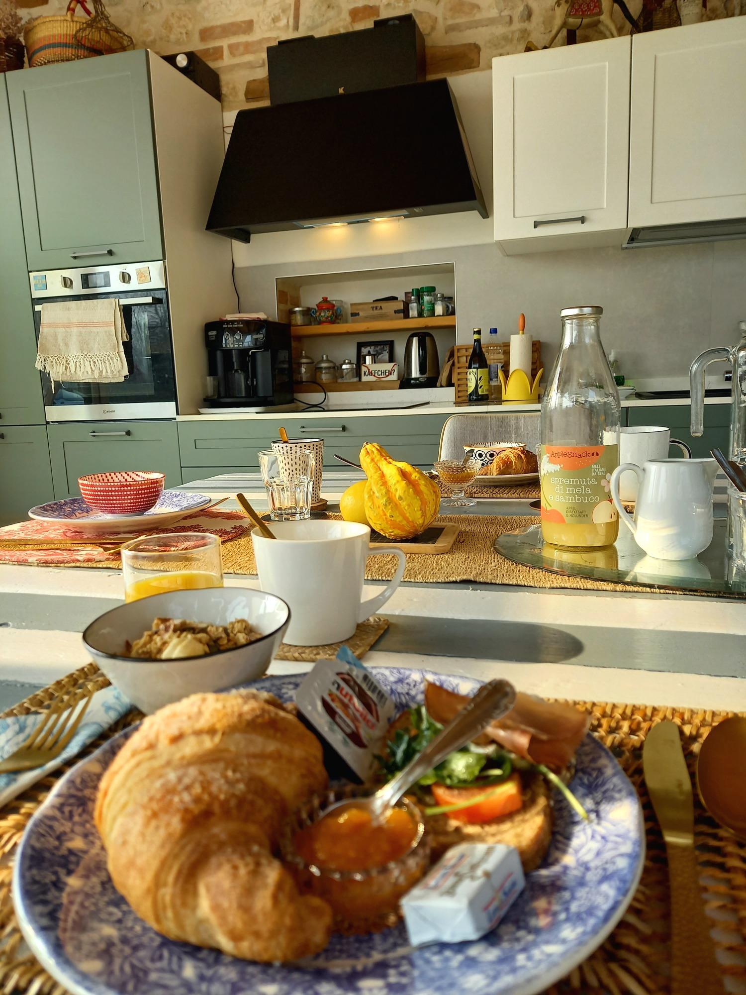 The house has been renovated with a clear vision: to create a welcoming space that is essential yet filled with warmth. The furnishings and materials chosen convey a sense of harmony, simplicity, and joy. Each morning, breakfast is served with fresh, wholesome ingredients, often sourced from the home's garden or local producers. It is prepared and presented with care: both sweet and savory options, accompanied by soft music and a thoughtfully arranged table, set in the kitchen or, during pleasant weather, outdoors.