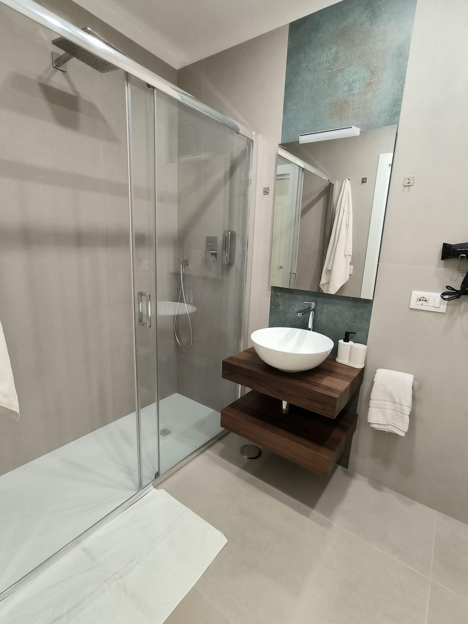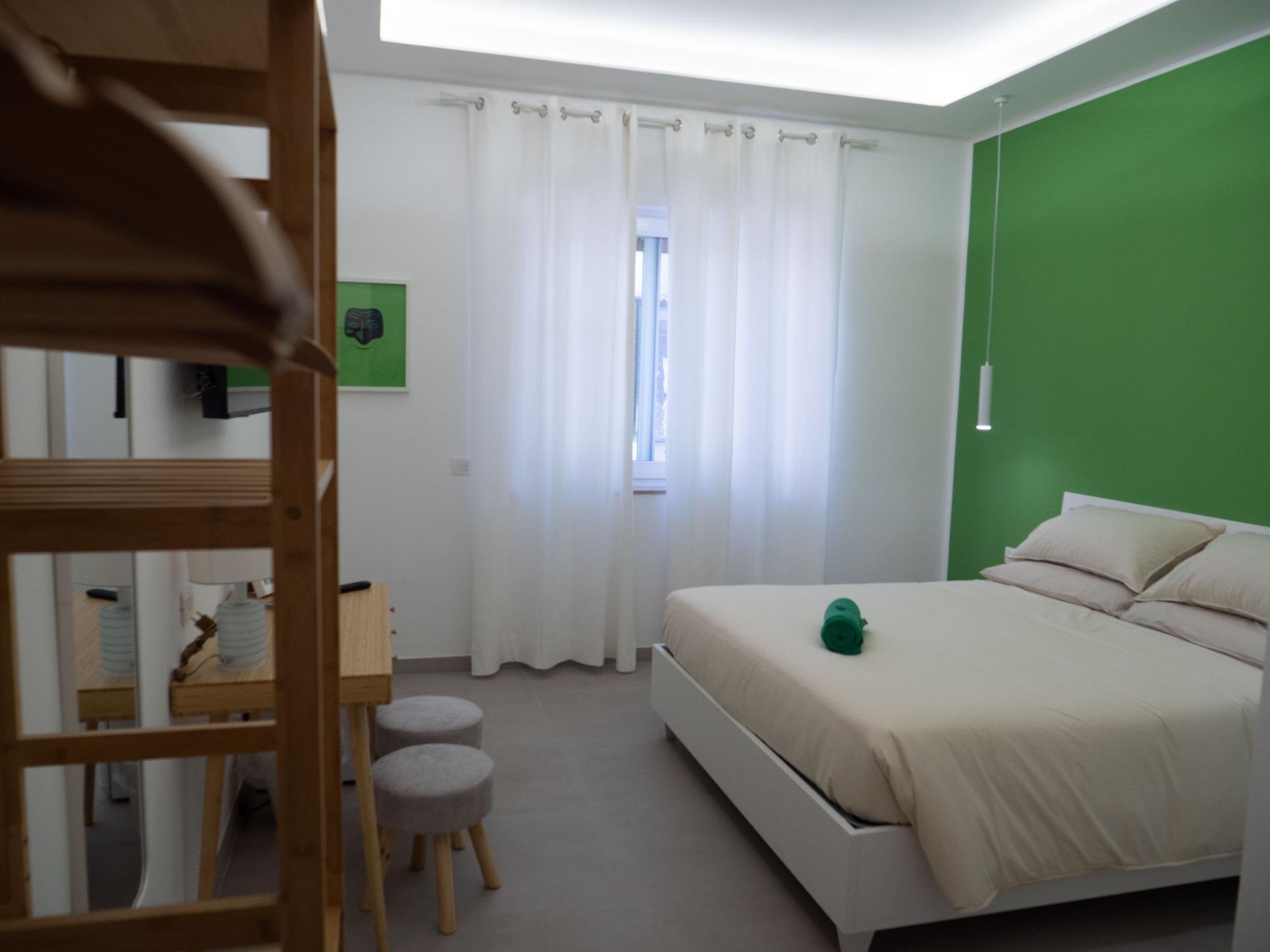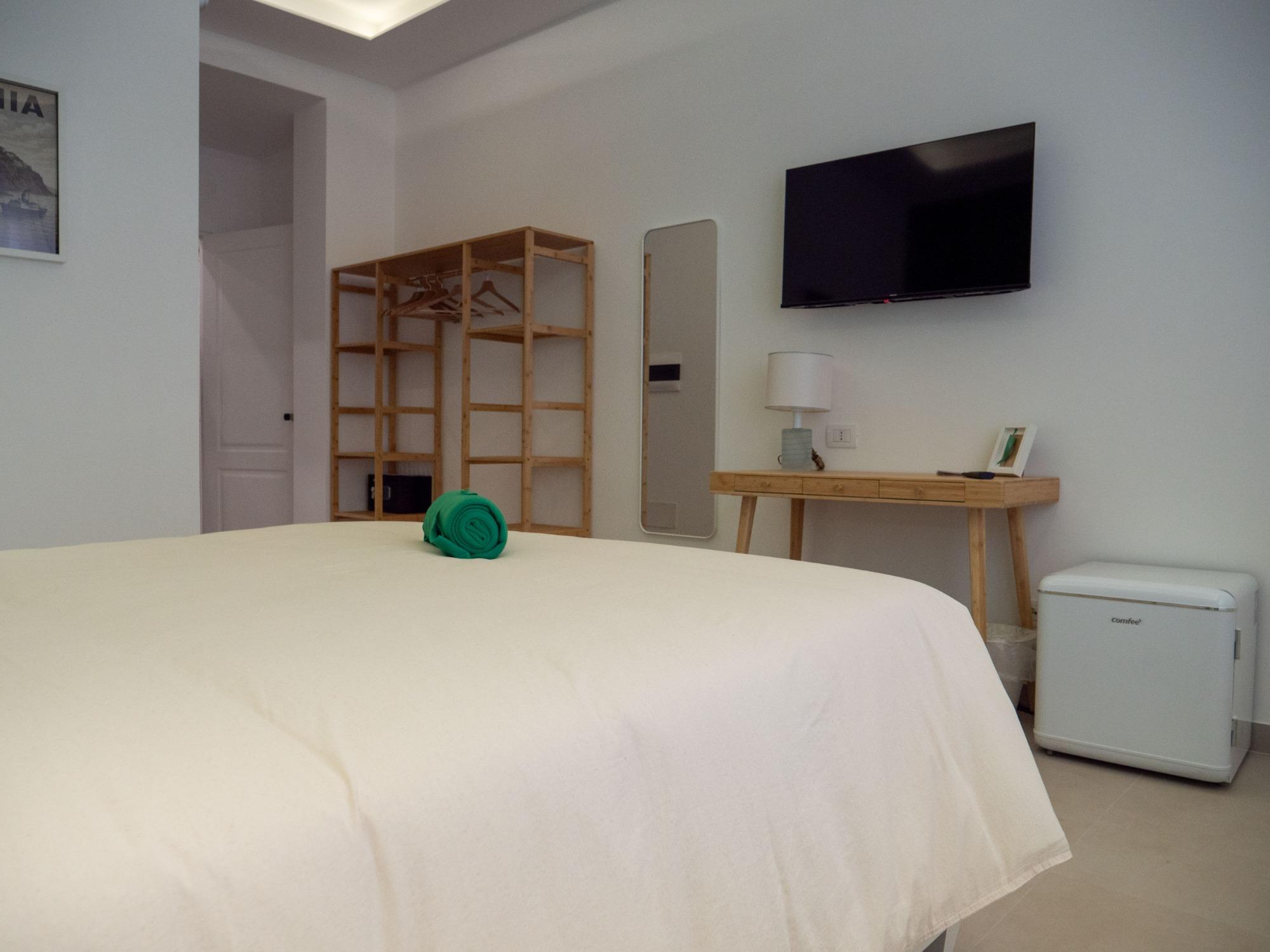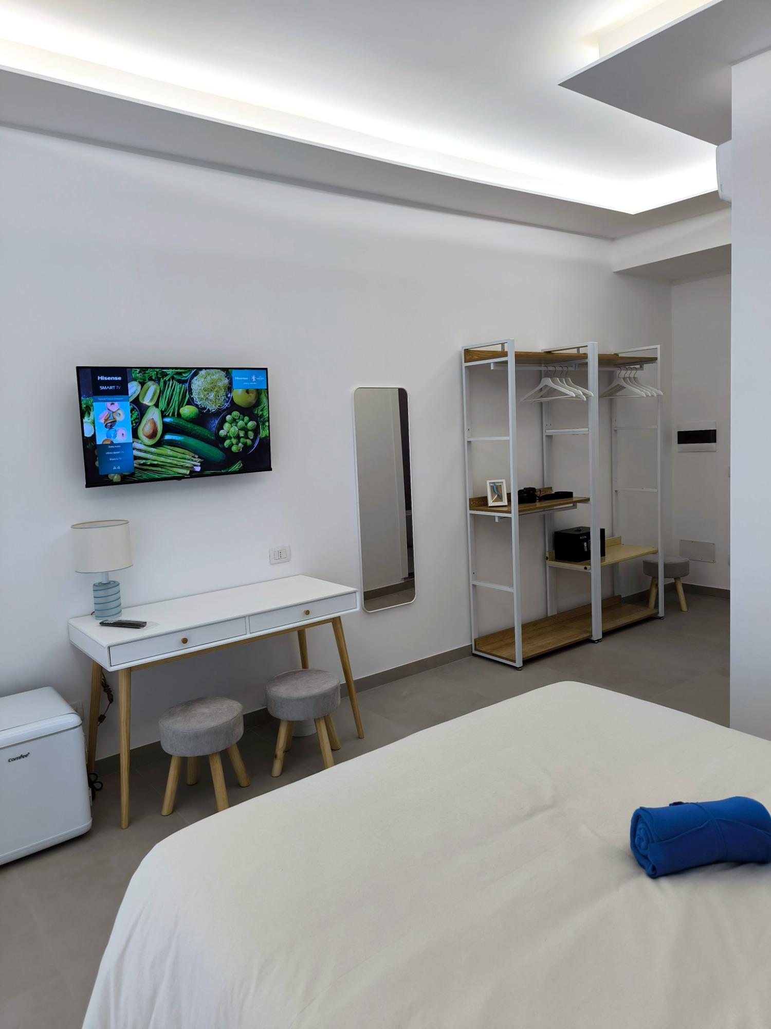 Le tre camere matrimoniali, ampie e luminose, sono arredate con gusto contemporaneo e studiate per garantire funzionalità e benessere. Ogni sistemazione dispone di aria condizionata, Smart TV, mini frigo privato, letto matrimoniale extralarge con biancheria di qualità e bagno privato spazioso, moderno e completo di tutto il necessario.