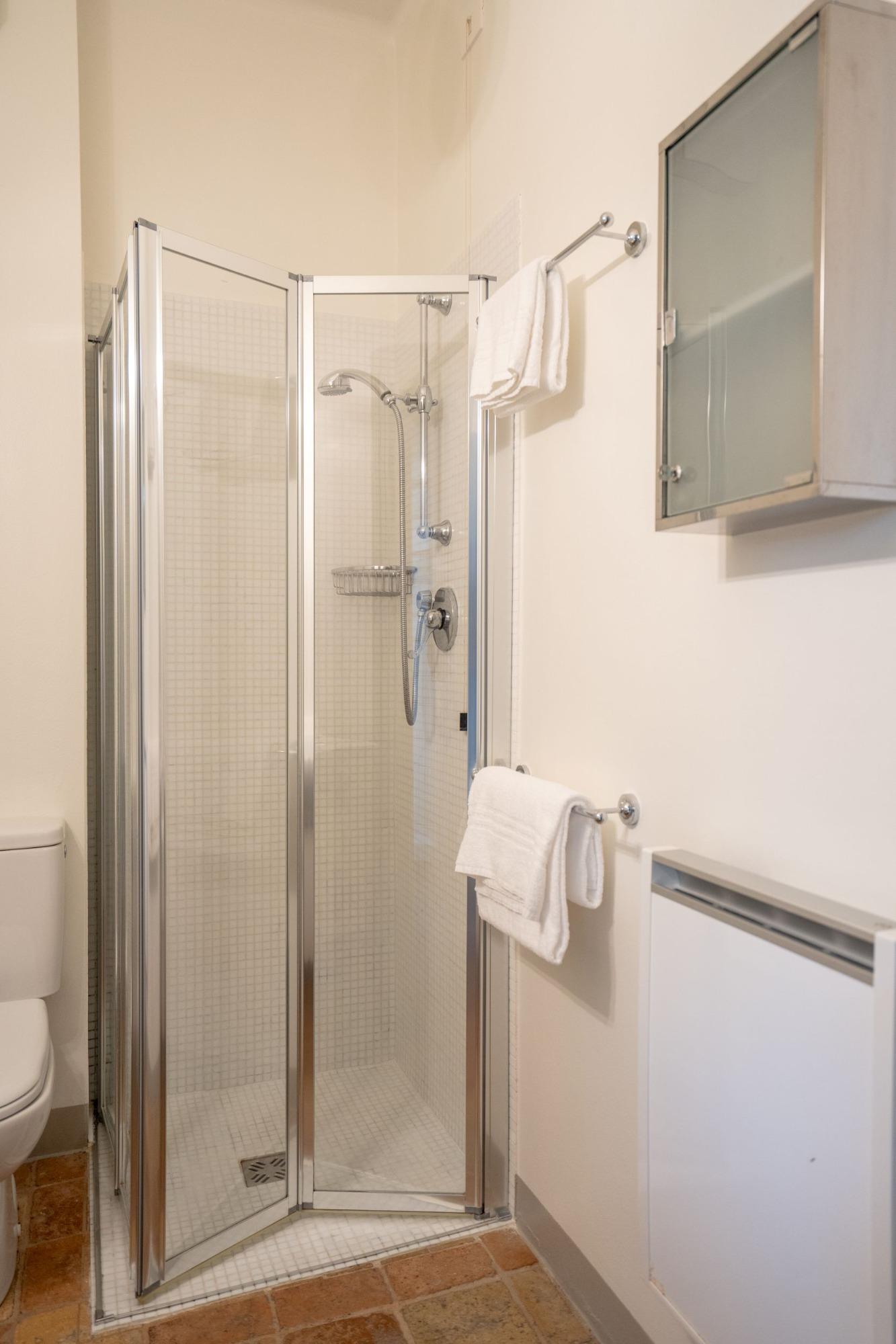 The apartment has a L-shaped character room with sitting room, TV, kitchen, large refrigerator, 4 electric hobs and a sleeping area with 2 twin beds (or 1 double bed) and bathroom with shower. The bedroom has a king size bed with en-suite bathroom with shower. It looks out onto the courtyard of the villa.