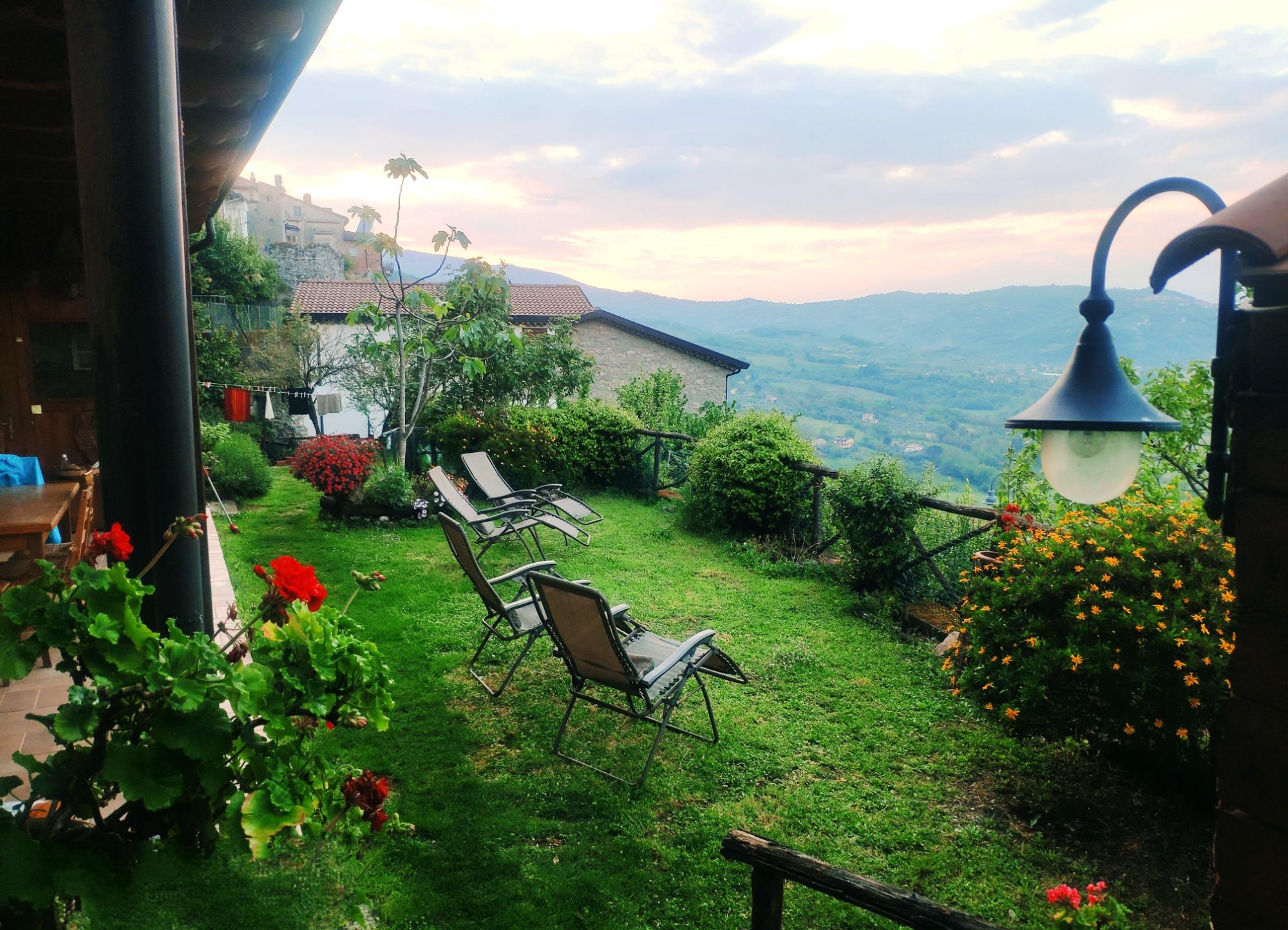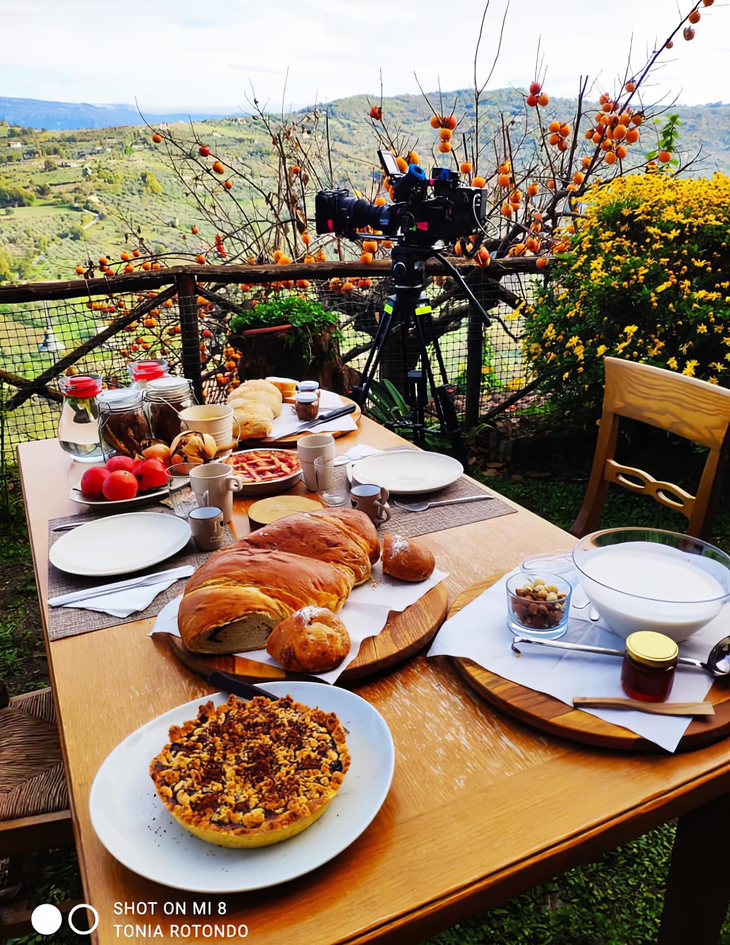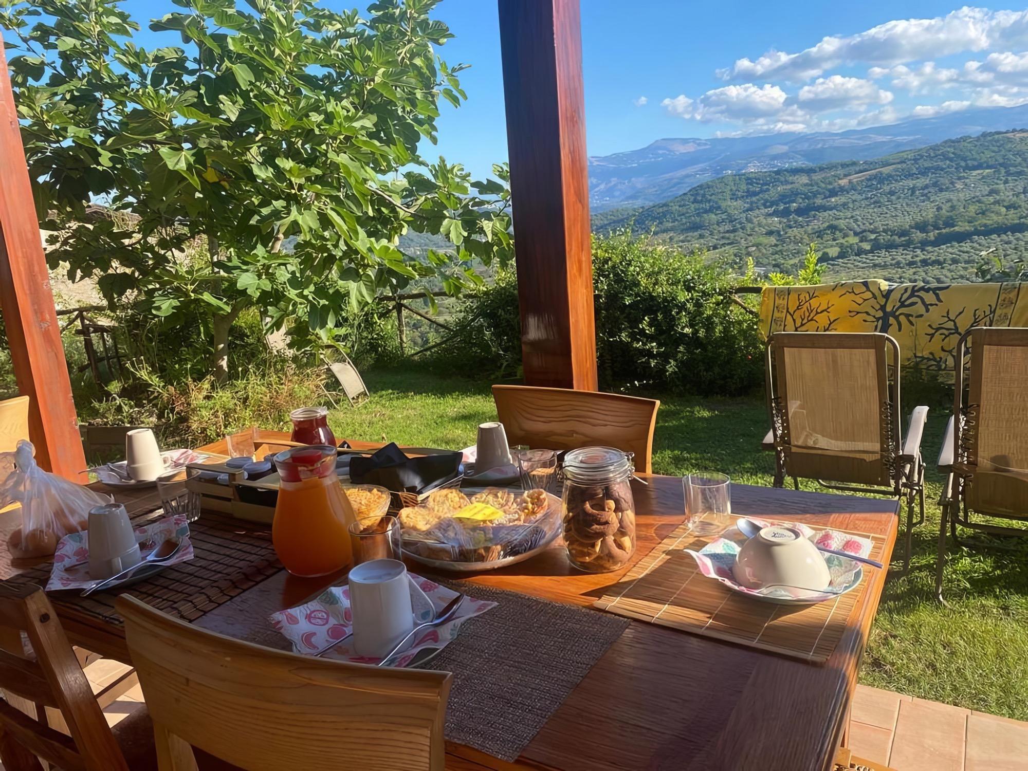 A simple and authentic breakfast featuring homemade pastries, seasonal fruits, jams, and hot beverages, to be enjoyed outdoors with a view of the mountains.