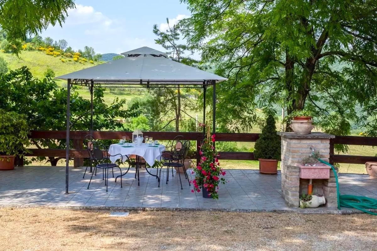 Guests will stay in three rooms with three services; an abundant breakfast with typical Umbrian products is available and included in the price, which can be enjoyed either inside the house in a large living room with a fireplace or outside in the brickyard courtyard equipped with a barbecue, tables and a gazebo.