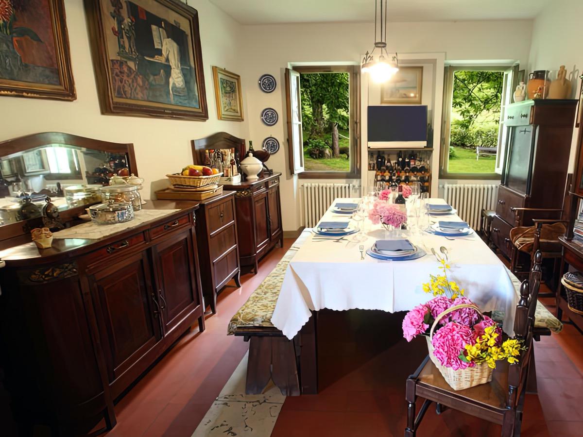 The garden surrounding the villa features a swimming pool, a ping pong table, and a foosball table, perfect for moments of relaxation or sunbathing. The villa has a characteristic breakfast room, where you can taste Tuscan specialties in a welcoming atmosphere, perhaps in front of the warmth of the fireplace during the winter months or on the terrace overlooking Monte Falterona during the summer.