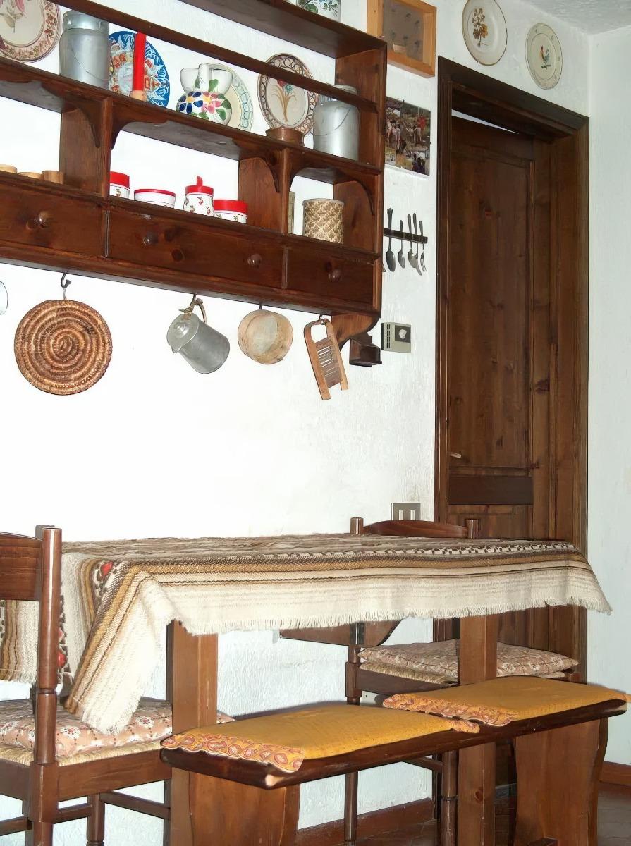 The apartment, decorated in a traditional mountain style, can comfortably accommodate up to four guests. It features a small bedroom with a bunk bed and a living room with a sofa bed, which can be arranged as two single beds or one double bed. Both rooms open onto a balcony, providing a lovely space to enjoy the views.