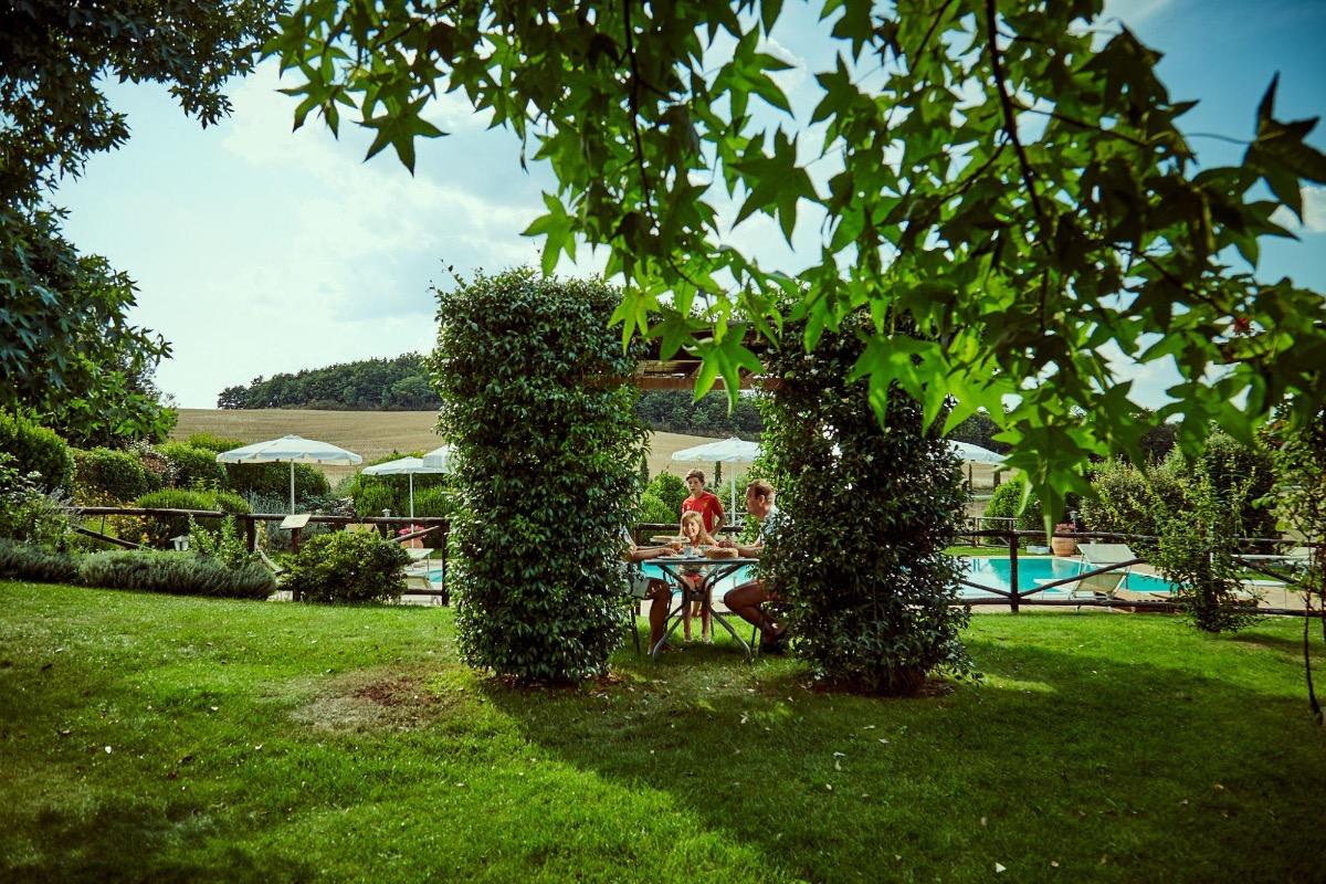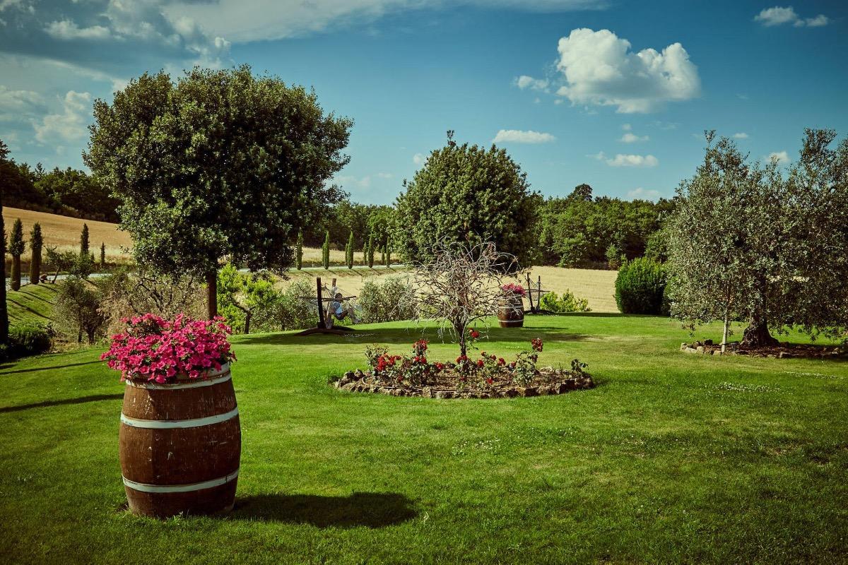 We love our land and nature, which is why we have created a green paradise for our guests in our farm. With a magnificent swimming pool and a large garden full of different blooms and plants, you will find many corners to relax. Whether it's reading a good book on the hammock under the old oak tree or on our travertine terraces, admiring the beautiful panorama in front of you, or sipping a glass of wine in the shade of a flower-covered gazebo while enjoying the magnificent valley view.