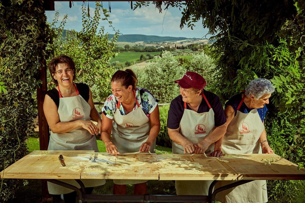 We are the team from La Bruciata, made up of Laura, Marisa, Ada, Elisa, and Emma. Five women from four generations who are here to welcome you to our agriturismo in Montepulciano, in our typical Tuscan way!