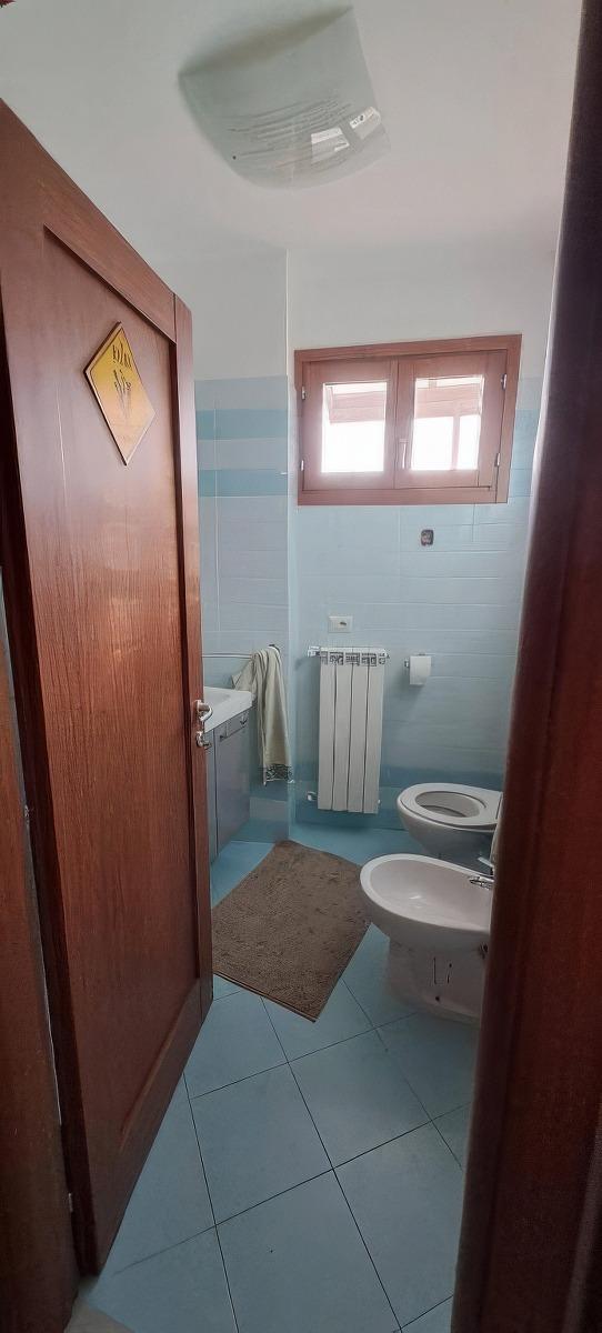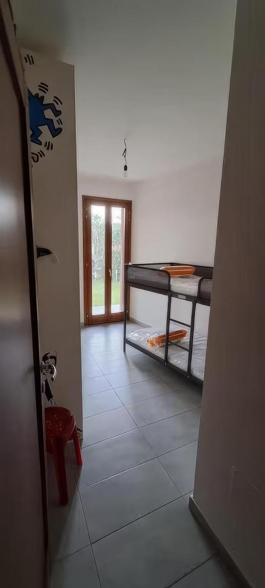 The sleeping area consists of a double bedroom and a small room with bunk beds, ideal for families or small groups. The bathroom is equipped with a shower and bidet. There is also an uncovered parking space available within the property.
