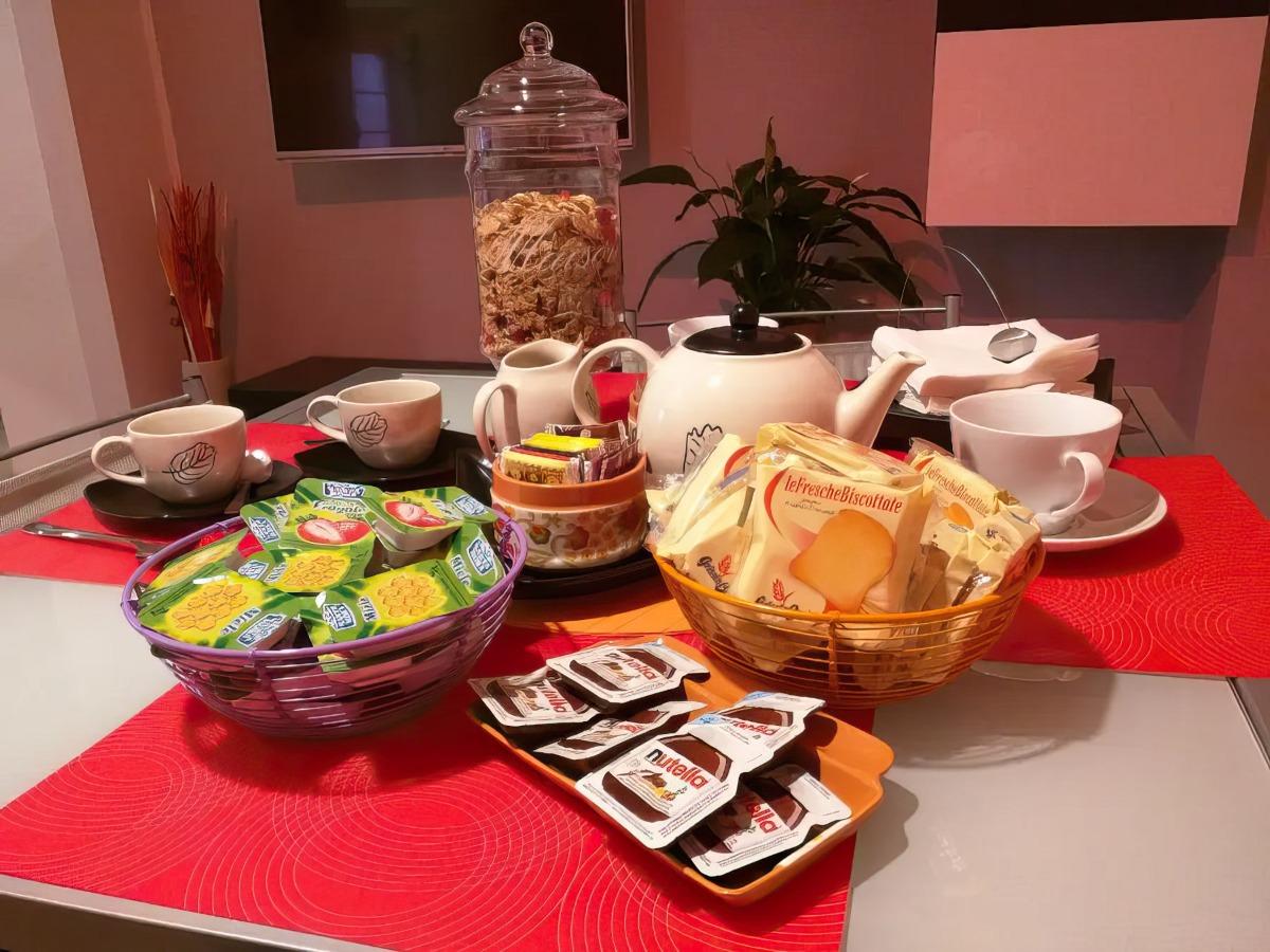 Leche, té, café, cereales, mermeladas, Nutella, miel, mantequilla, jugos de frutas y galletas.
