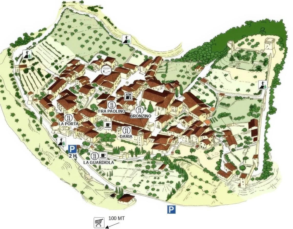 A breve distanza e facilmente raggiungibili a piedi si trovano alcuni servizi utili, tra cui un lounge bar panoramico per gustare colazioni deliziose, tre rinomati ristoranti di cucina tipica toscana, un comodo bancomat e un alimentari fornito di prodotti locali selezionati. Gli animali domestici sono benvenuti e il parcheggio gratuito è disponibile a pochi passi dalla struttura.
