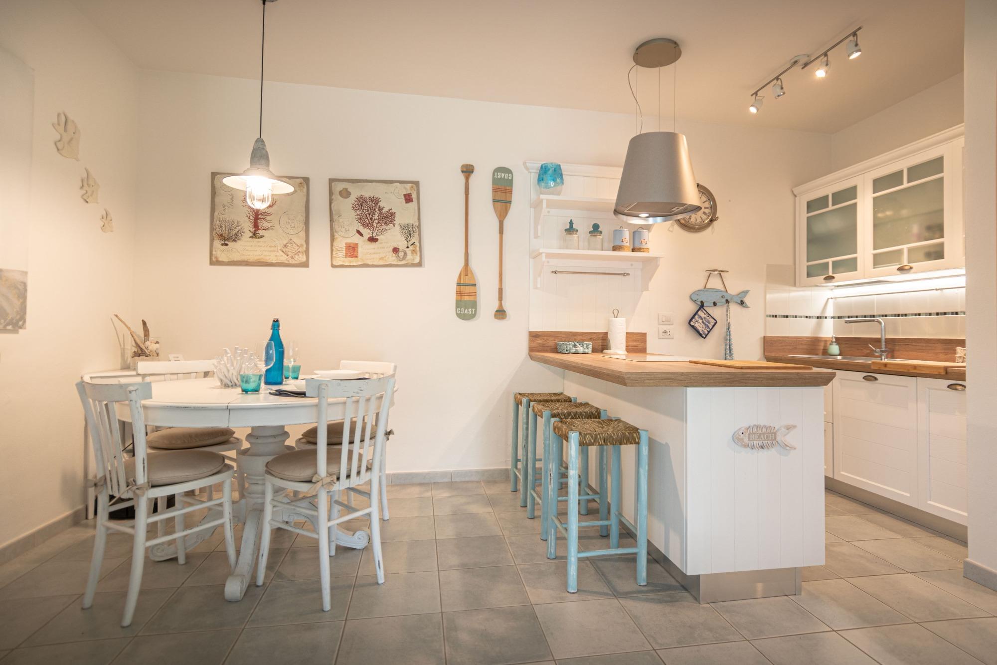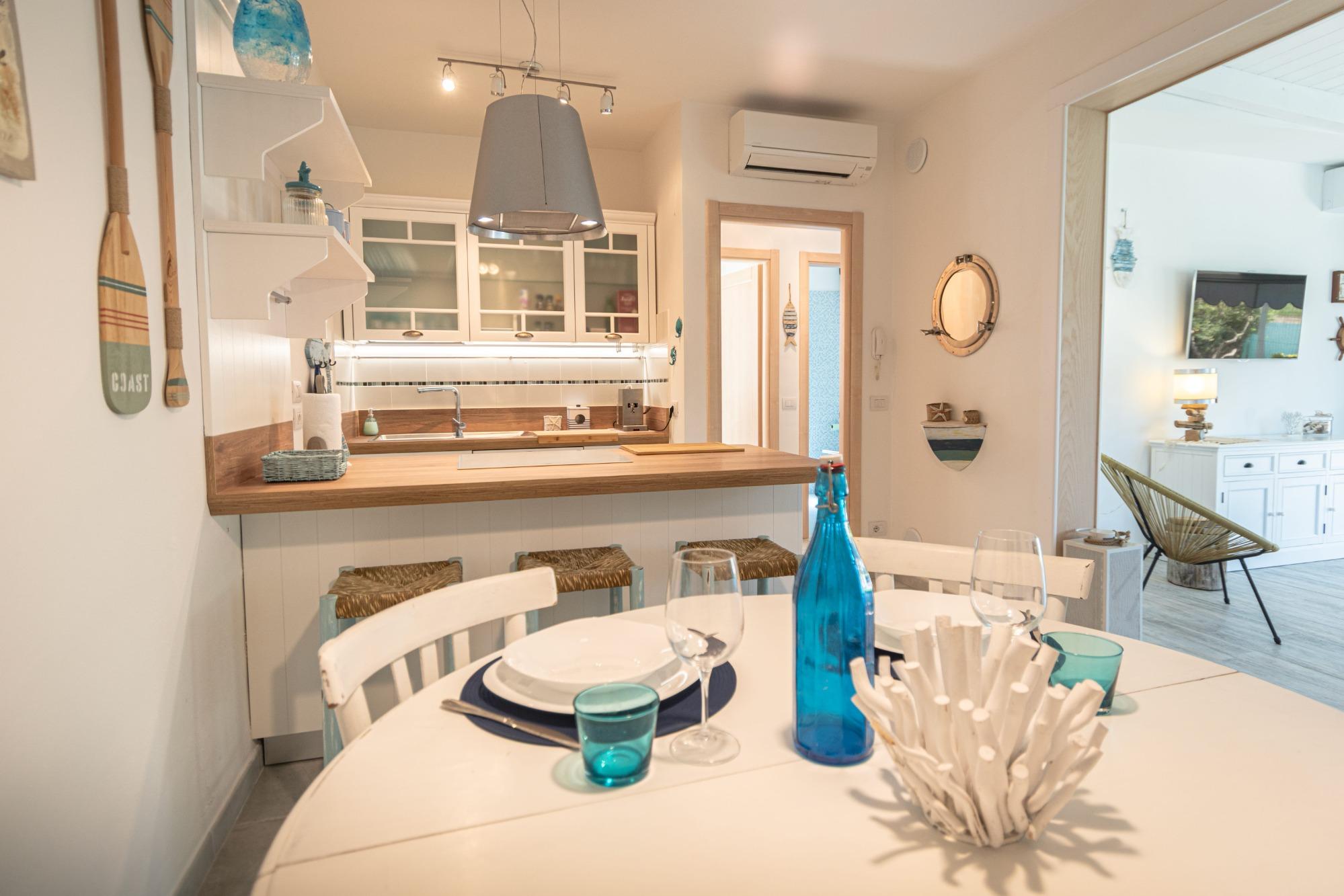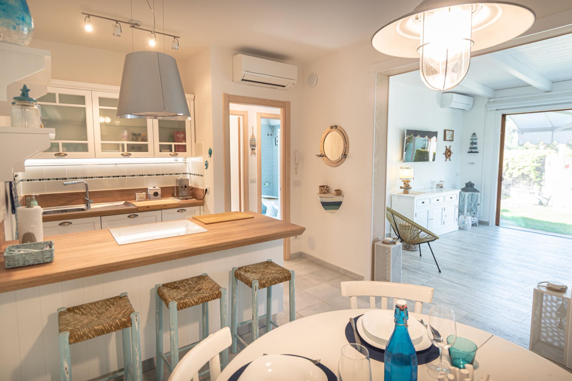 Los espacios interiores son luminosos y están bien organizados: la zona de estar incluye una sala con sofá, TV y Wi-Fi, junto a una cocina totalmente equipada. La zona de descanso cuenta con dos habitaciones, una matrimonial y una doble, con un total de cuatro camas, lo que hace que la casa sea adecuada tanto para familias como para parejas.