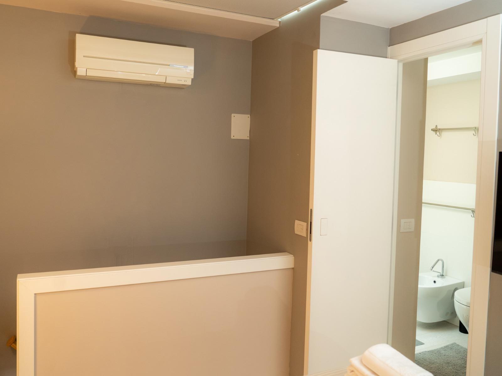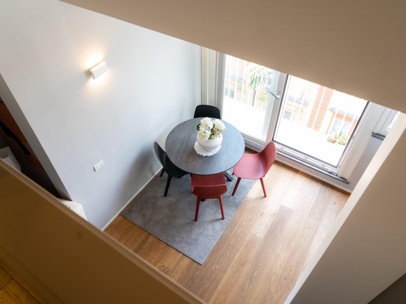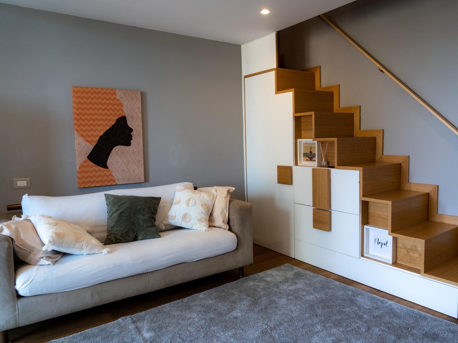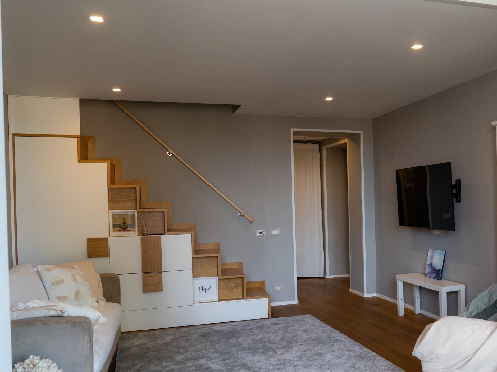 L’appartamento, situato al quinto ed ultimo piano di un edificio tranquillo con ascensore, si sviluppa su due livelli. Al piano inferiore offre un accogliente soggiorno con divano letto, cucina attrezzata, macchina del caffè, microonde, lavatrice e un primo bagno di servizio. Al piano superiore si trova la camera matrimoniale con bagno privato completo di doccia e bidet, una cabina armadio con cassaforte e ambienti curati con gusto e attenzione ai dettagli.