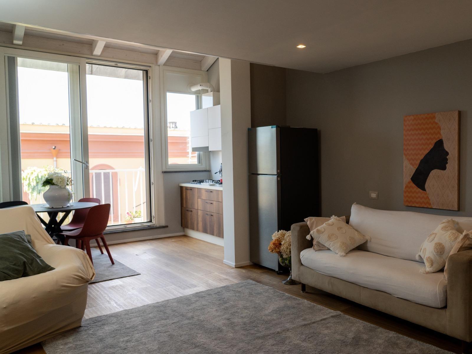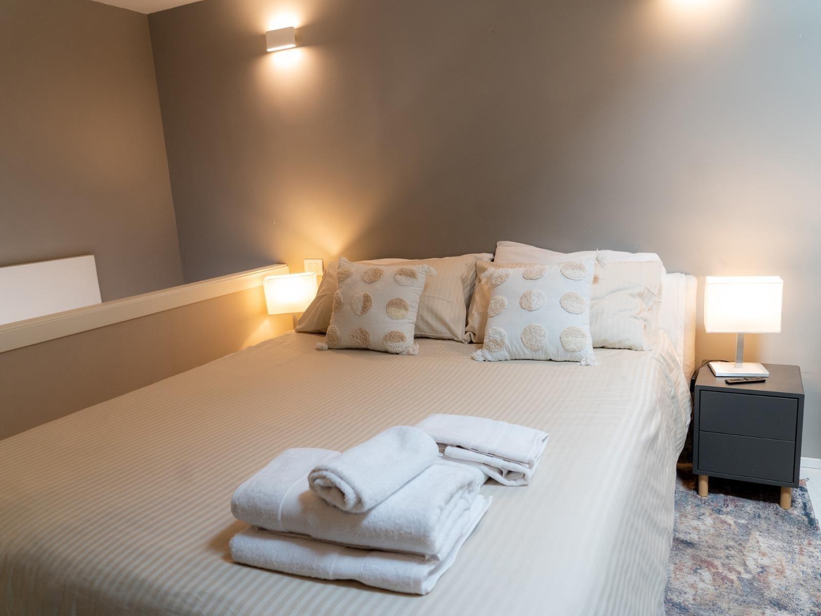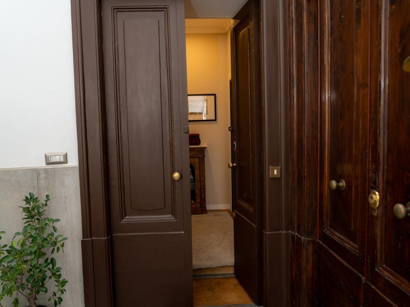 L’appartamento, situato al quinto ed ultimo piano di un edificio tranquillo con ascensore, si sviluppa su due livelli. Al piano inferiore offre un accogliente soggiorno con divano letto, cucina attrezzata, macchina del caffè, microonde, lavatrice e un primo bagno di servizio. Al piano superiore si trova la camera matrimoniale con bagno privato completo di doccia e bidet, una cabina armadio con cassaforte e ambienti curati con gusto e attenzione ai dettagli.
