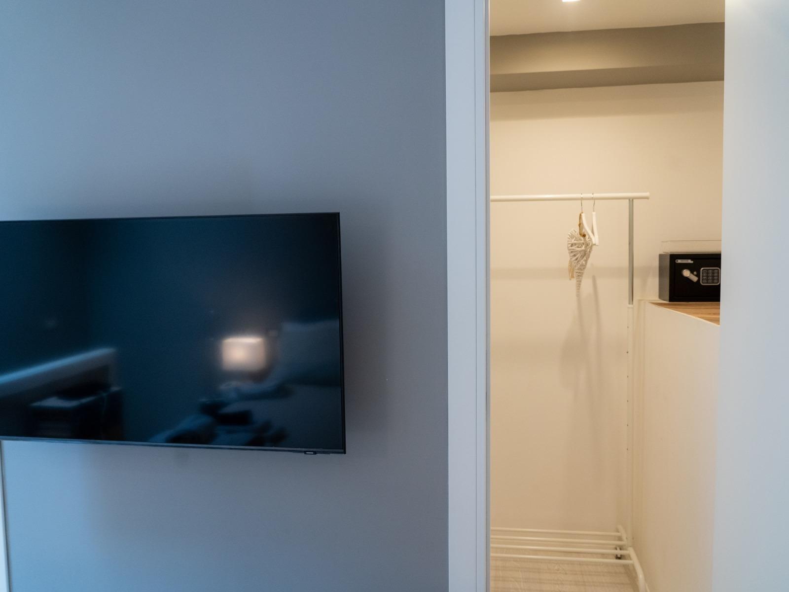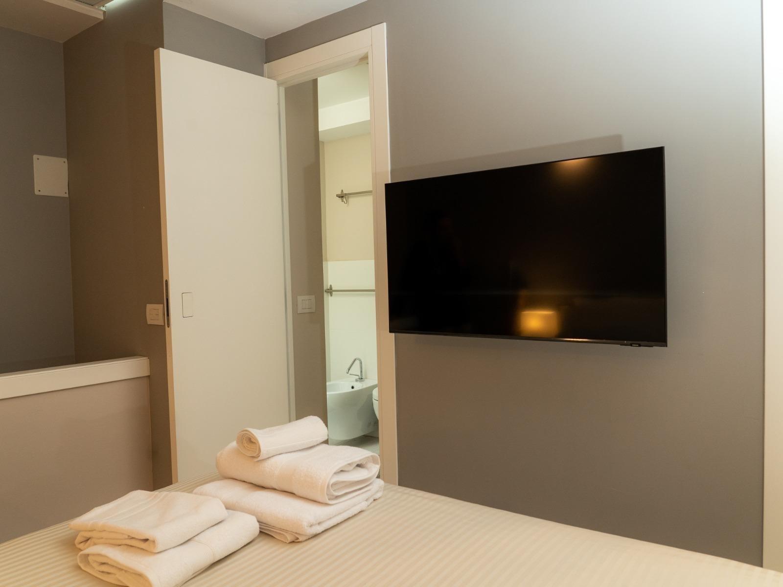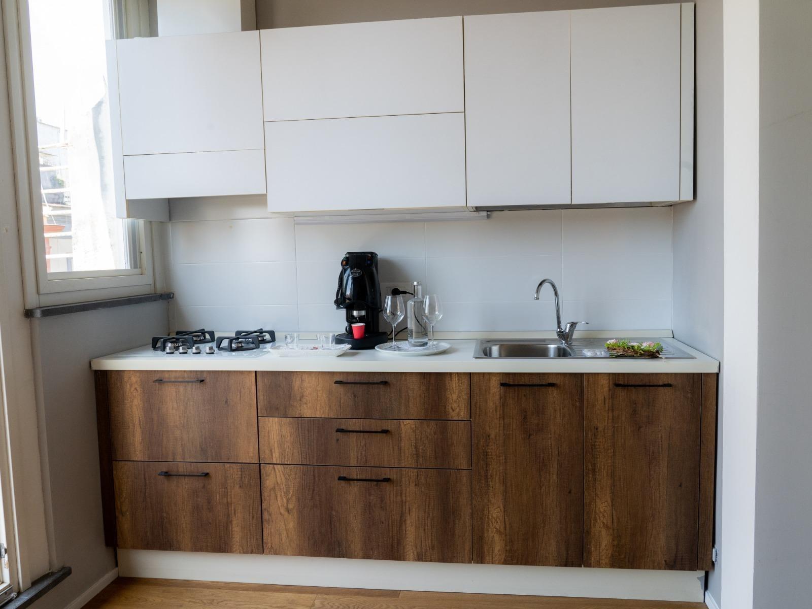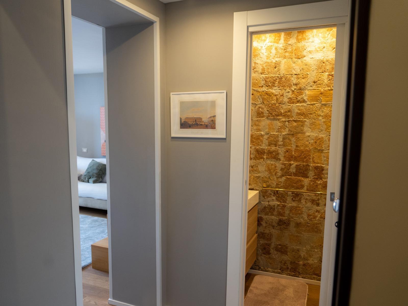 L’appartamento, situato al quinto ed ultimo piano di un edificio tranquillo con ascensore, si sviluppa su due livelli. Al piano inferiore offre un accogliente soggiorno con divano letto, cucina attrezzata, macchina del caffè, microonde, lavatrice e un primo bagno di servizio. Al piano superiore si trova la camera matrimoniale con bagno privato completo di doccia e bidet, una cabina armadio con cassaforte e ambienti curati con gusto e attenzione ai dettagli.
