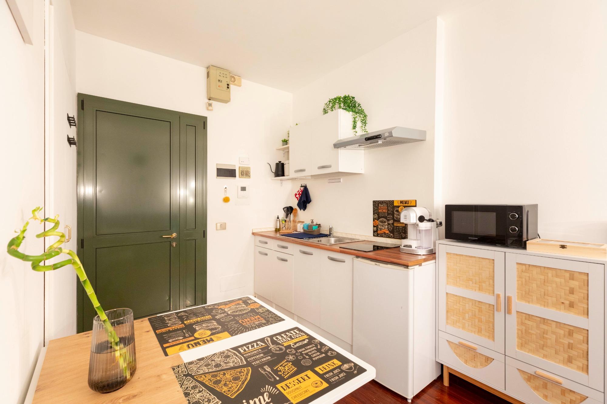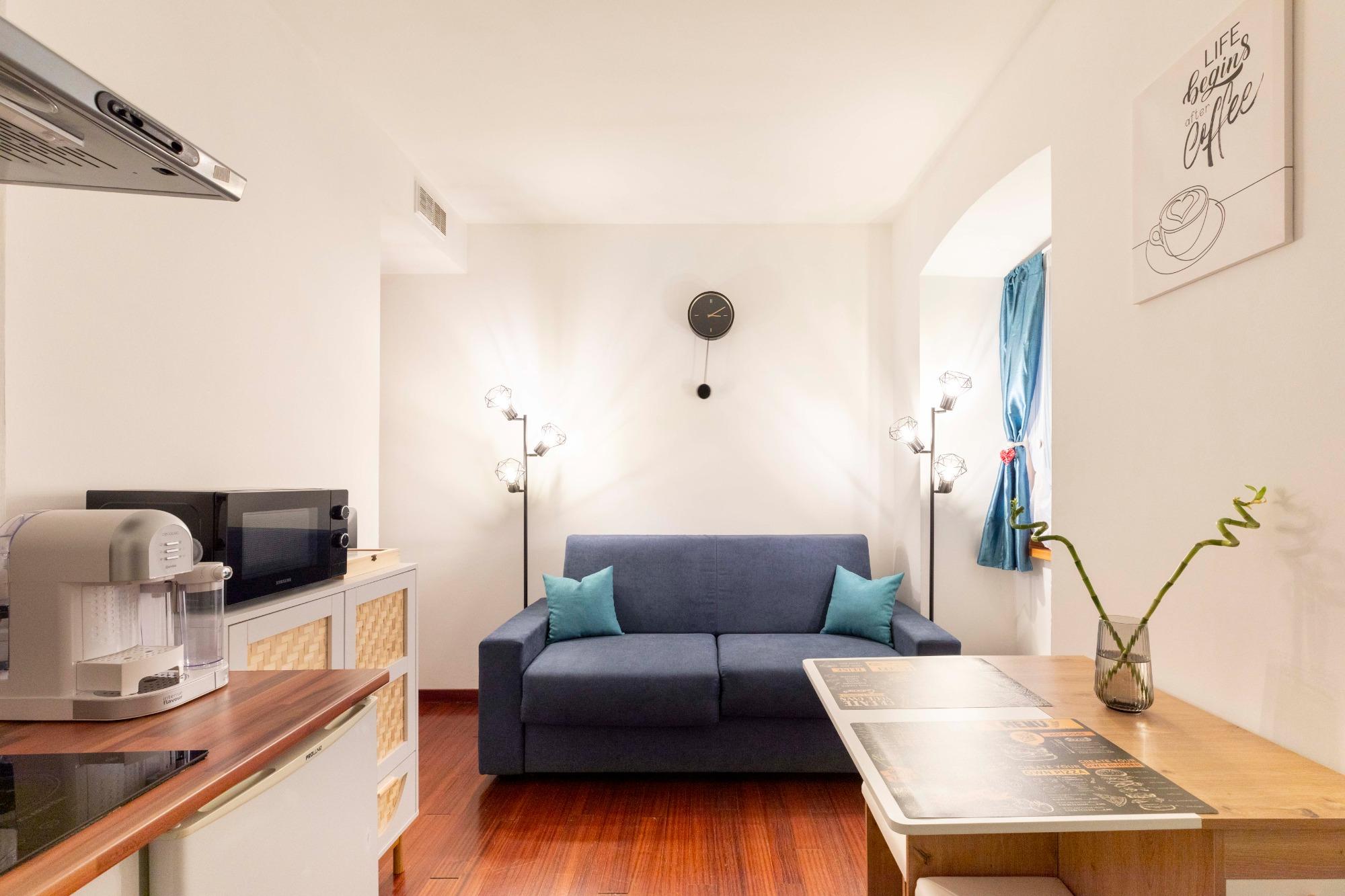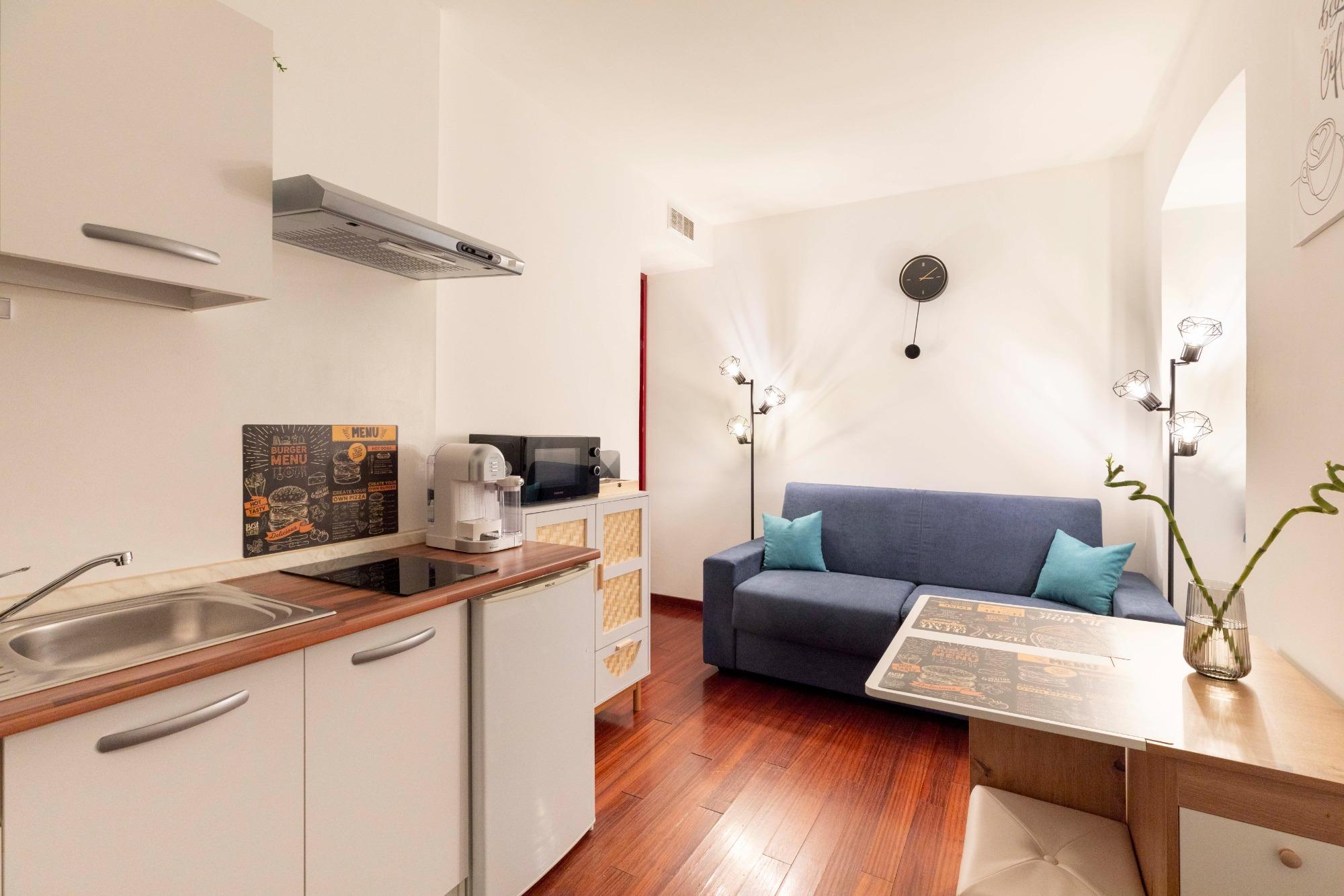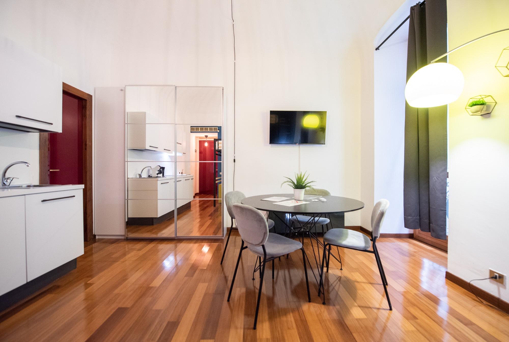 Beim Betreten eröffnet sich der Wohnbereich, in dem eine voll ausgestattete Küche mit Induktionskochfeld, Wasserkocher, Kaffeemaschine, Toaster und Espressokocher es ermöglicht, Mahlzeiten und Frühstück in völliger Selbstständigkeit zuzubereiten. Das Wohnzimmer ist mit einem bequemen Schlafsofa und einem Esstisch möbliert, ideal zum Entspannen nach einem Tag voller Museen, Plätze und Cafés in Turin.