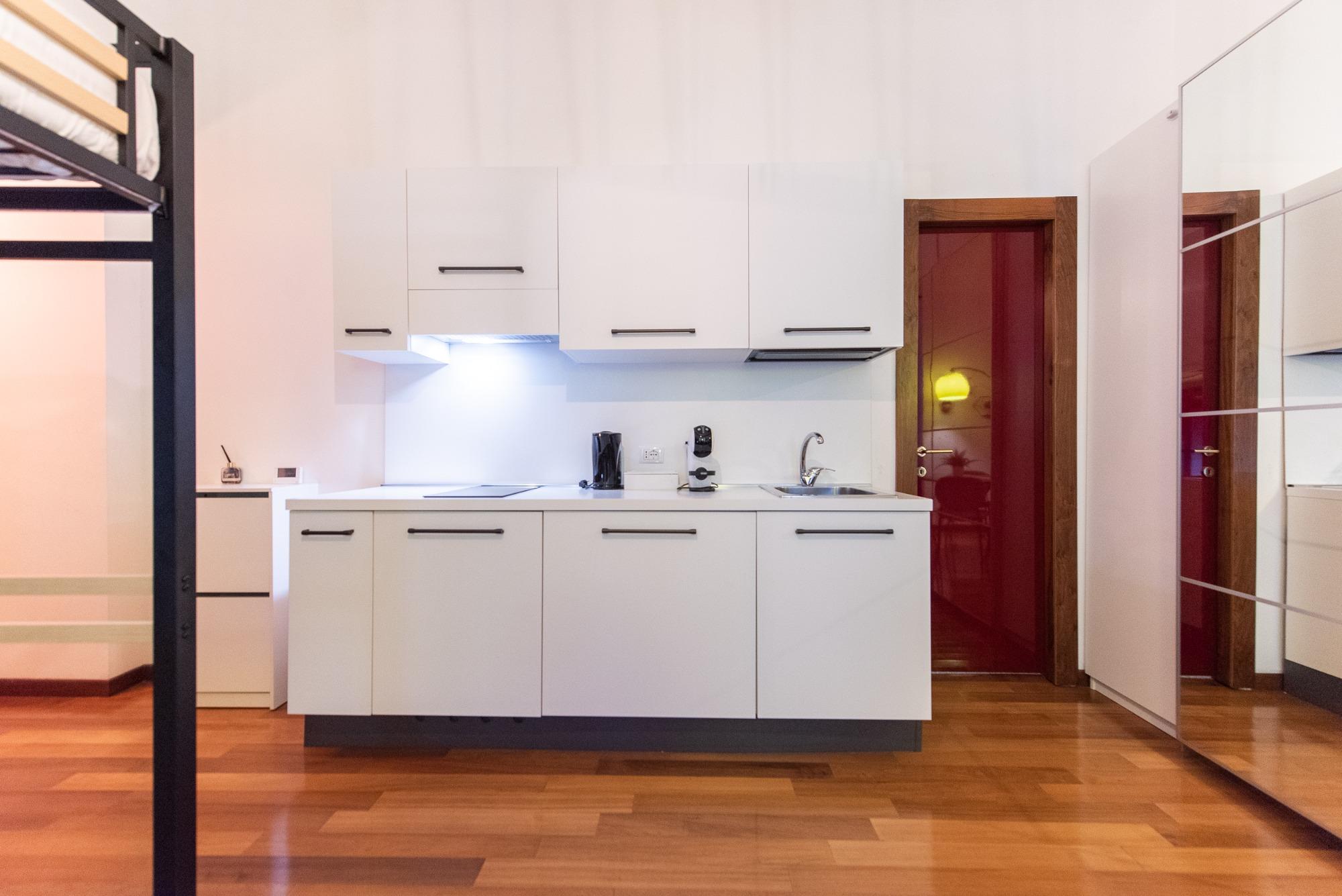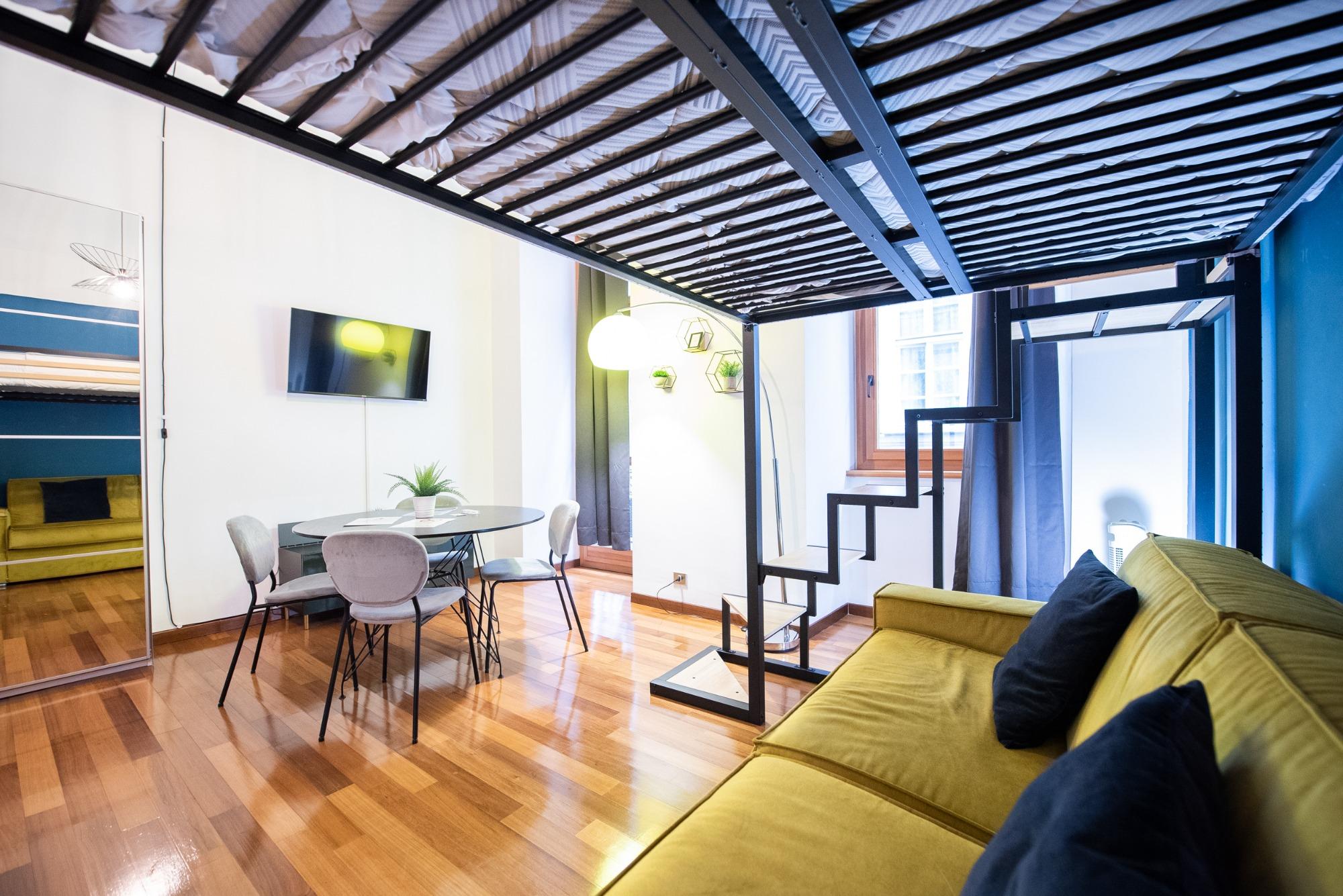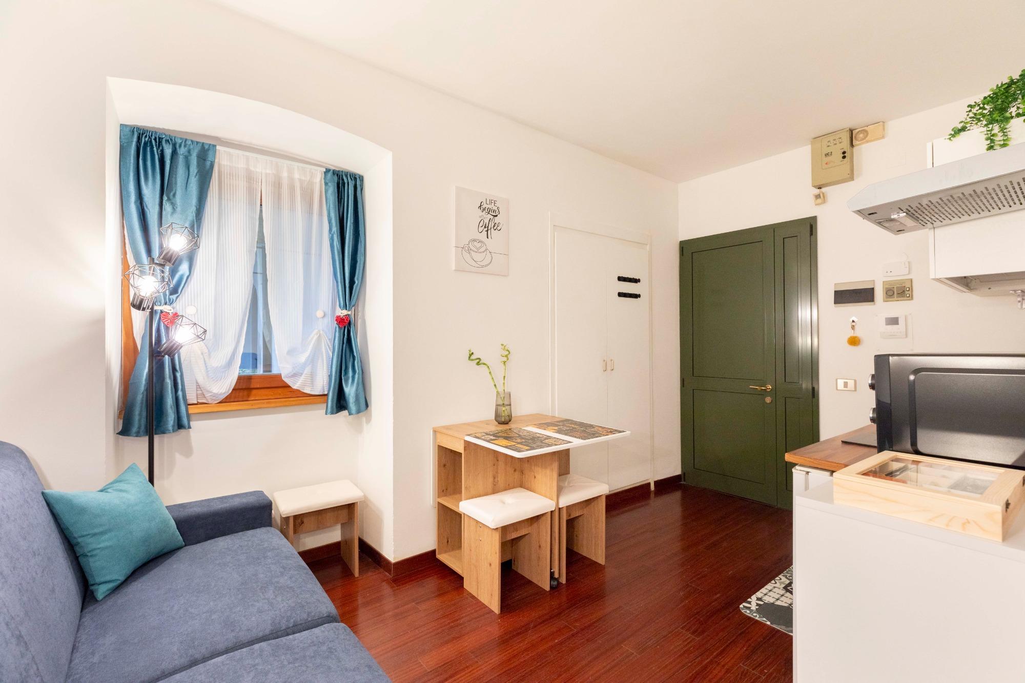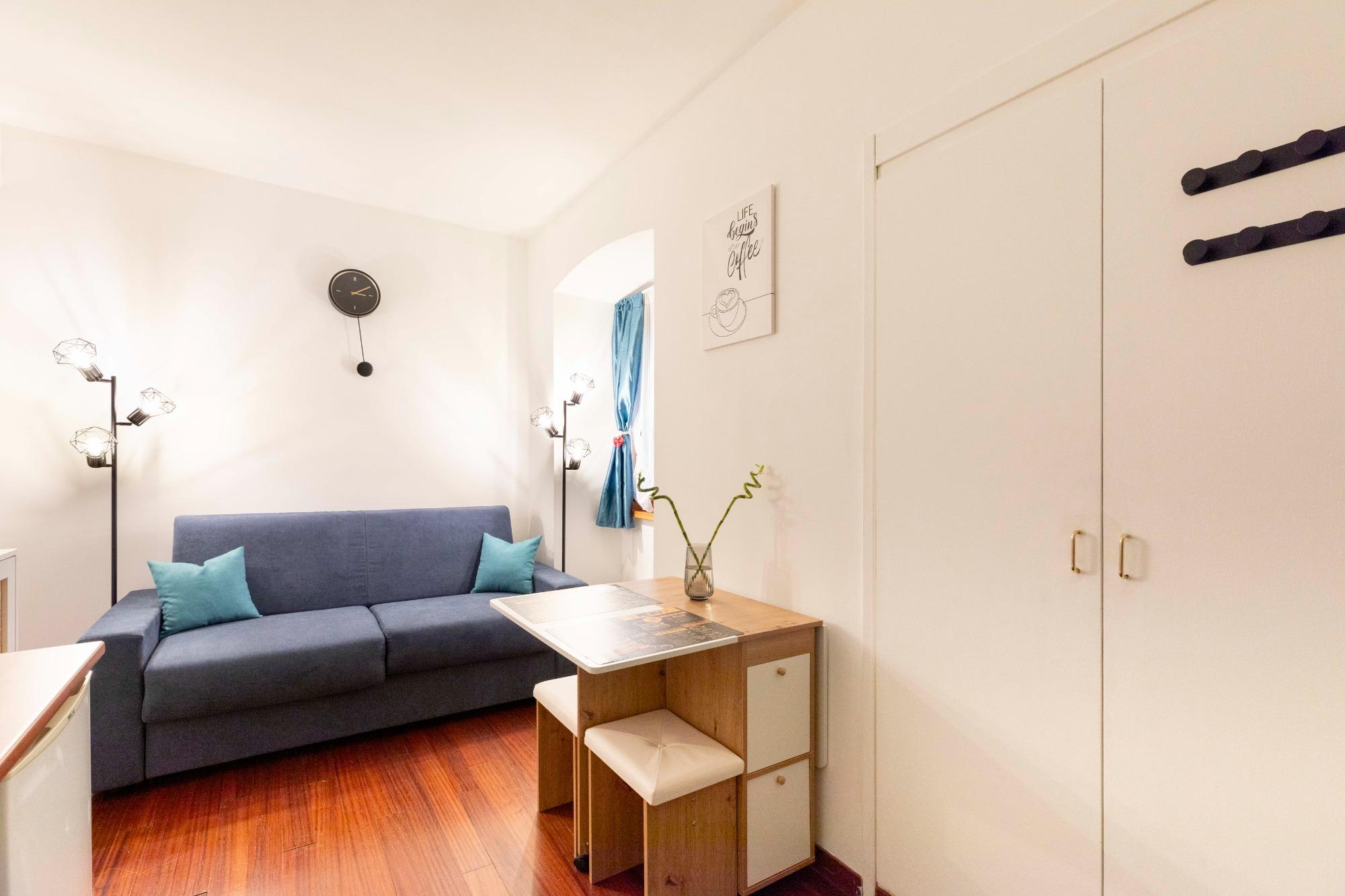 Beim Betreten eröffnet sich der Wohnbereich, in dem eine voll ausgestattete Küche mit Induktionskochfeld, Wasserkocher, Kaffeemaschine, Toaster und Espressokocher es ermöglicht, Mahlzeiten und Frühstück in völliger Selbstständigkeit zuzubereiten. Das Wohnzimmer ist mit einem bequemen Schlafsofa und einem Esstisch möbliert, ideal zum Entspannen nach einem Tag voller Museen, Plätze und Cafés in Turin.