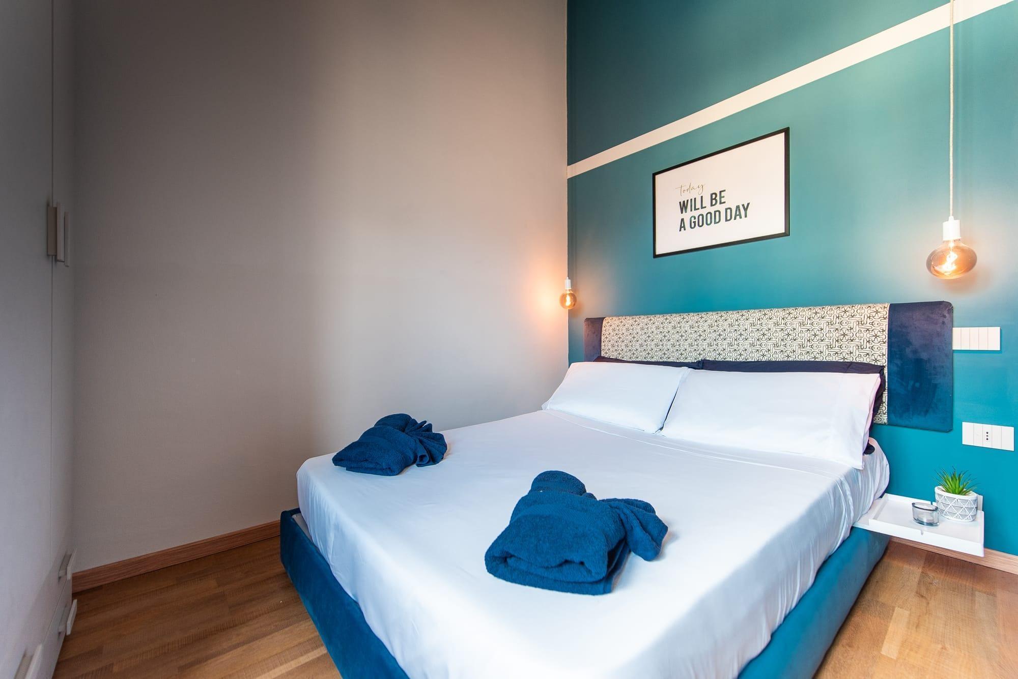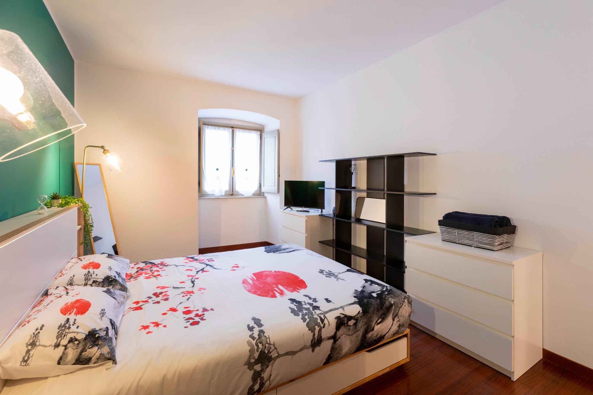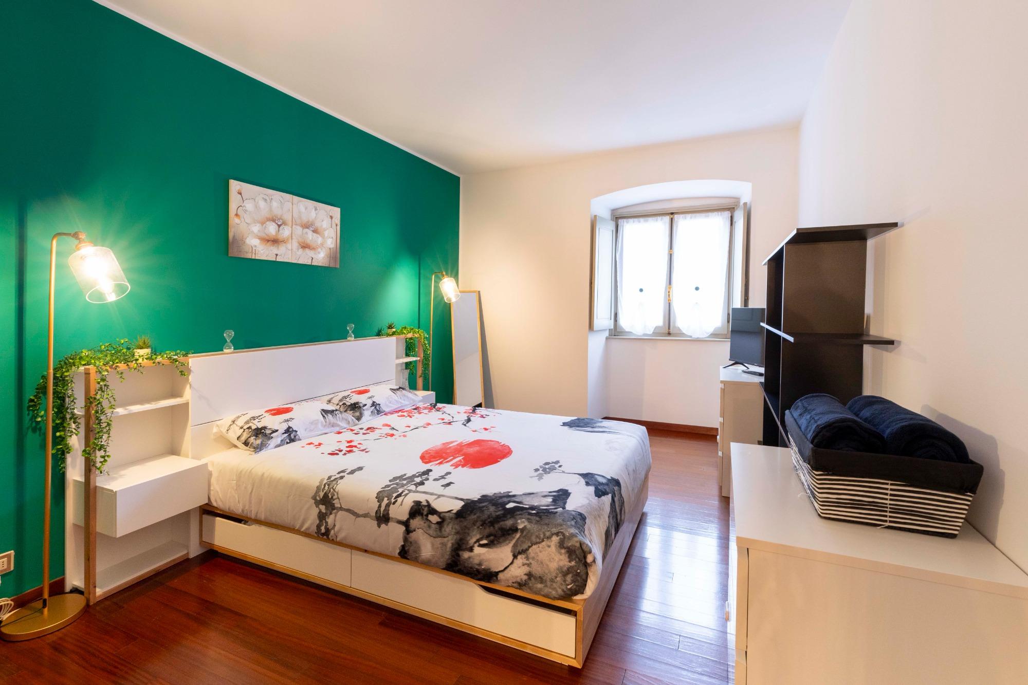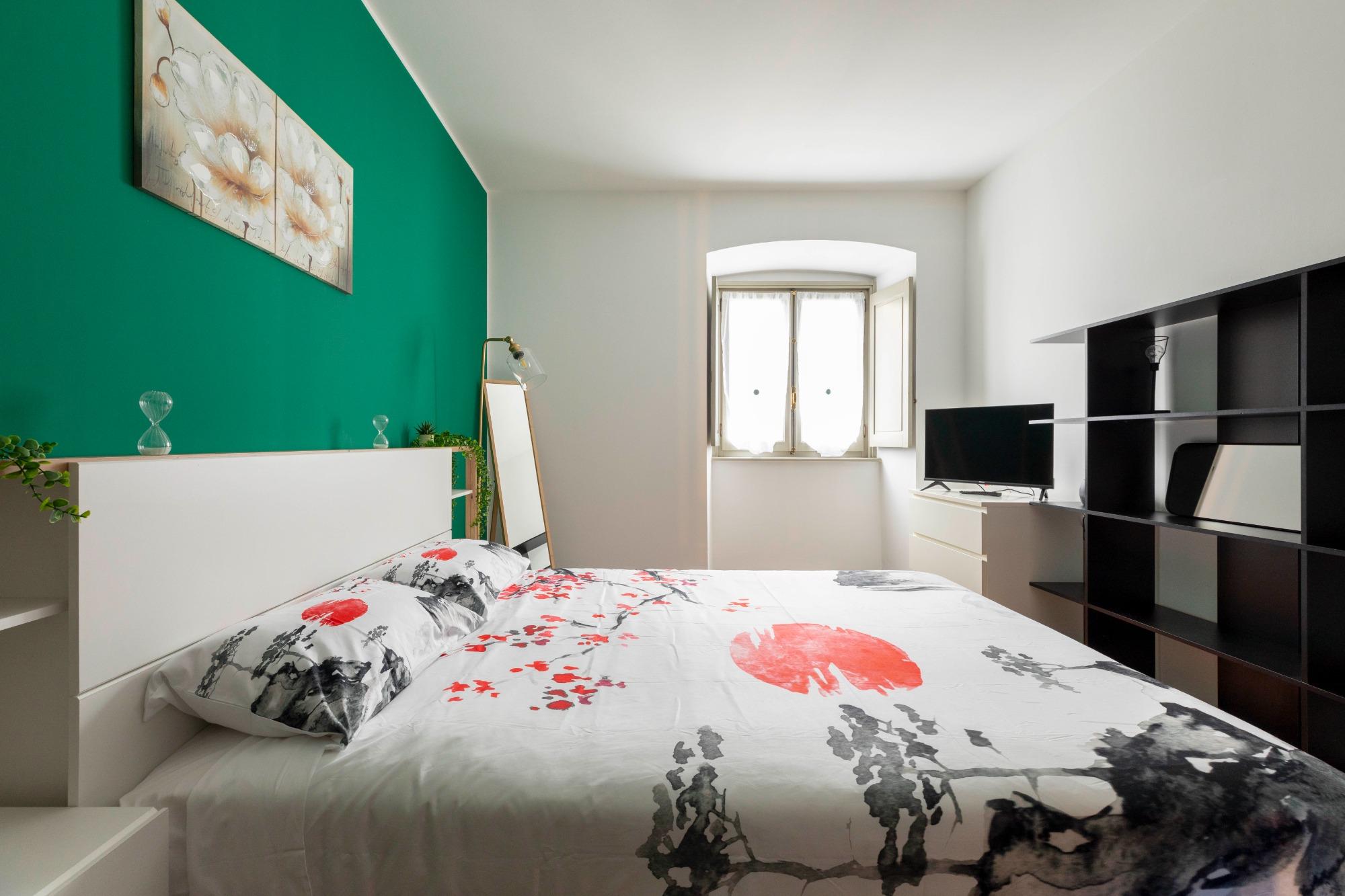 Das Schlafzimmer bietet eine intime und einladende Atmosphäre, bereichert durch ein Fenster mit Blick auf die Via Garibaldi. Das große und bequeme Bett wird von einem Smart-TV begleitet, der Zugang zu Streaming-Plattformen für angenehme Abende in völliger Entspannung bietet.
