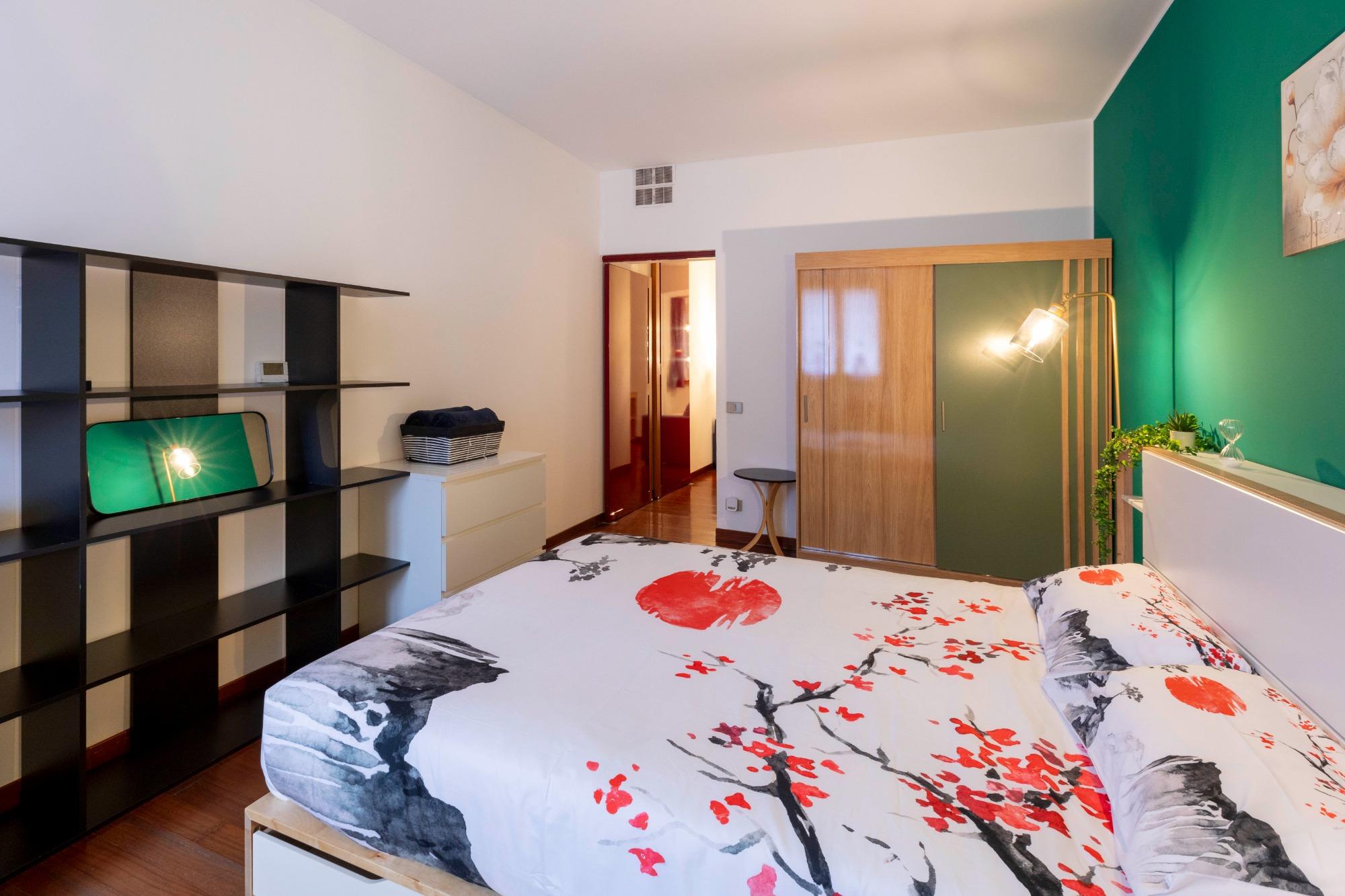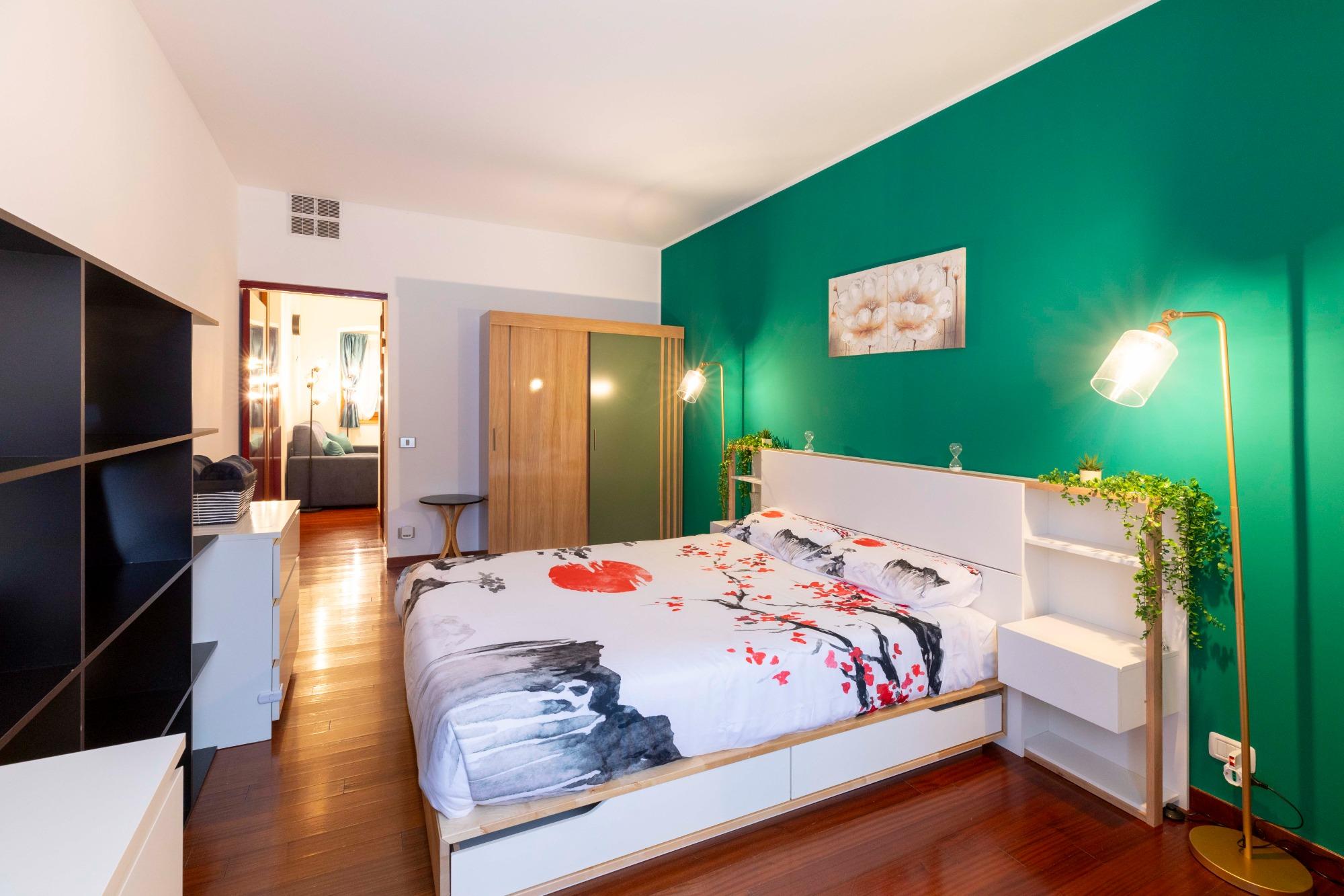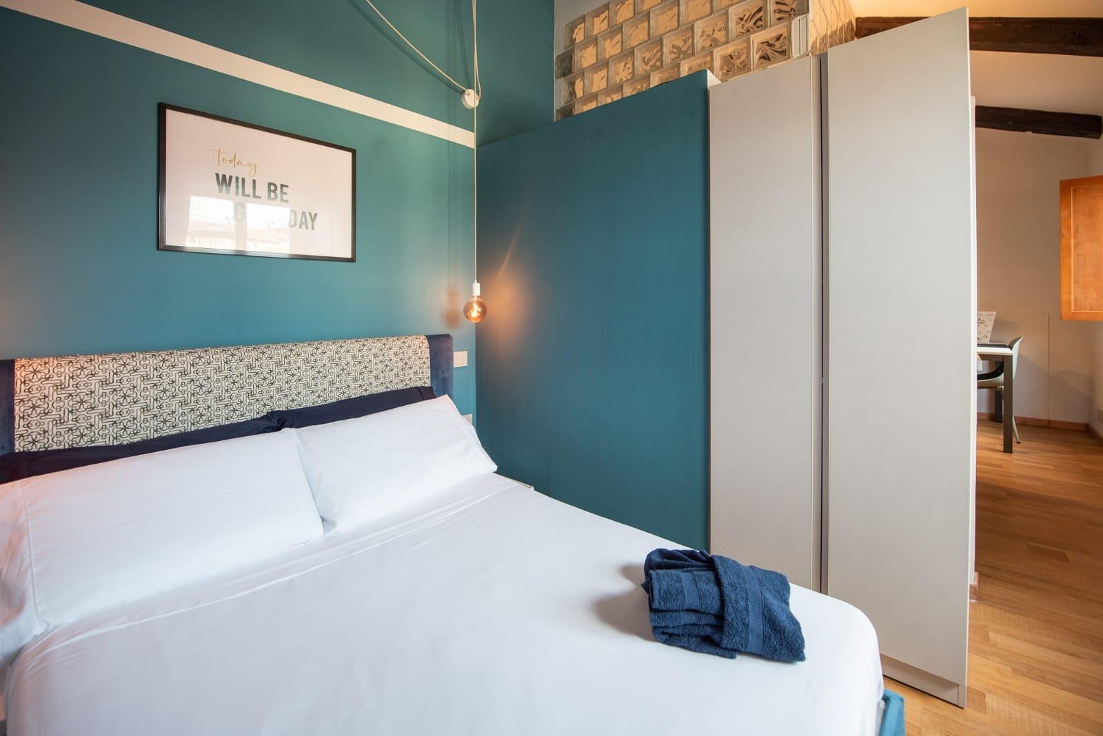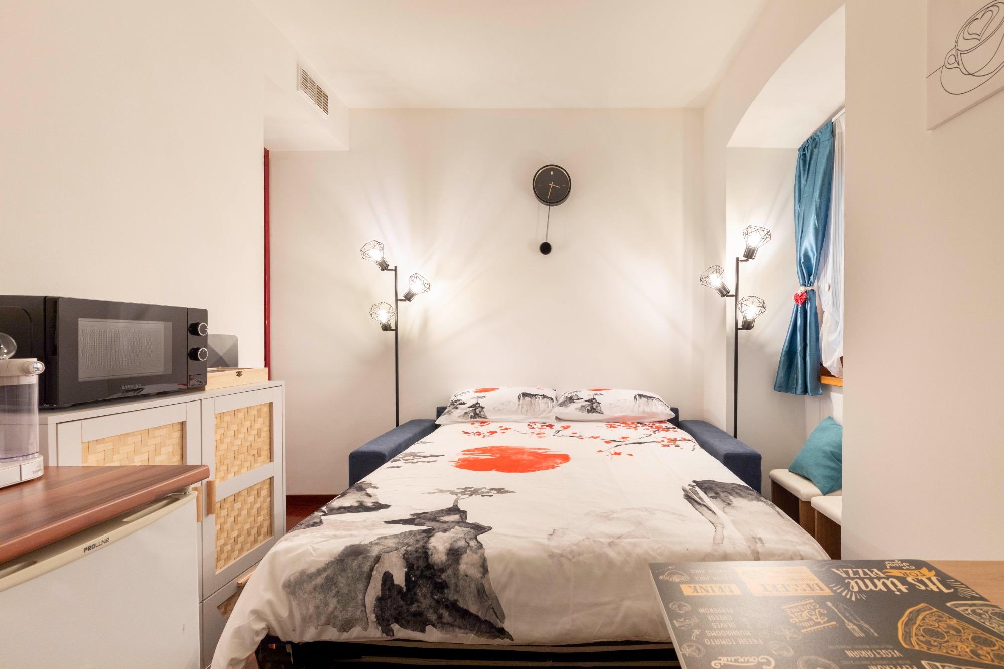 Das Schlafzimmer bietet eine intime und einladende Atmosphäre, bereichert durch ein Fenster mit Blick auf die Via Garibaldi. Das große und bequeme Bett wird von einem Smart-TV begleitet, der Zugang zu Streaming-Plattformen für angenehme Abende in völliger Entspannung bietet.